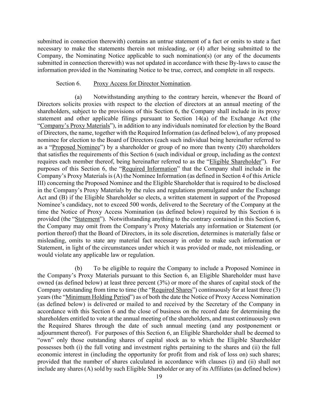 19 submitted in connection therewith) contains an untrue statement of a fact or omits to state a fact necessary to make the statements therein not misleading, or (4) after being submitted to the Company, the Nominating Notice applicable to such nomination(s) (or any of the documents submitted in connection therewith) was not updated in accordance with these By-laws to cause the information provided in the Nominating Notice to be true, correct, and complete in all respects. Section 6. Proxy Access for Director Nomination. Notwithstanding anything to the contrary herein, whenever the Board of Directors solicits proxies with respect to the election of directors at an annual meeting of the shareholders, subject to the provisions of this Section 6, the Company shall include in its proxy statement and other applicable filings pursuant to Section 14(a) of the Exchange Act (the “Company’s Proxy Materials”), in addition to any individuals nominated for election by the Board of Directors, the name, together with the Required Information (as defined below), of any proposed nominee for election to the Board of Directors (each such individual being hereinafter referred to as a “Proposed Nominee”) by a shareholder or group of no more than twenty (20) shareholders that satisfies the requirements of this Section 6 (such individual or group, including as the context requires each member thereof, being hereinafter referred to as the “Eligible Shareholder”). For purposes of this Section 6, the “Required Information” that the Company shall include in the Company’s Proxy Materials is (A) the Nominee Information (as defined in Section 4 of this Article III) concerning the Proposed Nominee and the Eligible Shareholder that is required to be disclosed in the Company’s Proxy Materials by the rules and regulations promulgated under the Exchange Act and (B) if the Eligible Shareholder so elects, a written statement in support of the Proposed Nominee’s candidacy, not to exceed 500 words, delivered to the Secretary of the Company at the time the Notice of Proxy Access Nomination (as defined below) required by this Section 6 is provided (the “Statement”). Notwithstanding anything to the contrary contained in this Section 6, the Company may omit from the Company’s Proxy Materials any information or Statement (or portion thereof) that the Board of Directors, in its sole discretion, determines is materially false or misleading, omits to state any material fact necessary in order to make such information or Statement, in light of the circumstances under which it was provided or made, not misleading, or would violate any applicable law or regulation. To be eligible to require the Company to include a Proposed Nominee in the Company’s Proxy Materials pursuant to this Section 6, an Eligible Shareholder must have owned (as defined below) at least three percent (3%) or more of the shares of capital stock of the Company outstanding from time to time (the “Required Shares”) continuously for at least three (3) years (the “Minimum Holding Period”) as of both the date the Notice of Proxy Access Nomination (as defined below) is delivered or mailed to and received by the Secretary of the Company in accordance with this Section 6 and the close of business on the record date for determining the shareholders entitled to vote at the annual meeting of the shareholders, and must continuously own the Required Shares through the date of such annual meeting (and any postponement or adjournment thereof). For purposes of this Section 6, an Eligible Shareholder shall be deemed to “own” only those outstanding shares of capital stock as to which the Eligible Shareholder possesses both (i) the full voting and investment rights pertaining to the shares and (ii) the full economic interest in (including the opportunity for profit from and risk of loss on) such shares; provided that the number of shares calculated in accordance with clauses (i) and (ii) shall not include any shares (A) sold by such Eligible Shareholder or any of its Affiliates (as defined below)