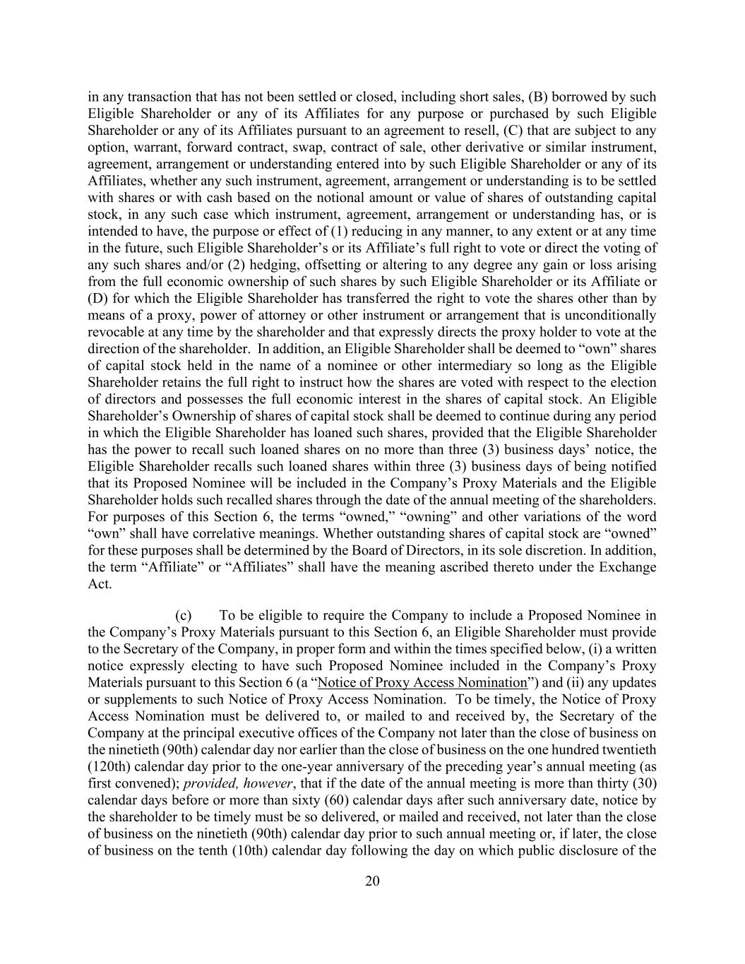 20 in any transaction that has not been settled or closed, including short sales, (B) borrowed by such Eligible Shareholder or any of its Affiliates for any purpose or purchased by such Eligible Shareholder or any of its Affiliates pursuant to an agreement to resell, (C) that are subject to any option, warrant, forward contract, swap, contract of sale, other derivative or similar instrument, agreement, arrangement or understanding entered into by such Eligible Shareholder or any of its Affiliates, whether any such instrument, agreement, arrangement or understanding is to be settled with shares or with cash based on the notional amount or value of shares of outstanding capital stock, in any such case which instrument, agreement, arrangement or understanding has, or is intended to have, the purpose or effect of (1) reducing in any manner, to any extent or at any time in the future, such Eligible Shareholder’s or its Affiliate’s full right to vote or direct the voting of any such shares and/or (2) hedging, offsetting or altering to any degree any gain or loss arising from the full economic ownership of such shares by such Eligible Shareholder or its Affiliate or (D) for which the Eligible Shareholder has transferred the right to vote the shares other than by means of a proxy, power of attorney or other instrument or arrangement that is unconditionally revocable at any time by the shareholder and that expressly directs the proxy holder to vote at the direction of the shareholder. In addition, an Eligible Shareholder shall be deemed to “own” shares of capital stock held in the name of a nominee or other intermediary so long as the Eligible Shareholder retains the full right to instruct how the shares are voted with respect to the election of directors and possesses the full economic interest in the shares of capital stock. An Eligible Shareholder’s Ownership of shares of capital stock shall be deemed to continue during any period in which the Eligible Shareholder has loaned such shares, provided that the Eligible Shareholder has the power to recall such loaned shares on no more than three (3) business days’ notice, the Eligible Shareholder recalls such loaned shares within three (3) business days of being notified that its Proposed Nominee will be included in the Company’s Proxy Materials and the Eligible Shareholder holds such recalled shares through the date of the annual meeting of the shareholders. For purposes of this Section 6, the terms “owned,” “owning” and other variations of the word “own” shall have correlative meanings. Whether outstanding shares of capital stock are “owned” for these purposes shall be determined by the Board of Directors, in its sole discretion. In addition, the term “Affiliate” or “Affiliates” shall have the meaning ascribed thereto under the Exchange Act. To be eligible to require the Company to include a Proposed Nominee in the Company’s Proxy Materials pursuant to this Section 6, an Eligible Shareholder must provide to the Secretary of the Company, in proper form and within the times specified below, (i) a written notice expressly electing to have such Proposed Nominee included in the Company’s Proxy Materials pursuant to this Section 6 (a “Notice of Proxy Access Nomination”) and (ii) any updates or supplements to such Notice of Proxy Access Nomination. To be timely, the Notice of Proxy Access Nomination must be delivered to, or mailed to and received by, the Secretary of the Company at the principal executive offices of the Company not later than the close of business on the ninetieth (90th) calendar day nor earlier than the close of business on the one hundred twentieth (120th) calendar day prior to the one-year anniversary of the preceding year’s annual meeting (as first convened); provided, however, that if the date of the annual meeting is more than thirty (30) calendar days before or more than sixty (60) calendar days after such anniversary date, notice by the shareholder to be timely must be so delivered, or mailed and received, not later than the close of business on the ninetieth (90th) calendar day prior to such annual meeting or, if later, the close of business on the tenth (10th) calendar day following the day on which public disclosure of the