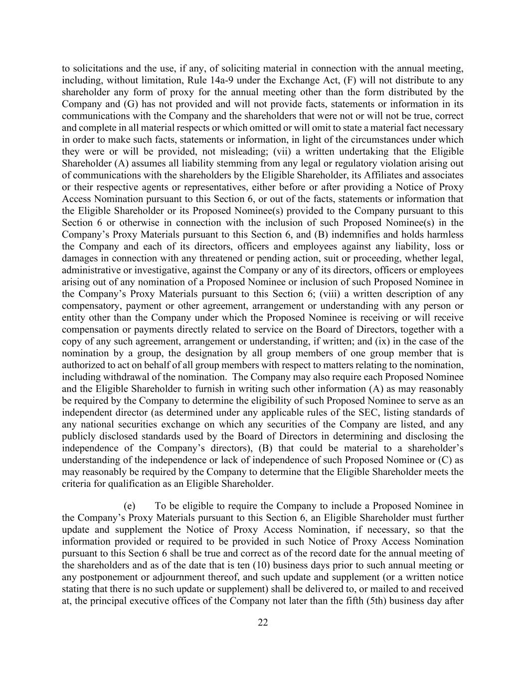 22 to solicitations and the use, if any, of soliciting material in connection with the annual meeting, including, without limitation, Rule 14a‑9 under the Exchange Act, (F) will not distribute to any shareholder any form of proxy for the annual meeting other than the form distributed by the Company and (G) has not provided and will not provide facts, statements or information in its communications with the Company and the shareholders that were not or will not be true, correct and complete in all material respects or which omitted or will omit to state a material fact necessary in order to make such facts, statements or information, in light of the circumstances under which they were or will be provided, not misleading; (vii) a written undertaking that the Eligible Shareholder (A) assumes all liability stemming from any legal or regulatory violation arising out of communications with the shareholders by the Eligible Shareholder, its Affiliates and associates or their respective agents or representatives, either before or after providing a Notice of Proxy Access Nomination pursuant to this Section 6, or out of the facts, statements or information that the Eligible Shareholder or its Proposed Nominee(s) provided to the Company pursuant to this Section 6 or otherwise in connection with the inclusion of such Proposed Nominee(s) in the Company’s Proxy Materials pursuant to this Section 6, and (B) indemnifies and holds harmless the Company and each of its directors, officers and employees against any liability, loss or damages in connection with any threatened or pending action, suit or proceeding, whether legal, administrative or investigative, against the Company or any of its directors, officers or employees arising out of any nomination of a Proposed Nominee or inclusion of such Proposed Nominee in the Company’s Proxy Materials pursuant to this Section 6; (viii) a written description of any compensatory, payment or other agreement, arrangement or understanding with any person or entity other than the Company under which the Proposed Nominee is receiving or will receive compensation or payments directly related to service on the Board of Directors, together with a copy of any such agreement, arrangement or understanding, if written; and (ix) in the case of the nomination by a group, the designation by all group members of one group member that is authorized to act on behalf of all group members with respect to matters relating to the nomination, including withdrawal of the nomination. The Company may also require each Proposed Nominee and the Eligible Shareholder to furnish in writing such other information (A) as may reasonably be required by the Company to determine the eligibility of such Proposed Nominee to serve as an independent director (as determined under any applicable rules of the SEC, listing standards of any national securities exchange on which any securities of the Company are listed, and any publicly disclosed standards used by the Board of Directors in determining and disclosing the independence of the Company’s directors), (B) that could be material to a shareholder’s understanding of the independence or lack of independence of such Proposed Nominee or (C) as may reasonably be required by the Company to determine that the Eligible Shareholder meets the criteria for qualification as an Eligible Shareholder. To be eligible to require the Company to include a Proposed Nominee in the Company’s Proxy Materials pursuant to this Section 6, an Eligible Shareholder must further update and supplement the Notice of Proxy Access Nomination, if necessary, so that the information provided or required to be provided in such Notice of Proxy Access Nomination pursuant to this Section 6 shall be true and correct as of the record date for the annual meeting of the shareholders and as of the date that is ten (10) business days prior to such annual meeting or any postponement or adjournment thereof, and such update and supplement (or a written notice stating that there is no such update or supplement) shall be delivered to, or mailed to and received at, the principal executive offices of the Company not later than the fifth (5th) business day after