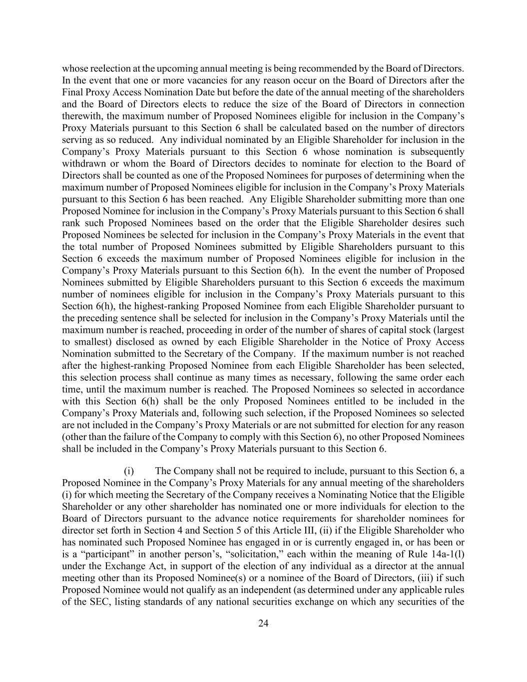 24 whose reelection at the upcoming annual meeting is being recommended by the Board of Directors. In the event that one or more vacancies for any reason occur on the Board of Directors after the Final Proxy Access Nomination Date but before the date of the annual meeting of the shareholders and the Board of Directors elects to reduce the size of the Board of Directors in connection therewith, the maximum number of Proposed Nominees eligible for inclusion in the Company’s Proxy Materials pursuant to this Section 6 shall be calculated based on the number of directors serving as so reduced. Any individual nominated by an Eligible Shareholder for inclusion in the Company’s Proxy Materials pursuant to this Section 6 whose nomination is subsequently withdrawn or whom the Board of Directors decides to nominate for election to the Board of Directors shall be counted as one of the Proposed Nominees for purposes of determining when the maximum number of Proposed Nominees eligible for inclusion in the Company’s Proxy Materials pursuant to this Section 6 has been reached. Any Eligible Shareholder submitting more than one Proposed Nominee for inclusion in the Company’s Proxy Materials pursuant to this Section 6 shall rank such Proposed Nominees based on the order that the Eligible Shareholder desires such Proposed Nominees be selected for inclusion in the Company’s Proxy Materials in the event that the total number of Proposed Nominees submitted by Eligible Shareholders pursuant to this Section 6 exceeds the maximum number of Proposed Nominees eligible for inclusion in the Company’s Proxy Materials pursuant to this Section 6(h). In the event the number of Proposed Nominees submitted by Eligible Shareholders pursuant to this Section 6 exceeds the maximum number of nominees eligible for inclusion in the Company’s Proxy Materials pursuant to this Section 6(h), the highest-ranking Proposed Nominee from each Eligible Shareholder pursuant to the preceding sentence shall be selected for inclusion in the Company’s Proxy Materials until the maximum number is reached, proceeding in order of the number of shares of capital stock (largest to smallest) disclosed as owned by each Eligible Shareholder in the Notice of Proxy Access Nomination submitted to the Secretary of the Company. If the maximum number is not reached after the highest-ranking Proposed Nominee from each Eligible Shareholder has been selected, this selection process shall continue as many times as necessary, following the same order each time, until the maximum number is reached. The Proposed Nominees so selected in accordance with this Section 6(h) shall be the only Proposed Nominees entitled to be included in the Company’s Proxy Materials and, following such selection, if the Proposed Nominees so selected are not included in the Company’s Proxy Materials or are not submitted for election for any reason (other than the failure of the Company to comply with this Section 6), no other Proposed Nominees shall be included in the Company’s Proxy Materials pursuant to this Section 6. The Company shall not be required to include, pursuant to this Section 6, a Proposed Nominee in the Company’s Proxy Materials for any annual meeting of the shareholders (i) for which meeting the Secretary of the Company receives a Nominating Notice that the Eligible Shareholder or any other shareholder has nominated one or more individuals for election to the Board of Directors pursuant to the advance notice requirements for shareholder nominees for director set forth in Section 4 and Section 5 of this Article III, (ii) if the Eligible Shareholder who has nominated such Proposed Nominee has engaged in or is currently engaged in, or has been or is a “participant” in another person’s, “solicitation,” each within the meaning of Rule 14a‑1(l) under the Exchange Act, in support of the election of any individual as a director at the annual meeting other than its Proposed Nominee(s) or a nominee of the Board of Directors, (iii) if such Proposed Nominee would not qualify as an independent (as determined under any applicable rules of the SEC, listing standards of any national securities exchange on which any securities of the