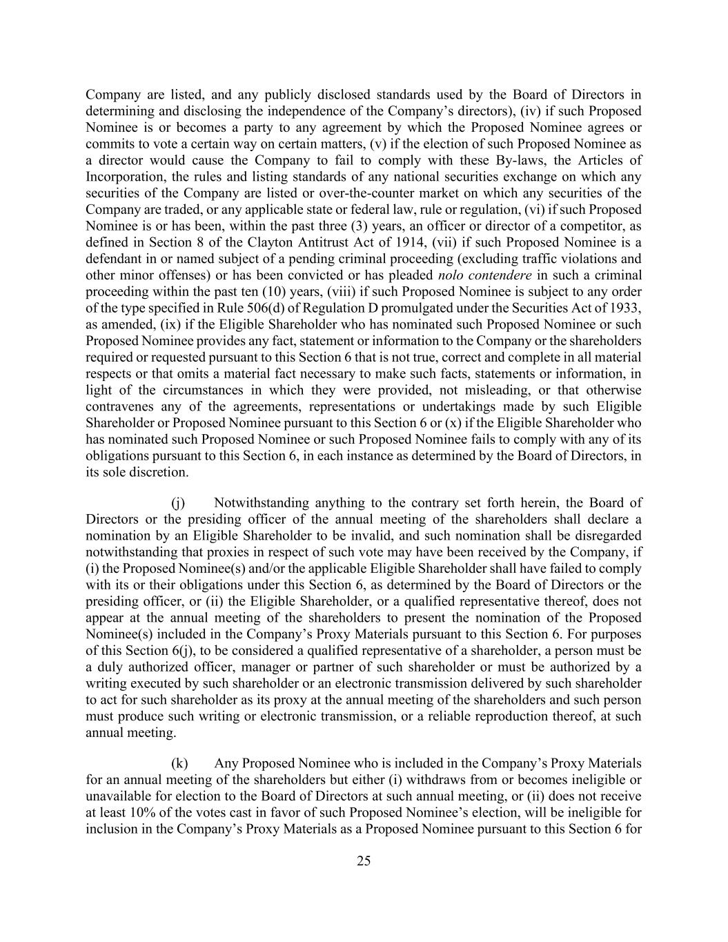 25 Company are listed, and any publicly disclosed standards used by the Board of Directors in determining and disclosing the independence of the Company’s directors), (iv) if such Proposed Nominee is or becomes a party to any agreement by which the Proposed Nominee agrees or commits to vote a certain way on certain matters, (v) if the election of such Proposed Nominee as a director would cause the Company to fail to comply with these By-laws, the Articles of Incorporation, the rules and listing standards of any national securities exchange on which any securities of the Company are listed or over-the-counter market on which any securities of the Company are traded, or any applicable state or federal law, rule or regulation, (vi) if such Proposed Nominee is or has been, within the past three (3) years, an officer or director of a competitor, as defined in Section 8 of the Clayton Antitrust Act of 1914, (vii) if such Proposed Nominee is a defendant in or named subject of a pending criminal proceeding (excluding traffic violations and other minor offenses) or has been convicted or has pleaded nolo contendere in such a criminal proceeding within the past ten (10) years, (viii) if such Proposed Nominee is subject to any order of the type specified in Rule 506(d) of Regulation D promulgated under the Securities Act of 1933, as amended, (ix) if the Eligible Shareholder who has nominated such Proposed Nominee or such Proposed Nominee provides any fact, statement or information to the Company or the shareholders required or requested pursuant to this Section 6 that is not true, correct and complete in all material respects or that omits a material fact necessary to make such facts, statements or information, in light of the circumstances in which they were provided, not misleading, or that otherwise contravenes any of the agreements, representations or undertakings made by such Eligible Shareholder or Proposed Nominee pursuant to this Section 6 or (x) if the Eligible Shareholder who has nominated such Proposed Nominee or such Proposed Nominee fails to comply with any of its obligations pursuant to this Section 6, in each instance as determined by the Board of Directors, in its sole discretion. Notwithstanding anything to the contrary set forth herein, the Board of Directors or the presiding officer of the annual meeting of the shareholders shall declare a nomination by an Eligible Shareholder to be invalid, and such nomination shall be disregarded notwithstanding that proxies in respect of such vote may have been received by the Company, if (i) the Proposed Nominee(s) and/or the applicable Eligible Shareholder shall have failed to comply with its or their obligations under this Section 6, as determined by the Board of Directors or the presiding officer, or (ii) the Eligible Shareholder, or a qualified representative thereof, does not appear at the annual meeting of the shareholders to present the nomination of the Proposed Nominee(s) included in the Company’s Proxy Materials pursuant to this Section 6. For purposes of this Section 6(j), to be considered a qualified representative of a shareholder, a person must be a duly authorized officer, manager or partner of such shareholder or must be authorized by a writing executed by such shareholder or an electronic transmission delivered by such shareholder to act for such shareholder as its proxy at the annual meeting of the shareholders and such person must produce such writing or electronic transmission, or a reliable reproduction thereof, at such annual meeting. Any Proposed Nominee who is included in the Company’s Proxy Materials for an annual meeting of the shareholders but either (i) withdraws from or becomes ineligible or unavailable for election to the Board of Directors at such annual meeting, or (ii) does not receive at least 10% of the votes cast in favor of such Proposed Nominee’s election, will be ineligible for inclusion in the Company’s Proxy Materials as a Proposed Nominee pursuant to this Section 6 for