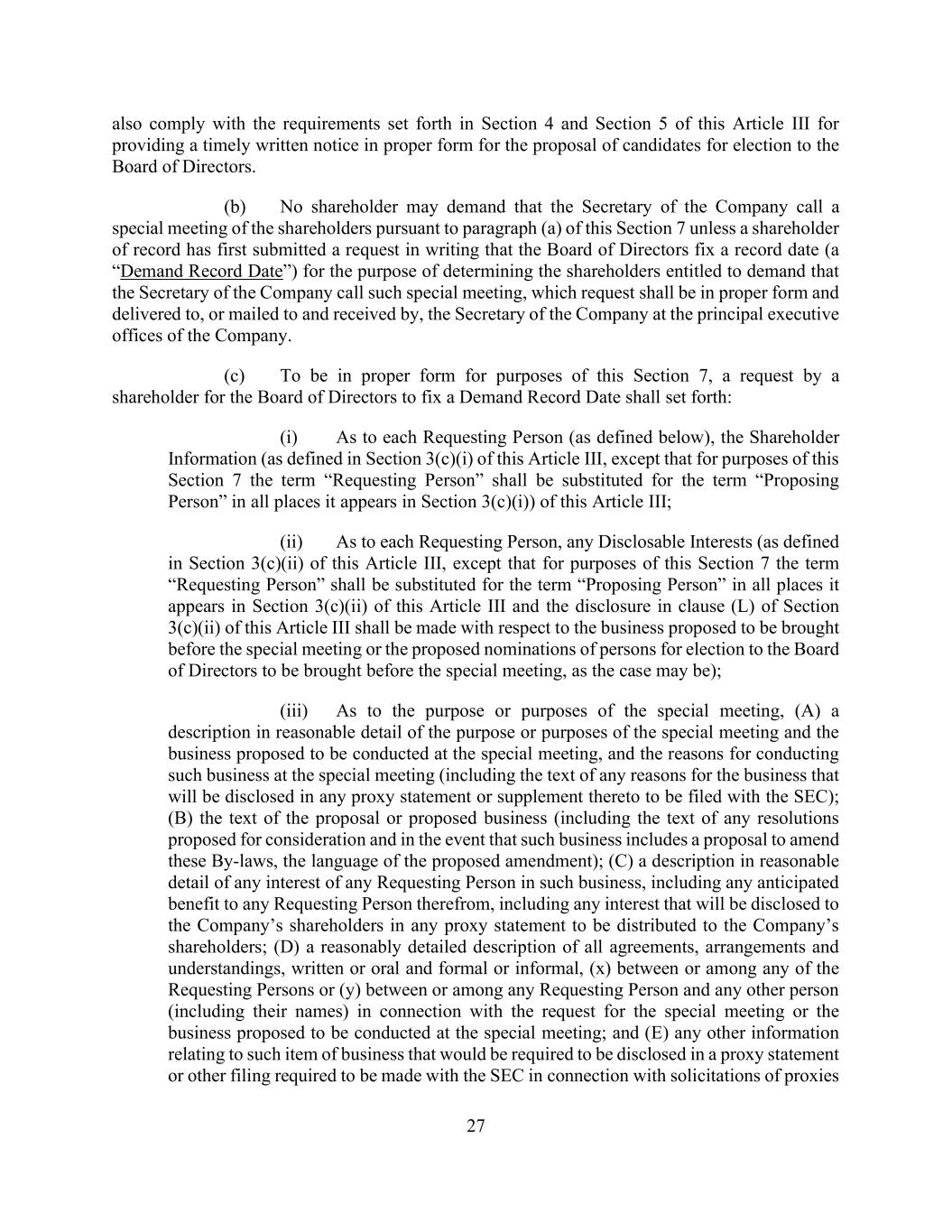 27 also comply with the requirements set forth in Section 4 and Section 5 of this Article III for providing a timely written notice in proper form for the proposal of candidates for election to the Board of Directors. No shareholder may demand that the Secretary of the Company call a special meeting of the shareholders pursuant to paragraph (a) of this Section 7 unless a shareholder of record has first submitted a request in writing that the Board of Directors fix a record date (a “Demand Record Date”) for the purpose of determining the shareholders entitled to demand that the Secretary of the Company call such special meeting, which request shall be in proper form and delivered to, or mailed to and received by, the Secretary of the Company at the principal executive offices of the Company. To be in proper form for purposes of this Section 7, a request by a shareholder for the Board of Directors to fix a Demand Record Date shall set forth: (i) As to each Requesting Person (as defined below), the Shareholder Information (as defined in Section 3(c)(i) of this Article III, except that for purposes of this Section 7 the term “Requesting Person” shall be substituted for the term “Proposing Person” in all places it appears in Section 3(c)(i)) of this Article III; (ii) As to each Requesting Person, any Disclosable Interests (as defined in Section 3(c)(ii) of this Article III, except that for purposes of this Section 7 the term “Requesting Person” shall be substituted for the term “Proposing Person” in all places it appears in Section 3(c)(ii) of this Article III and the disclosure in clause (L) of Section 3(c)(ii) of this Article III shall be made with respect to the business proposed to be brought before the special meeting or the proposed nominations of persons for election to the Board of Directors to be brought before the special meeting, as the case may be); (iii) As to the purpose or purposes of the special meeting, (A) a description in reasonable detail of the purpose or purposes of the special meeting and the business proposed to be conducted at the special meeting, and the reasons for conducting such business at the special meeting (including the text of any reasons for the business that will be disclosed in any proxy statement or supplement thereto to be filed with the SEC); (B) the text of the proposal or proposed business (including the text of any resolutions proposed for consideration and in the event that such business includes a proposal to amend these By-laws, the language of the proposed amendment); (C) a description in reasonable detail of any interest of any Requesting Person in such business, including any anticipated benefit to any Requesting Person therefrom, including any interest that will be disclosed to the Company’s shareholders in any proxy statement to be distributed to the Company’s shareholders; (D) a reasonably detailed description of all agreements, arrangements and understandings, written or oral and formal or informal, (x) between or among any of the Requesting Persons or (y) between or among any Requesting Person and any other person (including their names) in connection with the request for the special meeting or the business proposed to be conducted at the special meeting; and (E) any other information relating to such item of business that would be required to be disclosed in a proxy statement or other filing required to be made with the SEC in connection with solicitations of proxies