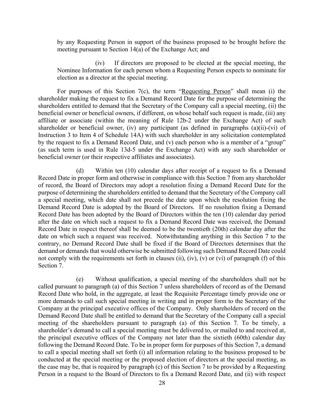 28 by any Requesting Person in support of the business proposed to be brought before the meeting pursuant to Section 14(a) of the Exchange Act; and (iv) If directors are proposed to be elected at the special meeting, the Nominee Information for each person whom a Requesting Person expects to nominate for election as a director at the special meeting. For purposes of this Section 7(c), the term “Requesting Person” shall mean (i) the shareholder making the request to fix a Demand Record Date for the purpose of determining the shareholders entitled to demand that the Secretary of the Company call a special meeting, (ii) the beneficial owner or beneficial owners, if different, on whose behalf such request is made, (iii) any affiliate or associate (within the meaning of Rule 12b-2 under the Exchange Act) of such shareholder or beneficial owner, (iv) any participant (as defined in paragraphs (a)(ii)-(vi) of Instruction 3 to Item 4 of Schedule 14A) with such shareholder in any solicitation contemplated by the request to fix a Demand Record Date, and (v) each person who is a member of a “group” (as such term is used in Rule 13d-5 under the Exchange Act) with any such shareholder or beneficial owner (or their respective affiliates and associates). Within ten (10) calendar days after receipt of a request to fix a Demand Record Date in proper form and otherwise in compliance with this Section 7 from any shareholder of record, the Board of Directors may adopt a resolution fixing a Demand Record Date for the purpose of determining the shareholders entitled to demand that the Secretary of the Company call a special meeting, which date shall not precede the date upon which the resolution fixing the Demand Record Date is adopted by the Board of Directors. If no resolution fixing a Demand Record Date has been adopted by the Board of Directors within the ten (10) calendar day period after the date on which such a request to fix a Demand Record Date was received, the Demand Record Date in respect thereof shall be deemed to be the twentieth (20th) calendar day after the date on which such a request was received. Notwithstanding anything in this Section 7 to the contrary, no Demand Record Date shall be fixed if the Board of Directors determines that the demand or demands that would otherwise be submitted following such Demand Record Date could not comply with the requirements set forth in clauses (ii), (iv), (v) or (vi) of paragraph (f) of this Section 7. Without qualification, a special meeting of the shareholders shall not be called pursuant to paragraph (a) of this Section 7 unless shareholders of record as of the Demand Record Date who hold, in the aggregate, at least the Requisite Percentage timely provide one or more demands to call such special meeting in writing and in proper form to the Secretary of the Company at the principal executive offices of the Company. Only shareholders of record on the Demand Record Date shall be entitled to demand that the Secretary of the Company call a special meeting of the shareholders pursuant to paragraph (a) of this Section 7. To be timely, a shareholder’s demand to call a special meeting must be delivered to, or mailed to and received at, the principal executive offices of the Company not later than the sixtieth (60th) calendar day following the Demand Record Date. To be in proper form for purposes of this Section 7, a demand to call a special meeting shall set forth (i) all information relating to the business proposed to be conducted at the special meeting or the proposed election of directors at the special meeting, as the case may be, that is required by paragraph (c) of this Section 7 to be provided by a Requesting Person in a request to the Board of Directors to fix a Demand Record Date, and (ii) with respect