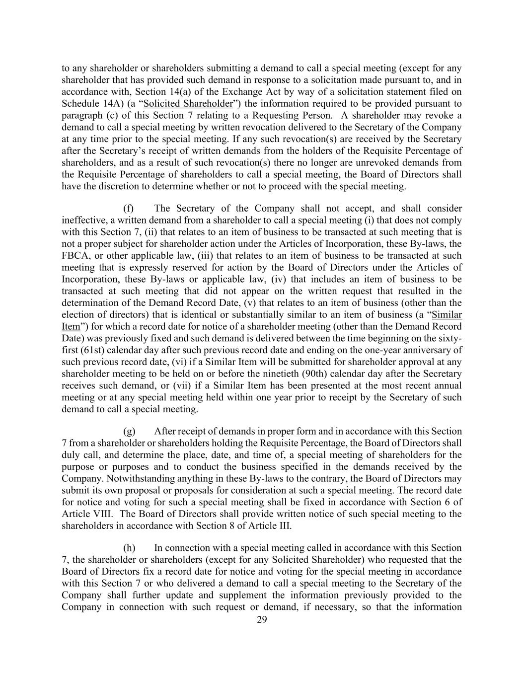 29 to any shareholder or shareholders submitting a demand to call a special meeting (except for any shareholder that has provided such demand in response to a solicitation made pursuant to, and in accordance with, Section 14(a) of the Exchange Act by way of a solicitation statement filed on Schedule 14A) (a “Solicited Shareholder”) the information required to be provided pursuant to paragraph (c) of this Section 7 relating to a Requesting Person. A shareholder may revoke a demand to call a special meeting by written revocation delivered to the Secretary of the Company at any time prior to the special meeting. If any such revocation(s) are received by the Secretary after the Secretary’s receipt of written demands from the holders of the Requisite Percentage of shareholders, and as a result of such revocation(s) there no longer are unrevoked demands from the Requisite Percentage of shareholders to call a special meeting, the Board of Directors shall have the discretion to determine whether or not to proceed with the special meeting. The Secretary of the Company shall not accept, and shall consider ineffective, a written demand from a shareholder to call a special meeting (i) that does not comply with this Section 7, (ii) that relates to an item of business to be transacted at such meeting that is not a proper subject for shareholder action under the Articles of Incorporation, these By-laws, the FBCA, or other applicable law, (iii) that relates to an item of business to be transacted at such meeting that is expressly reserved for action by the Board of Directors under the Articles of Incorporation, these By-laws or applicable law, (iv) that includes an item of business to be transacted at such meeting that did not appear on the written request that resulted in the determination of the Demand Record Date, (v) that relates to an item of business (other than the election of directors) that is identical or substantially similar to an item of business (a “Similar Item”) for which a record date for notice of a shareholder meeting (other than the Demand Record Date) was previously fixed and such demand is delivered between the time beginning on the sixty- first (61st) calendar day after such previous record date and ending on the one-year anniversary of such previous record date, (vi) if a Similar Item will be submitted for shareholder approval at any shareholder meeting to be held on or before the ninetieth (90th) calendar day after the Secretary receives such demand, or (vii) if a Similar Item has been presented at the most recent annual meeting or at any special meeting held within one year prior to receipt by the Secretary of such demand to call a special meeting. After receipt of demands in proper form and in accordance with this Section 7 from a shareholder or shareholders holding the Requisite Percentage, the Board of Directors shall duly call, and determine the place, date, and time of, a special meeting of shareholders for the purpose or purposes and to conduct the business specified in the demands received by the Company. Notwithstanding anything in these By-laws to the contrary, the Board of Directors may submit its own proposal or proposals for consideration at such a special meeting. The record date for notice and voting for such a special meeting shall be fixed in accordance with Section 6 of Article VIII. The Board of Directors shall provide written notice of such special meeting to the shareholders in accordance with Section 8 of Article III. In connection with a special meeting called in accordance with this Section 7, the shareholder or shareholders (except for any Solicited Shareholder) who requested that the Board of Directors fix a record date for notice and voting for the special meeting in accordance with this Section 7 or who delivered a demand to call a special meeting to the Secretary of the Company shall further update and supplement the information previously provided to the Company in connection with such request or demand, if necessary, so that the information
