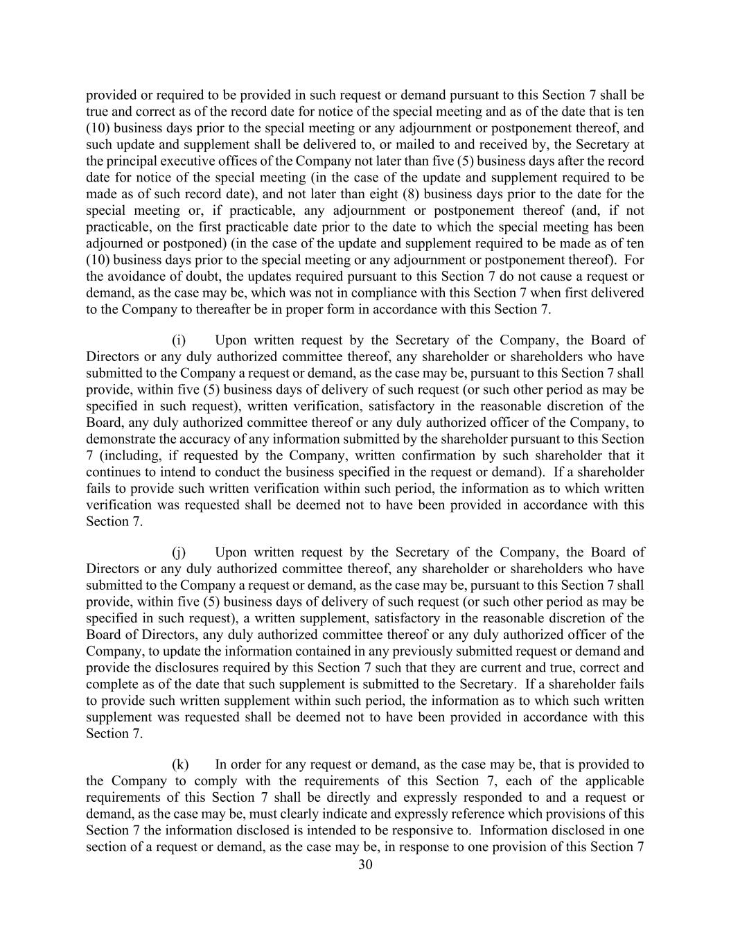 30 provided or required to be provided in such request or demand pursuant to this Section 7 shall be true and correct as of the record date for notice of the special meeting and as of the date that is ten (10) business days prior to the special meeting or any adjournment or postponement thereof, and such update and supplement shall be delivered to, or mailed to and received by, the Secretary at the principal executive offices of the Company not later than five (5) business days after the record date for notice of the special meeting (in the case of the update and supplement required to be made as of such record date), and not later than eight (8) business days prior to the date for the special meeting or, if practicable, any adjournment or postponement thereof (and, if not practicable, on the first practicable date prior to the date to which the special meeting has been adjourned or postponed) (in the case of the update and supplement required to be made as of ten (10) business days prior to the special meeting or any adjournment or postponement thereof). For the avoidance of doubt, the updates required pursuant to this Section 7 do not cause a request or demand, as the case may be, which was not in compliance with this Section 7 when first delivered to the Company to thereafter be in proper form in accordance with this Section 7. Upon written request by the Secretary of the Company, the Board of Directors or any duly authorized committee thereof, any shareholder or shareholders who have submitted to the Company a request or demand, as the case may be, pursuant to this Section 7 shall provide, within five (5) business days of delivery of such request (or such other period as may be specified in such request), written verification, satisfactory in the reasonable discretion of the Board, any duly authorized committee thereof or any duly authorized officer of the Company, to demonstrate the accuracy of any information submitted by the shareholder pursuant to this Section 7 (including, if requested by the Company, written confirmation by such shareholder that it continues to intend to conduct the business specified in the request or demand). If a shareholder fails to provide such written verification within such period, the information as to which written verification was requested shall be deemed not to have been provided in accordance with this Section 7. Upon written request by the Secretary of the Company, the Board of Directors or any duly authorized committee thereof, any shareholder or shareholders who have submitted to the Company a request or demand, as the case may be, pursuant to this Section 7 shall provide, within five (5) business days of delivery of such request (or such other period as may be specified in such request), a written supplement, satisfactory in the reasonable discretion of the Board of Directors, any duly authorized committee thereof or any duly authorized officer of the Company, to update the information contained in any previously submitted request or demand and provide the disclosures required by this Section 7 such that they are current and true, correct and complete as of the date that such supplement is submitted to the Secretary. If a shareholder fails to provide such written supplement within such period, the information as to which such written supplement was requested shall be deemed not to have been provided in accordance with this Section 7. In order for any request or demand, as the case may be, that is provided to the Company to comply with the requirements of this Section 7, each of the applicable requirements of this Section 7 shall be directly and expressly responded to and a request or demand, as the case may be, must clearly indicate and expressly reference which provisions of this Section 7 the information disclosed is intended to be responsive to. Information disclosed in one section of a request or demand, as the case may be, in response to one provision of this Section 7