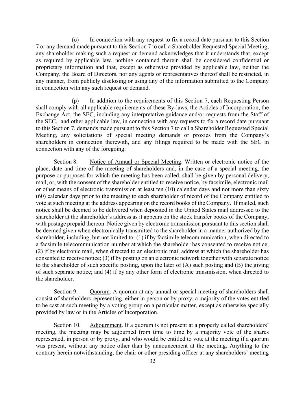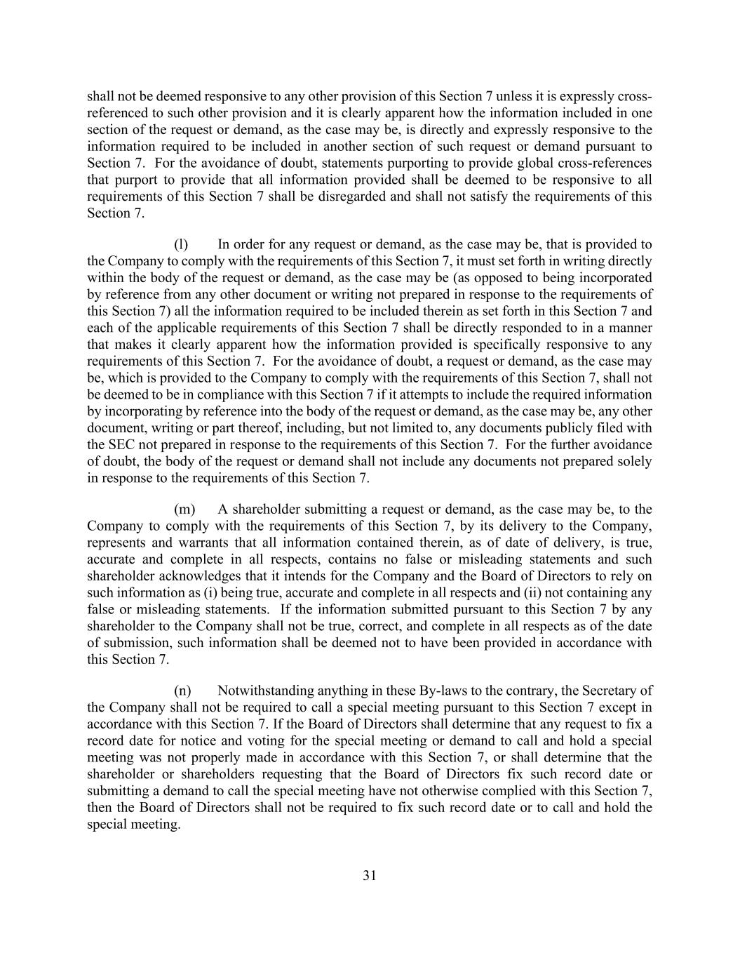 31 shall not be deemed responsive to any other provision of this Section 7 unless it is expressly cross- referenced to such other provision and it is clearly apparent how the information included in one section of the request or demand, as the case may be, is directly and expressly responsive to the information required to be included in another section of such request or demand pursuant to Section 7. For the avoidance of doubt, statements purporting to provide global cross-references that purport to provide that all information provided shall be deemed to be responsive to all requirements of this Section 7 shall be disregarded and shall not satisfy the requirements of this Section 7. In order for any request or demand, as the case may be, that is provided to the Company to comply with the requirements of this Section 7, it must set forth in writing directly within the body of the request or demand, as the case may be (as opposed to being incorporated by reference from any other document or writing not prepared in response to the requirements of this Section 7) all the information required to be included therein as set forth in this Section 7 and each of the applicable requirements of this Section 7 shall be directly responded to in a manner that makes it clearly apparent how the information provided is specifically responsive to any requirements of this Section 7. For the avoidance of doubt, a request or demand, as the case may be, which is provided to the Company to comply with the requirements of this Section 7, shall not be deemed to be in compliance with this Section 7 if it attempts to include the required information by incorporating by reference into the body of the request or demand, as the case may be, any other document, writing or part thereof, including, but not limited to, any documents publicly filed with the SEC not prepared in response to the requirements of this Section 7. For the further avoidance of doubt, the body of the request or demand shall not include any documents not prepared solely in response to the requirements of this Section 7. A shareholder submitting a request or demand, as the case may be, to the Company to comply with the requirements of this Section 7, by its delivery to the Company, represents and warrants that all information contained therein, as of date of delivery, is true, accurate and complete in all respects, contains no false or misleading statements and such shareholder acknowledges that it intends for the Company and the Board of Directors to rely on such information as (i) being true, accurate and complete in all respects and (ii) not containing any false or misleading statements. If the information submitted pursuant to this Section 7 by any shareholder to the Company shall not be true, correct, and complete in all respects as of the date of submission, such information shall be deemed not to have been provided in accordance with this Section 7. Notwithstanding anything in these By-laws to the contrary, the Secretary of the Company shall not be required to call a special meeting pursuant to this Section 7 except in accordance with this Section 7. If the Board of Directors shall determine that any request to fix a record date for notice and voting for the special meeting or demand to call and hold a special meeting was not properly made in accordance with this Section 7, or shall determine that the shareholder or shareholders requesting that the Board of Directors fix such record date or submitting a demand to call the special meeting have not otherwise complied with this Section 7, then the Board of Directors shall not be required to fix such record date or to call and hold the special meeting.