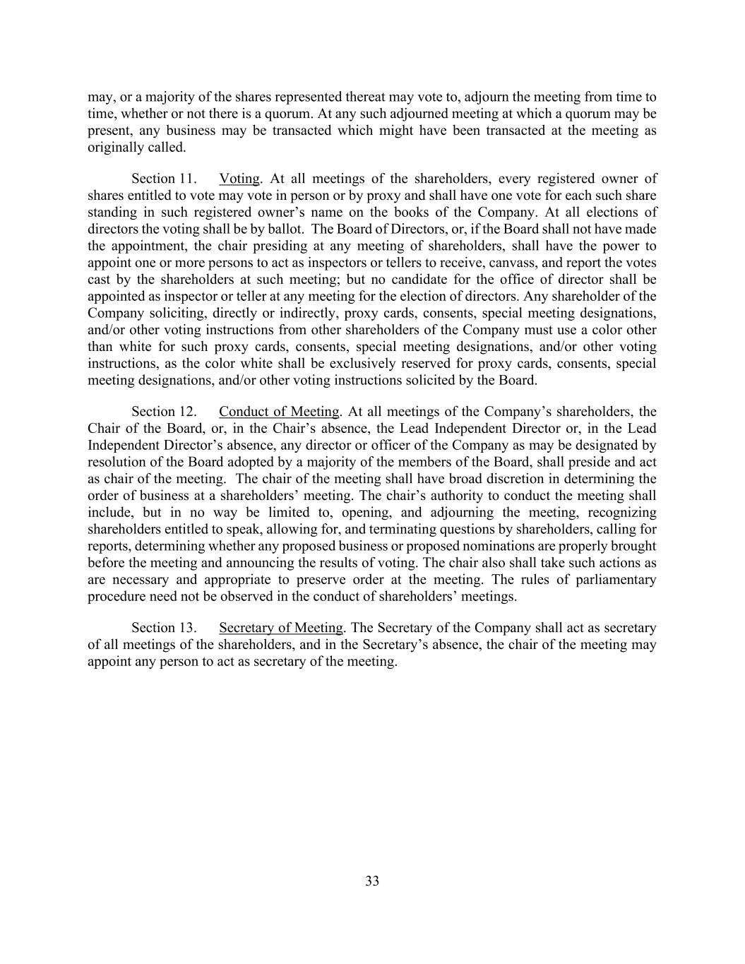 33 may, or a majority of the shares represented thereat may vote to, adjourn the meeting from time to time, whether or not there is a quorum. At any such adjourned meeting at which a quorum may be present, any business may be transacted which might have been transacted at the meeting as originally called. Section 11. Voting. At all meetings of the shareholders, every registered owner of shares entitled to vote may vote in person or by proxy and shall have one vote for each such share standing in such registered owner’s name on the books of the Company. At all elections of directors the voting shall be by ballot. The Board of Directors, or, if the Board shall not have made the appointment, the chair presiding at any meeting of shareholders, shall have the power to appoint one or more persons to act as inspectors or tellers to receive, canvass, and report the votes cast by the shareholders at such meeting; but no candidate for the office of director shall be appointed as inspector or teller at any meeting for the election of directors. Any shareholder of the Company soliciting, directly or indirectly, proxy cards, consents, special meeting designations, and/or other voting instructions from other shareholders of the Company must use a color other than white for such proxy cards, consents, special meeting designations, and/or other voting instructions, as the color white shall be exclusively reserved for proxy cards, consents, special meeting designations, and/or other voting instructions solicited by the Board. Section 12. Conduct of Meeting. At all meetings of the Company’s shareholders, the Chair of the Board, or, in the Chair’s absence, the Lead Independent Director or, in the Lead Independent Director’s absence, any director or officer of the Company as may be designated by resolution of the Board adopted by a majority of the members of the Board, shall preside and act as chair of the meeting. The chair of the meeting shall have broad discretion in determining the order of business at a shareholders’ meeting. The chair’s authority to conduct the meeting shall include, but in no way be limited to, opening, and adjourning the meeting, recognizing shareholders entitled to speak, allowing for, and terminating questions by shareholders, calling for reports, determining whether any proposed business or proposed nominations are properly brought before the meeting and announcing the results of voting. The chair also shall take such actions as are necessary and appropriate to preserve order at the meeting. The rules of parliamentary procedure need not be observed in the conduct of shareholders’ meetings. Section 13. Secretary of Meeting. The Secretary of the Company shall act as secretary of all meetings of the shareholders, and in the Secretary’s absence, the chair of the meeting may appoint any person to act as secretary of the meeting.