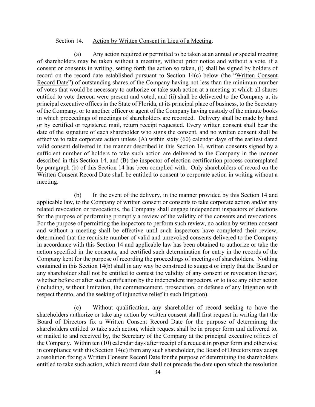 34 Section 14. Action by Written Consent in Lieu of a Meeting. Any action required or permitted to be taken at an annual or special meeting of shareholders may be taken without a meeting, without prior notice and without a vote, if a consent or consents in writing, setting forth the action so taken, (i) shall be signed by holders of record on the record date established pursuant to Section 14(c) below (the “Written Consent Record Date”) of outstanding shares of the Company having not less than the minimum number of votes that would be necessary to authorize or take such action at a meeting at which all shares entitled to vote thereon were present and voted, and (ii) shall be delivered to the Company at its principal executive offices in the State of Florida, at its principal place of business, to the Secretary of the Company, or to another officer or agent of the Company having custody of the minute books in which proceedings of meetings of shareholders are recorded. Delivery shall be made by hand or by certified or registered mail, return receipt requested. Every written consent shall bear the date of the signature of each shareholder who signs the consent, and no written consent shall be effective to take corporate action unless (A) within sixty (60) calendar days of the earliest dated valid consent delivered in the manner described in this Section 14, written consents signed by a sufficient number of holders to take such action are delivered to the Company in the manner described in this Section 14, and (B) the inspector of election certification process contemplated by paragraph (b) of this Section 14 has been complied with. Only shareholders of record on the Written Consent Record Date shall be entitled to consent to corporate action in writing without a meeting. In the event of the delivery, in the manner provided by this Section 14 and applicable law, to the Company of written consent or consents to take corporate action and/or any related revocation or revocations, the Company shall engage independent inspectors of elections for the purpose of performing promptly a review of the validity of the consents and revocations. For the purpose of permitting the inspectors to perform such review, no action by written consent and without a meeting shall be effective until such inspectors have completed their review, determined that the requisite number of valid and unrevoked consents delivered to the Company in accordance with this Section 14 and applicable law has been obtained to authorize or take the action specified in the consents, and certified such determination for entry in the records of the Company kept for the purpose of recording the proceedings of meetings of shareholders. Nothing contained in this Section 14(b) shall in any way be construed to suggest or imply that the Board or any shareholder shall not be entitled to contest the validity of any consent or revocation thereof, whether before or after such certification by the independent inspectors, or to take any other action (including, without limitation, the commencement, prosecution, or defense of any litigation with respect thereto, and the seeking of injunctive relief in such litigation). Without qualification, any shareholder of record seeking to have the shareholders authorize or take any action by written consent shall first request in writing that the Board of Directors fix a Written Consent Record Date for the purpose of determining the shareholders entitled to take such action, which request shall be in proper form and delivered to, or mailed to and received by, the Secretary of the Company at the principal executive offices of the Company. Within ten (10) calendar days after receipt of a request in proper form and otherwise in compliance with this Section 14(c) from any such shareholder, the Board of Directors may adopt a resolution fixing a Written Consent Record Date for the purpose of determining the shareholders entitled to take such action, which record date shall not precede the date upon which the resolution