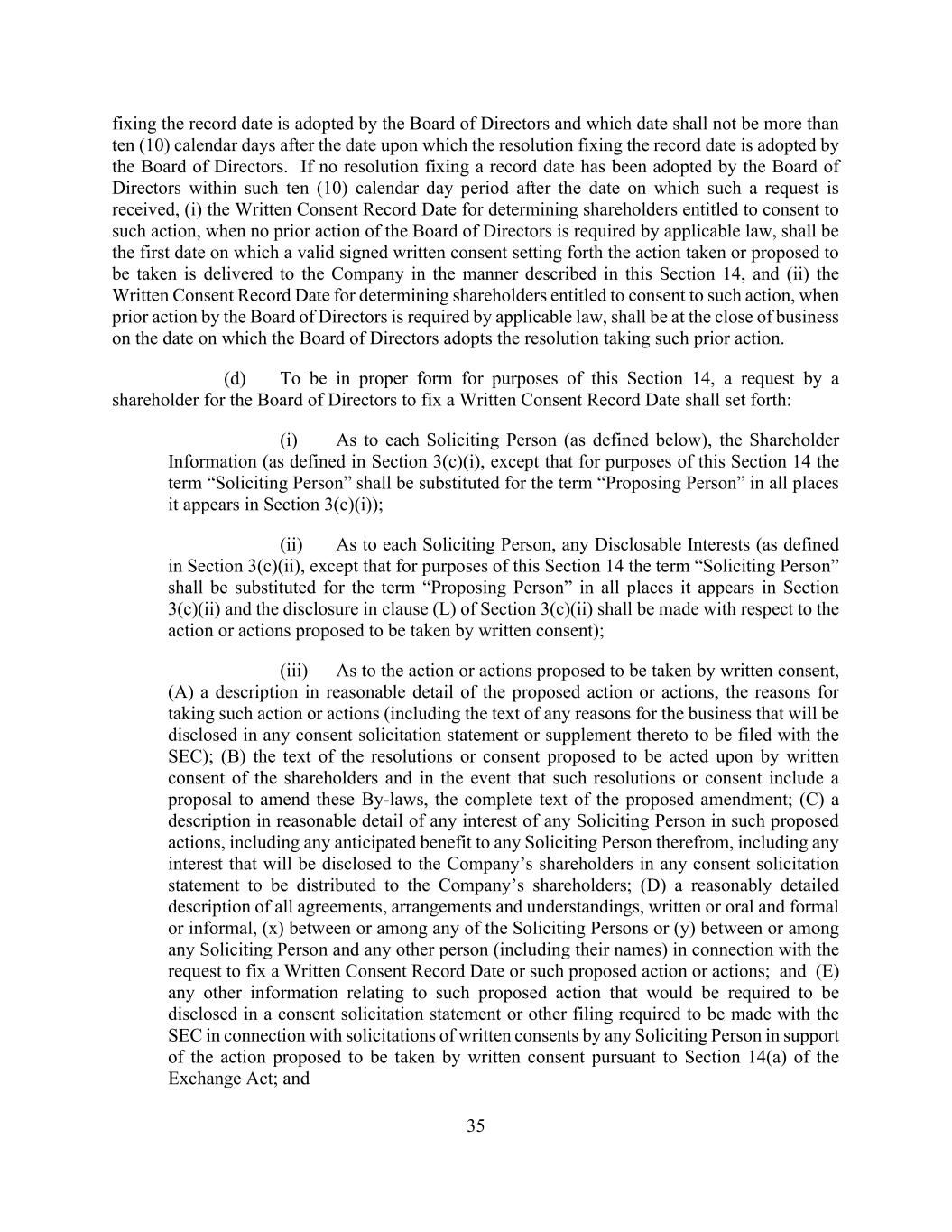 35 fixing the record date is adopted by the Board of Directors and which date shall not be more than ten (10) calendar days after the date upon which the resolution fixing the record date is adopted by the Board of Directors. If no resolution fixing a record date has been adopted by the Board of Directors within such ten (10) calendar day period after the date on which such a request is received, (i) the Written Consent Record Date for determining shareholders entitled to consent to such action, when no prior action of the Board of Directors is required by applicable law, shall be the first date on which a valid signed written consent setting forth the action taken or proposed to be taken is delivered to the Company in the manner described in this Section 14, and (ii) the Written Consent Record Date for determining shareholders entitled to consent to such action, when prior action by the Board of Directors is required by applicable law, shall be at the close of business on the date on which the Board of Directors adopts the resolution taking such prior action. To be in proper form for purposes of this Section 14, a request by a shareholder for the Board of Directors to fix a Written Consent Record Date shall set forth: (i) As to each Soliciting Person (as defined below), the Shareholder Information (as defined in Section 3(c)(i), except that for purposes of this Section 14 the term “Soliciting Person” shall be substituted for the term “Proposing Person” in all places it appears in Section 3(c)(i)); (ii) As to each Soliciting Person, any Disclosable Interests (as defined in Section 3(c)(ii), except that for purposes of this Section 14 the term “Soliciting Person” shall be substituted for the term “Proposing Person” in all places it appears in Section 3(c)(ii) and the disclosure in clause (L) of Section 3(c)(ii) shall be made with respect to the action or actions proposed to be taken by written consent); (iii) As to the action or actions proposed to be taken by written consent, (A) a description in reasonable detail of the proposed action or actions, the reasons for taking such action or actions (including the text of any reasons for the business that will be disclosed in any consent solicitation statement or supplement thereto to be filed with the SEC); (B) the text of the resolutions or consent proposed to be acted upon by written consent of the shareholders and in the event that such resolutions or consent include a proposal to amend these By-laws, the complete text of the proposed amendment; (C) a description in reasonable detail of any interest of any Soliciting Person in such proposed actions, including any anticipated benefit to any Soliciting Person therefrom, including any interest that will be disclosed to the Company’s shareholders in any consent solicitation statement to be distributed to the Company’s shareholders; (D) a reasonably detailed description of all agreements, arrangements and understandings, written or oral and formal or informal, (x) between or among any of the Soliciting Persons or (y) between or among any Soliciting Person and any other person (including their names) in connection with the request to fix a Written Consent Record Date or such proposed action or actions; and (E) any other information relating to such proposed action that would be required to be disclosed in a consent solicitation statement or other filing required to be made with the SEC in connection with solicitations of written consents by any Soliciting Person in support of the action proposed to be taken by written consent pursuant to Section 14(a) of the Exchange Act; and