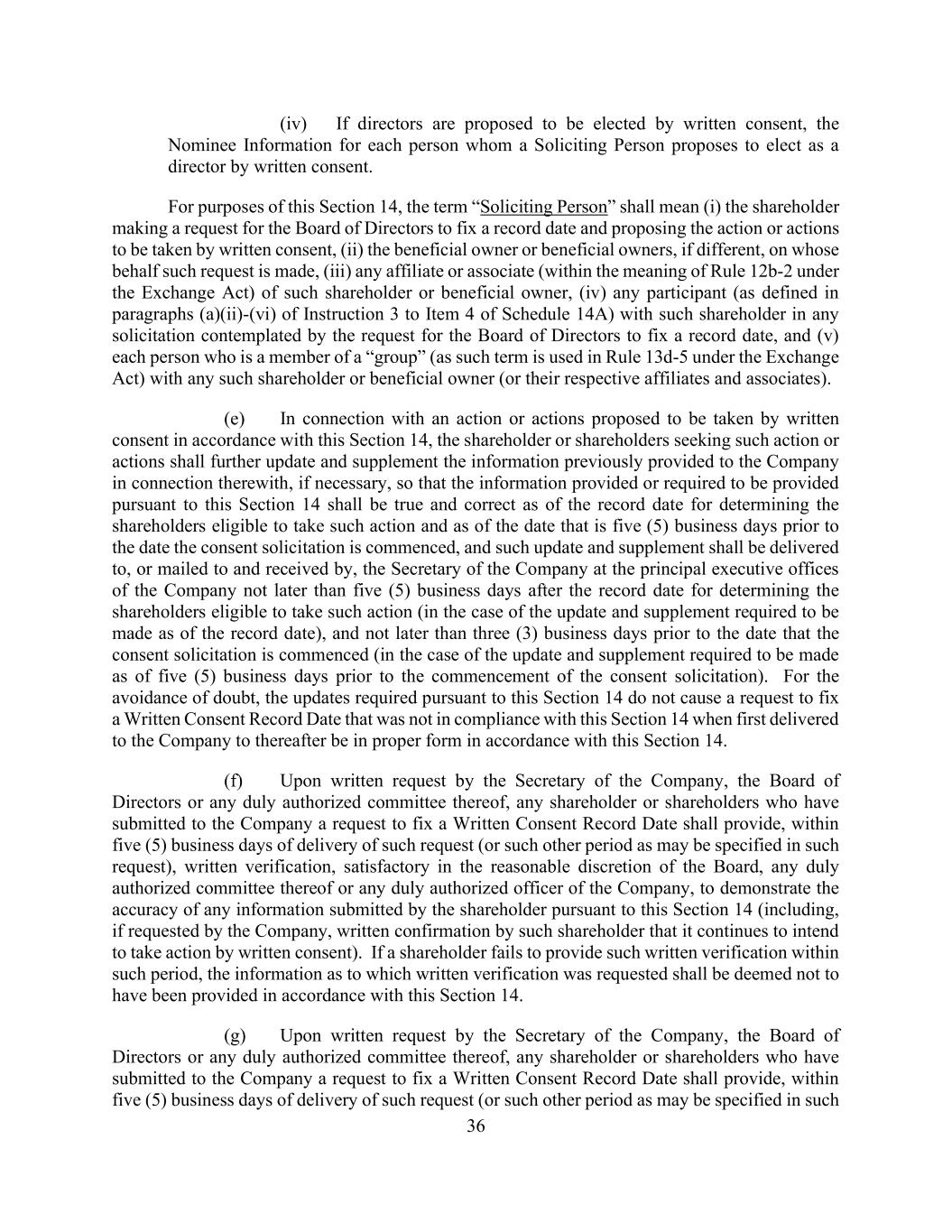 36 (iv) If directors are proposed to be elected by written consent, the Nominee Information for each person whom a Soliciting Person proposes to elect as a director by written consent. For purposes of this Section 14, the term “Soliciting Person” shall mean (i) the shareholder making a request for the Board of Directors to fix a record date and proposing the action or actions to be taken by written consent, (ii) the beneficial owner or beneficial owners, if different, on whose behalf such request is made, (iii) any affiliate or associate (within the meaning of Rule 12b-2 under the Exchange Act) of such shareholder or beneficial owner, (iv) any participant (as defined in paragraphs (a)(ii)-(vi) of Instruction 3 to Item 4 of Schedule 14A) with such shareholder in any solicitation contemplated by the request for the Board of Directors to fix a record date, and (v) each person who is a member of a “group” (as such term is used in Rule 13d-5 under the Exchange Act) with any such shareholder or beneficial owner (or their respective affiliates and associates). In connection with an action or actions proposed to be taken by written consent in accordance with this Section 14, the shareholder or shareholders seeking such action or actions shall further update and supplement the information previously provided to the Company in connection therewith, if necessary, so that the information provided or required to be provided pursuant to this Section 14 shall be true and correct as of the record date for determining the shareholders eligible to take such action and as of the date that is five (5) business days prior to the date the consent solicitation is commenced, and such update and supplement shall be delivered to, or mailed to and received by, the Secretary of the Company at the principal executive offices of the Company not later than five (5) business days after the record date for determining the shareholders eligible to take such action (in the case of the update and supplement required to be made as of the record date), and not later than three (3) business days prior to the date that the consent solicitation is commenced (in the case of the update and supplement required to be made as of five (5) business days prior to the commencement of the consent solicitation). For the avoidance of doubt, the updates required pursuant to this Section 14 do not cause a request to fix a Written Consent Record Date that was not in compliance with this Section 14 when first delivered to the Company to thereafter be in proper form in accordance with this Section 14. Upon written request by the Secretary of the Company, the Board of Directors or any duly authorized committee thereof, any shareholder or shareholders who have submitted to the Company a request to fix a Written Consent Record Date shall provide, within five (5) business days of delivery of such request (or such other period as may be specified in such request), written verification, satisfactory in the reasonable discretion of the Board, any duly authorized committee thereof or any duly authorized officer of the Company, to demonstrate the accuracy of any information submitted by the shareholder pursuant to this Section 14 (including, if requested by the Company, written confirmation by such shareholder that it continues to intend to take action by written consent). If a shareholder fails to provide such written verification within such period, the information as to which written verification was requested shall be deemed not to have been provided in accordance with this Section 14. Upon written request by the Secretary of the Company, the Board of Directors or any duly authorized committee thereof, any shareholder or shareholders who have submitted to the Company a request to fix a Written Consent Record Date shall provide, within five (5) business days of delivery of such request (or such other period as may be specified in such