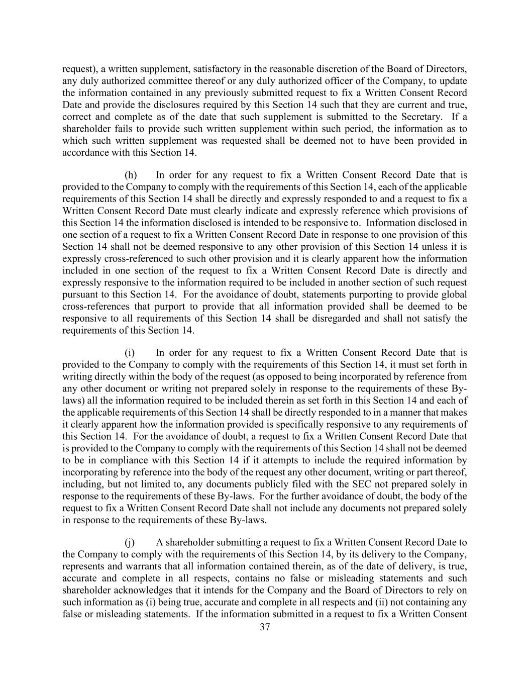37 request), a written supplement, satisfactory in the reasonable discretion of the Board of Directors, any duly authorized committee thereof or any duly authorized officer of the Company, to update the information contained in any previously submitted request to fix a Written Consent Record Date and provide the disclosures required by this Section 14 such that they are current and true, correct and complete as of the date that such supplement is submitted to the Secretary. If a shareholder fails to provide such written supplement within such period, the information as to which such written supplement was requested shall be deemed not to have been provided in accordance with this Section 14. In order for any request to fix a Written Consent Record Date that is provided to the Company to comply with the requirements of this Section 14, each of the applicable requirements of this Section 14 shall be directly and expressly responded to and a request to fix a Written Consent Record Date must clearly indicate and expressly reference which provisions of this Section 14 the information disclosed is intended to be responsive to. Information disclosed in one section of a request to fix a Written Consent Record Date in response to one provision of this Section 14 shall not be deemed responsive to any other provision of this Section 14 unless it is expressly cross-referenced to such other provision and it is clearly apparent how the information included in one section of the request to fix a Written Consent Record Date is directly and expressly responsive to the information required to be included in another section of such request pursuant to this Section 14. For the avoidance of doubt, statements purporting to provide global cross-references that purport to provide that all information provided shall be deemed to be responsive to all requirements of this Section 14 shall be disregarded and shall not satisfy the requirements of this Section 14. In order for any request to fix a Written Consent Record Date that is provided to the Company to comply with the requirements of this Section 14, it must set forth in writing directly within the body of the request (as opposed to being incorporated by reference from any other document or writing not prepared solely in response to the requirements of these By- laws) all the information required to be included therein as set forth in this Section 14 and each of the applicable requirements of this Section 14 shall be directly responded to in a manner that makes it clearly apparent how the information provided is specifically responsive to any requirements of this Section 14. For the avoidance of doubt, a request to fix a Written Consent Record Date that is provided to the Company to comply with the requirements of this Section 14 shall not be deemed to be in compliance with this Section 14 if it attempts to include the required information by incorporating by reference into the body of the request any other document, writing or part thereof, including, but not limited to, any documents publicly filed with the SEC not prepared solely in response to the requirements of these By-laws. For the further avoidance of doubt, the body of the request to fix a Written Consent Record Date shall not include any documents not prepared solely in response to the requirements of these By-laws. A shareholder submitting a request to fix a Written Consent Record Date to the Company to comply with the requirements of this Section 14, by its delivery to the Company, represents and warrants that all information contained therein, as of the date of delivery, is true, accurate and complete in all respects, contains no false or misleading statements and such shareholder acknowledges that it intends for the Company and the Board of Directors to rely on such information as (i) being true, accurate and complete in all respects and (ii) not containing any false or misleading statements. If the information submitted in a request to fix a Written Consent