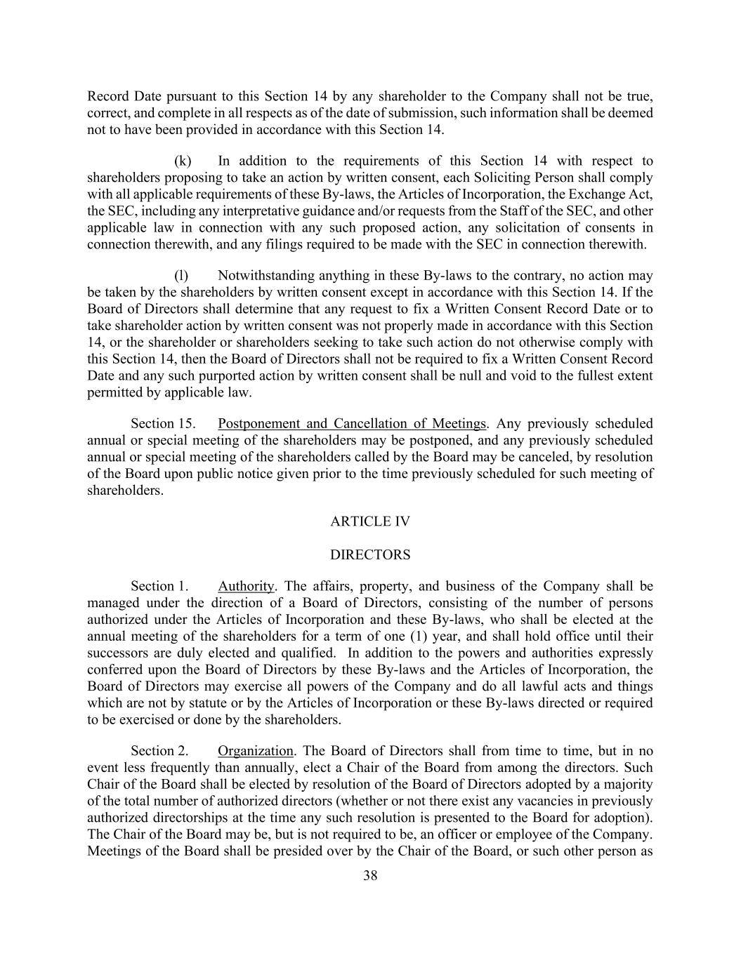 38 Record Date pursuant to this Section 14 by any shareholder to the Company shall not be true, correct, and complete in all respects as of the date of submission, such information shall be deemed not to have been provided in accordance with this Section 14. In addition to the requirements of this Section 14 with respect to shareholders proposing to take an action by written consent, each Soliciting Person shall comply with all applicable requirements of these By-laws, the Articles of Incorporation, the Exchange Act, the SEC, including any interpretative guidance and/or requests from the Staff of the SEC, and other applicable law in connection with any such proposed action, any solicitation of consents in connection therewith, and any filings required to be made with the SEC in connection therewith. Notwithstanding anything in these By-laws to the contrary, no action may be taken by the shareholders by written consent except in accordance with this Section 14. If the Board of Directors shall determine that any request to fix a Written Consent Record Date or to take shareholder action by written consent was not properly made in accordance with this Section 14, or the shareholder or shareholders seeking to take such action do not otherwise comply with this Section 14, then the Board of Directors shall not be required to fix a Written Consent Record Date and any such purported action by written consent shall be null and void to the fullest extent permitted by applicable law. Section 15. Postponement and Cancellation of Meetings. Any previously scheduled annual or special meeting of the shareholders may be postponed, and any previously scheduled annual or special meeting of the shareholders called by the Board may be canceled, by resolution of the Board upon public notice given prior to the time previously scheduled for such meeting of shareholders. ARTICLE IV DIRECTORS Section 1. Authority. The affairs, property, and business of the Company shall be managed under the direction of a Board of Directors, consisting of the number of persons authorized under the Articles of Incorporation and these By-laws, who shall be elected at the annual meeting of the shareholders for a term of one (1) year, and shall hold office until their successors are duly elected and qualified. In addition to the powers and authorities expressly conferred upon the Board of Directors by these By-laws and the Articles of Incorporation, the Board of Directors may exercise all powers of the Company and do all lawful acts and things which are not by statute or by the Articles of Incorporation or these By-laws directed or required to be exercised or done by the shareholders. Section 2. Organization. The Board of Directors shall from time to time, but in no event less frequently than annually, elect a Chair of the Board from among the directors. Such Chair of the Board shall be elected by resolution of the Board of Directors adopted by a majority of the total number of authorized directors (whether or not there exist any vacancies in previously authorized directorships at the time any such resolution is presented to the Board for adoption). The Chair of the Board may be, but is not required to be, an officer or employee of the Company. Meetings of the Board shall be presided over by the Chair of the Board, or such other person as