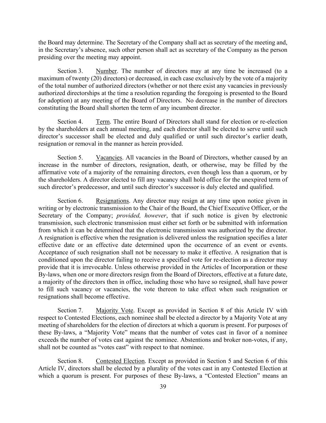 39 the Board may determine. The Secretary of the Company shall act as secretary of the meeting and, in the Secretary’s absence, such other person shall act as secretary of the Company as the person presiding over the meeting may appoint. Section 3. Number. The number of directors may at any time be increased (to a maximum of twenty (20) directors) or decreased, in each case exclusively by the vote of a majority of the total number of authorized directors (whether or not there exist any vacancies in previously authorized directorships at the time a resolution regarding the foregoing is presented to the Board for adoption) at any meeting of the Board of Directors. No decrease in the number of directors constituting the Board shall shorten the term of any incumbent director. Section 4. Term. The entire Board of Directors shall stand for election or re-election by the shareholders at each annual meeting, and each director shall be elected to serve until such director’s successor shall be elected and duly qualified or until such director’s earlier death, resignation or removal in the manner as herein provided. Section 5. Vacancies. All vacancies in the Board of Directors, whether caused by an increase in the number of directors, resignation, death, or otherwise, may be filled by the affirmative vote of a majority of the remaining directors, even though less than a quorum, or by the shareholders. A director elected to fill any vacancy shall hold office for the unexpired term of such director’s predecessor, and until such director’s successor is duly elected and qualified. Section 6. Resignations. Any director may resign at any time upon notice given in writing or by electronic transmission to the Chair of the Board, the Chief Executive Officer, or the Secretary of the Company; provided, however, that if such notice is given by electronic transmission, such electronic transmission must either set forth or be submitted with information from which it can be determined that the electronic transmission was authorized by the director. A resignation is effective when the resignation is delivered unless the resignation specifies a later effective date or an effective date determined upon the occurrence of an event or events. Acceptance of such resignation shall not be necessary to make it effective. A resignation that is conditioned upon the director failing to receive a specified vote for re-election as a director may provide that it is irrevocable. Unless otherwise provided in the Articles of Incorporation or these By-laws, when one or more directors resign from the Board of Directors, effective at a future date, a majority of the directors then in office, including those who have so resigned, shall have power to fill such vacancy or vacancies, the vote thereon to take effect when such resignation or resignations shall become effective. Section 7. Majority Vote. Except as provided in Section 8 of this Article IV with respect to Contested Elections, each nominee shall be elected a director by a Majority Vote at any meeting of shareholders for the election of directors at which a quorum is present. For purposes of these By-laws, a “Majority Vote” means that the number of votes cast in favor of a nominee exceeds the number of votes cast against the nominee. Abstentions and broker non-votes, if any, shall not be counted as “votes cast” with respect to that nominee. Section 8. Contested Election. Except as provided in Section 5 and Section 6 of this Article IV, directors shall be elected by a plurality of the votes cast in any Contested Election at which a quorum is present. For purposes of these By-laws, a “Contested Election” means an