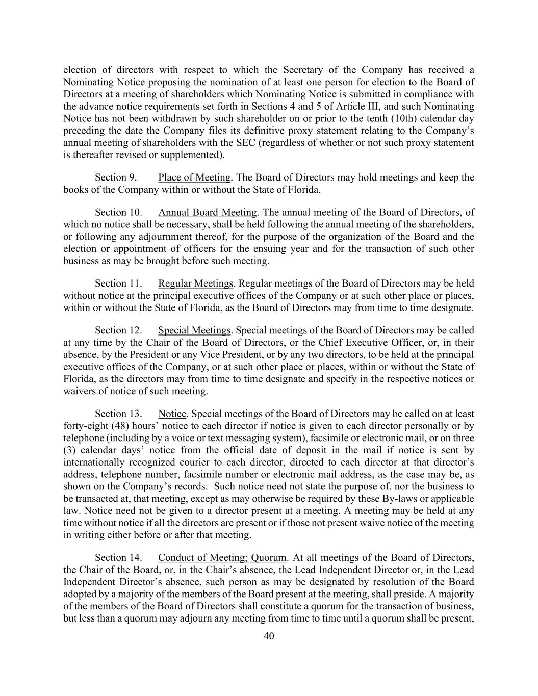 40 election of directors with respect to which the Secretary of the Company has received a Nominating Notice proposing the nomination of at least one person for election to the Board of Directors at a meeting of shareholders which Nominating Notice is submitted in compliance with the advance notice requirements set forth in Sections 4 and 5 of Article III, and such Nominating Notice has not been withdrawn by such shareholder on or prior to the tenth (10th) calendar day preceding the date the Company files its definitive proxy statement relating to the Company’s annual meeting of shareholders with the SEC (regardless of whether or not such proxy statement is thereafter revised or supplemented). Section 9. Place of Meeting. The Board of Directors may hold meetings and keep the books of the Company within or without the State of Florida. Section 10. Annual Board Meeting. The annual meeting of the Board of Directors, of which no notice shall be necessary, shall be held following the annual meeting of the shareholders, or following any adjournment thereof, for the purpose of the organization of the Board and the election or appointment of officers for the ensuing year and for the transaction of such other business as may be brought before such meeting. Section 11. Regular Meetings. Regular meetings of the Board of Directors may be held without notice at the principal executive offices of the Company or at such other place or places, within or without the State of Florida, as the Board of Directors may from time to time designate. Section 12. Special Meetings. Special meetings of the Board of Directors may be called at any time by the Chair of the Board of Directors, or the Chief Executive Officer, or, in their absence, by the President or any Vice President, or by any two directors, to be held at the principal executive offices of the Company, or at such other place or places, within or without the State of Florida, as the directors may from time to time designate and specify in the respective notices or waivers of notice of such meeting. Section 13. Notice. Special meetings of the Board of Directors may be called on at least forty-eight (48) hours’ notice to each director if notice is given to each director personally or by telephone (including by a voice or text messaging system), facsimile or electronic mail, or on three (3) calendar days’ notice from the official date of deposit in the mail if notice is sent by internationally recognized courier to each director, directed to each director at that director’s address, telephone number, facsimile number or electronic mail address, as the case may be, as shown on the Company’s records. Such notice need not state the purpose of, nor the business to be transacted at, that meeting, except as may otherwise be required by these By-laws or applicable law. Notice need not be given to a director present at a meeting. A meeting may be held at any time without notice if all the directors are present or if those not present waive notice of the meeting in writing either before or after that meeting. Section 14. Conduct of Meeting; Quorum. At all meetings of the Board of Directors, the Chair of the Board, or, in the Chair’s absence, the Lead Independent Director or, in the Lead Independent Director’s absence, such person as may be designated by resolution of the Board adopted by a majority of the members of the Board present at the meeting, shall preside. A majority of the members of the Board of Directors shall constitute a quorum for the transaction of business, but less than a quorum may adjourn any meeting from time to time until a quorum shall be present,