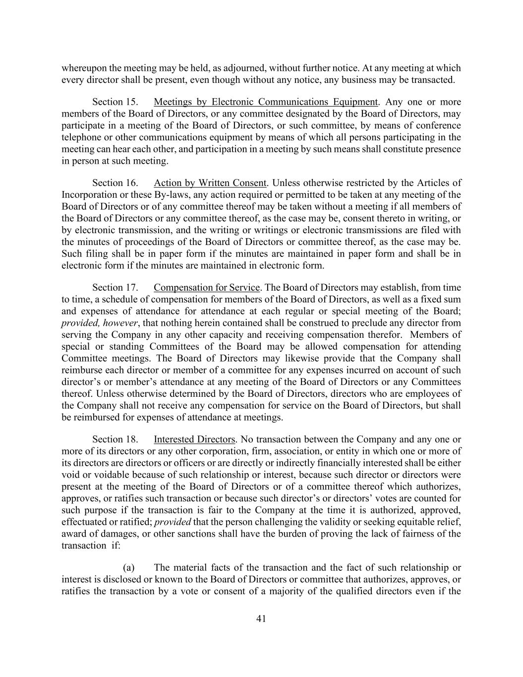 41 whereupon the meeting may be held, as adjourned, without further notice. At any meeting at which every director shall be present, even though without any notice, any business may be transacted. Section 15. Meetings by Electronic Communications Equipment. Any one or more members of the Board of Directors, or any committee designated by the Board of Directors, may participate in a meeting of the Board of Directors, or such committee, by means of conference telephone or other communications equipment by means of which all persons participating in the meeting can hear each other, and participation in a meeting by such means shall constitute presence in person at such meeting. Section 16. Action by Written Consent. Unless otherwise restricted by the Articles of Incorporation or these By-laws, any action required or permitted to be taken at any meeting of the Board of Directors or of any committee thereof may be taken without a meeting if all members of the Board of Directors or any committee thereof, as the case may be, consent thereto in writing, or by electronic transmission, and the writing or writings or electronic transmissions are filed with the minutes of proceedings of the Board of Directors or committee thereof, as the case may be. Such filing shall be in paper form if the minutes are maintained in paper form and shall be in electronic form if the minutes are maintained in electronic form. Section 17. Compensation for Service. The Board of Directors may establish, from time to time, a schedule of compensation for members of the Board of Directors, as well as a fixed sum and expenses of attendance for attendance at each regular or special meeting of the Board; provided, however, that nothing herein contained shall be construed to preclude any director from serving the Company in any other capacity and receiving compensation therefor. Members of special or standing Committees of the Board may be allowed compensation for attending Committee meetings. The Board of Directors may likewise provide that the Company shall reimburse each director or member of a committee for any expenses incurred on account of such director’s or member’s attendance at any meeting of the Board of Directors or any Committees thereof. Unless otherwise determined by the Board of Directors, directors who are employees of the Company shall not receive any compensation for service on the Board of Directors, but shall be reimbursed for expenses of attendance at meetings. Section 18. Interested Directors. No transaction between the Company and any one or more of its directors or any other corporation, firm, association, or entity in which one or more of its directors are directors or officers or are directly or indirectly financially interested shall be either void or voidable because of such relationship or interest, because such director or directors were present at the meeting of the Board of Directors or of a committee thereof which authorizes, approves, or ratifies such transaction or because such director’s or directors’ votes are counted for such purpose if the transaction is fair to the Company at the time it is authorized, approved, effectuated or ratified; provided that the person challenging the validity or seeking equitable relief, award of damages, or other sanctions shall have the burden of proving the lack of fairness of the transaction if: The material facts of the transaction and the fact of such relationship or interest is disclosed or known to the Board of Directors or committee that authorizes, approves, or ratifies the transaction by a vote or consent of a majority of the qualified directors even if the