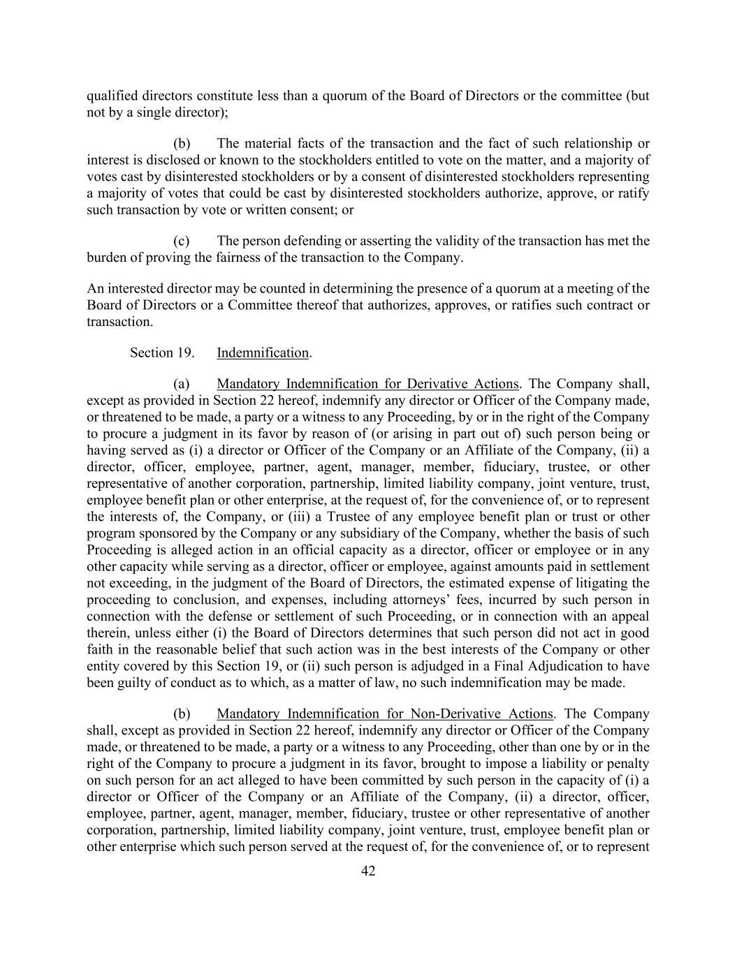 42 qualified directors constitute less than a quorum of the Board of Directors or the committee (but not by a single director); The material facts of the transaction and the fact of such relationship or interest is disclosed or known to the stockholders entitled to vote on the matter, and a majority of votes cast by disinterested stockholders or by a consent of disinterested stockholders representing a majority of votes that could be cast by disinterested stockholders authorize, approve, or ratify such transaction by vote or written consent; or The person defending or asserting the validity of the transaction has met the burden of proving the fairness of the transaction to the Company. An interested director may be counted in determining the presence of a quorum at a meeting of the Board of Directors or a Committee thereof that authorizes, approves, or ratifies such contract or transaction. Section 19. Indemnification. Mandatory Indemnification for Derivative Actions. The Company shall, except as provided in Section 22 hereof, indemnify any director or Officer of the Company made, or threatened to be made, a party or a witness to any Proceeding, by or in the right of the Company to procure a judgment in its favor by reason of (or arising in part out of) such person being or having served as (i) a director or Officer of the Company or an Affiliate of the Company, (ii) a director, officer, employee, partner, agent, manager, member, fiduciary, trustee, or other representative of another corporation, partnership, limited liability company, joint venture, trust, employee benefit plan or other enterprise, at the request of, for the convenience of, or to represent the interests of, the Company, or (iii) a Trustee of any employee benefit plan or trust or other program sponsored by the Company or any subsidiary of the Company, whether the basis of such Proceeding is alleged action in an official capacity as a director, officer or employee or in any other capacity while serving as a director, officer or employee, against amounts paid in settlement not exceeding, in the judgment of the Board of Directors, the estimated expense of litigating the proceeding to conclusion, and expenses, including attorneys’ fees, incurred by such person in connection with the defense or settlement of such Proceeding, or in connection with an appeal therein, unless either (i) the Board of Directors determines that such person did not act in good faith in the reasonable belief that such action was in the best interests of the Company or other entity covered by this Section 19, or (ii) such person is adjudged in a Final Adjudication to have been guilty of conduct as to which, as a matter of law, no such indemnification may be made. Mandatory Indemnification for Non-Derivative Actions. The Company shall, except as provided in Section 22 hereof, indemnify any director or Officer of the Company made, or threatened to be made, a party or a witness to any Proceeding, other than one by or in the right of the Company to procure a judgment in its favor, brought to impose a liability or penalty on such person for an act alleged to have been committed by such person in the capacity of (i) a director or Officer of the Company or an Affiliate of the Company, (ii) a director, officer, employee, partner, agent, manager, member, fiduciary, trustee or other representative of another corporation, partnership, limited liability company, joint venture, trust, employee benefit plan or other enterprise which such person served at the request of, for the convenience of, or to represent