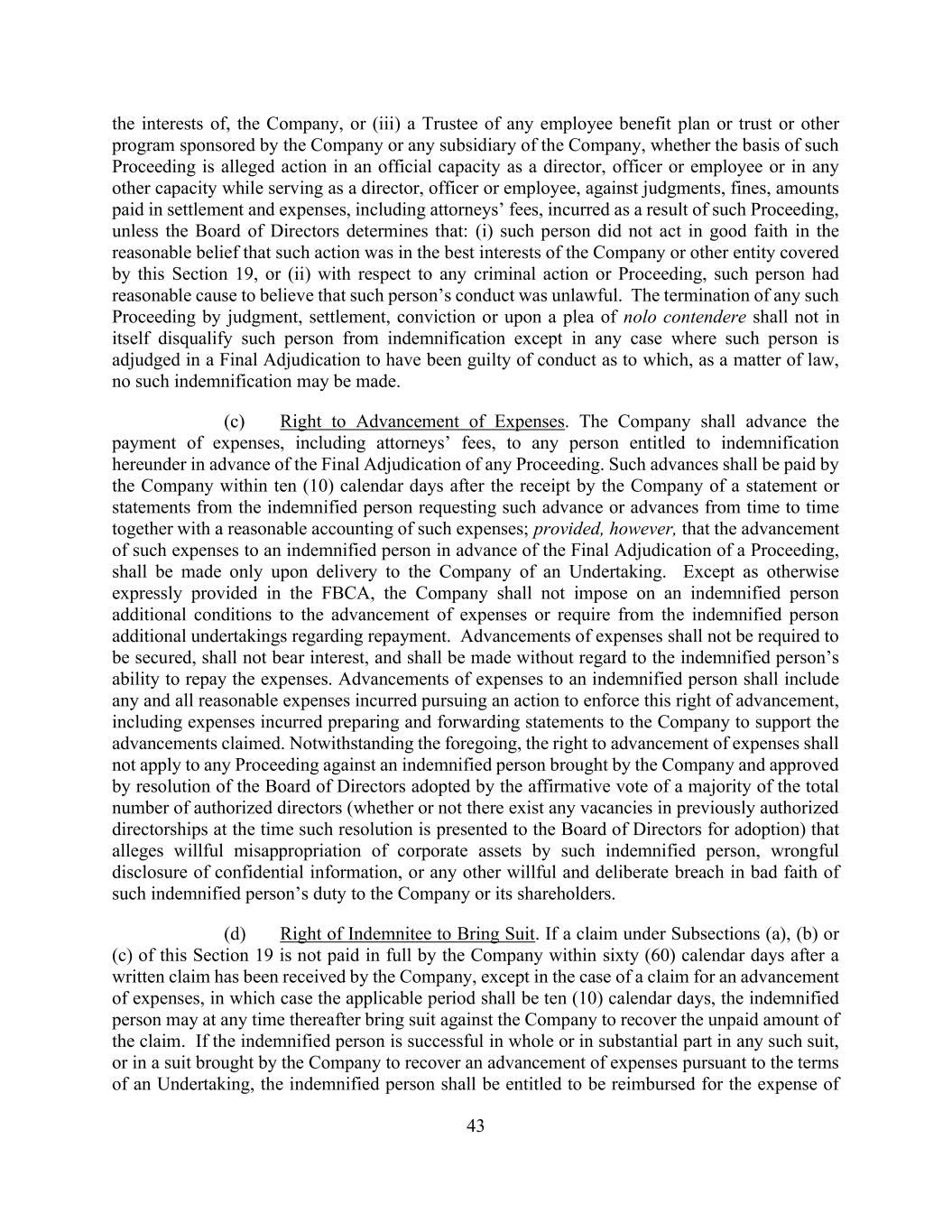 43 the interests of, the Company, or (iii) a Trustee of any employee benefit plan or trust or other program sponsored by the Company or any subsidiary of the Company, whether the basis of such Proceeding is alleged action in an official capacity as a director, officer or employee or in any other capacity while serving as a director, officer or employee, against judgments, fines, amounts paid in settlement and expenses, including attorneys’ fees, incurred as a result of such Proceeding, unless the Board of Directors determines that: (i) such person did not act in good faith in the reasonable belief that such action was in the best interests of the Company or other entity covered by this Section 19, or (ii) with respect to any criminal action or Proceeding, such person had reasonable cause to believe that such person’s conduct was unlawful. The termination of any such Proceeding by judgment, settlement, conviction or upon a plea of nolo contendere shall not in itself disqualify such person from indemnification except in any case where such person is adjudged in a Final Adjudication to have been guilty of conduct as to which, as a matter of law, no such indemnification may be made. Right to Advancement of Expenses. The Company shall advance the payment of expenses, including attorneys’ fees, to any person entitled to indemnification hereunder in advance of the Final Adjudication of any Proceeding. Such advances shall be paid by the Company within ten (10) calendar days after the receipt by the Company of a statement or statements from the indemnified person requesting such advance or advances from time to time together with a reasonable accounting of such expenses; provided, however, that the advancement of such expenses to an indemnified person in advance of the Final Adjudication of a Proceeding, shall be made only upon delivery to the Company of an Undertaking. Except as otherwise expressly provided in the FBCA, the Company shall not impose on an indemnified person additional conditions to the advancement of expenses or require from the indemnified person additional undertakings regarding repayment. Advancements of expenses shall not be required to be secured, shall not bear interest, and shall be made without regard to the indemnified person’s ability to repay the expenses. Advancements of expenses to an indemnified person shall include any and all reasonable expenses incurred pursuing an action to enforce this right of advancement, including expenses incurred preparing and forwarding statements to the Company to support the advancements claimed. Notwithstanding the foregoing, the right to advancement of expenses shall not apply to any Proceeding against an indemnified person brought by the Company and approved by resolution of the Board of Directors adopted by the affirmative vote of a majority of the total number of authorized directors (whether or not there exist any vacancies in previously authorized directorships at the time such resolution is presented to the Board of Directors for adoption) that alleges willful misappropriation of corporate assets by such indemnified person, wrongful disclosure of confidential information, or any other willful and deliberate breach in bad faith of such indemnified person’s duty to the Company or its shareholders. Right of Indemnitee to Bring Suit. If a claim under Subsections (a), (b) or (c) of this Section 19 is not paid in full by the Company within sixty (60) calendar days after a written claim has been received by the Company, except in the case of a claim for an advancement of expenses, in which case the applicable period shall be ten (10) calendar days, the indemnified person may at any time thereafter bring suit against the Company to recover the unpaid amount of the claim. If the indemnified person is successful in whole or in substantial part in any such suit, or in a suit brought by the Company to recover an advancement of expenses pursuant to the terms of an Undertaking, the indemnified person shall be entitled to be reimbursed for the expense of