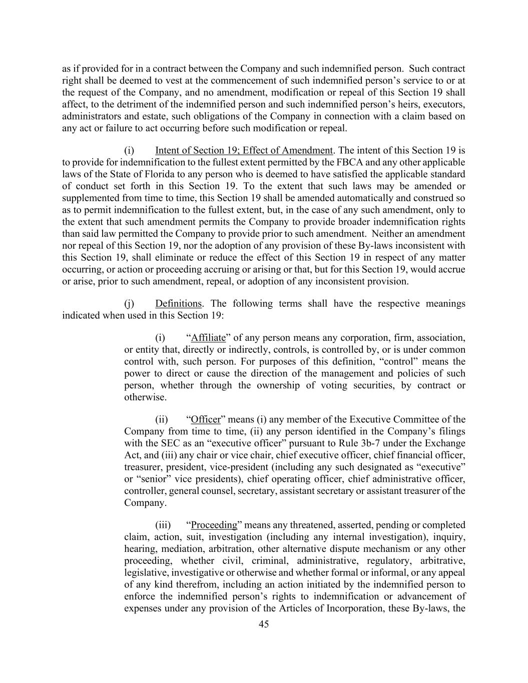 45 as if provided for in a contract between the Company and such indemnified person. Such contract right shall be deemed to vest at the commencement of such indemnified person’s service to or at the request of the Company, and no amendment, modification or repeal of this Section 19 shall affect, to the detriment of the indemnified person and such indemnified person’s heirs, executors, administrators and estate, such obligations of the Company in connection with a claim based on any act or failure to act occurring before such modification or repeal. Intent of Section 19; Effect of Amendment. The intent of this Section 19 is to provide for indemnification to the fullest extent permitted by the FBCA and any other applicable laws of the State of Florida to any person who is deemed to have satisfied the applicable standard of conduct set forth in this Section 19. To the extent that such laws may be amended or supplemented from time to time, this Section 19 shall be amended automatically and construed so as to permit indemnification to the fullest extent, but, in the case of any such amendment, only to the extent that such amendment permits the Company to provide broader indemnification rights than said law permitted the Company to provide prior to such amendment. Neither an amendment nor repeal of this Section 19, nor the adoption of any provision of these By-laws inconsistent with this Section 19, shall eliminate or reduce the effect of this Section 19 in respect of any matter occurring, or action or proceeding accruing or arising or that, but for this Section 19, would accrue or arise, prior to such amendment, repeal, or adoption of any inconsistent provision. Definitions. The following terms shall have the respective meanings indicated when used in this Section 19: (i) “Affiliate” of any person means any corporation, firm, association, or entity that, directly or indirectly, controls, is controlled by, or is under common control with, such person. For purposes of this definition, “control” means the power to direct or cause the direction of the management and policies of such person, whether through the ownership of voting securities, by contract or otherwise. (ii) “Officer” means (i) any member of the Executive Committee of the Company from time to time, (ii) any person identified in the Company’s filings with the SEC as an “executive officer” pursuant to Rule 3b-7 under the Exchange Act, and (iii) any chair or vice chair, chief executive officer, chief financial officer, treasurer, president, vice-president (including any such designated as “executive” or “senior” vice presidents), chief operating officer, chief administrative officer, controller, general counsel, secretary, assistant secretary or assistant treasurer of the Company. (iii) “Proceeding” means any threatened, asserted, pending or completed claim, action, suit, investigation (including any internal investigation), inquiry, hearing, mediation, arbitration, other alternative dispute mechanism or any other proceeding, whether civil, criminal, administrative, regulatory, arbitrative, legislative, investigative or otherwise and whether formal or informal, or any appeal of any kind therefrom, including an action initiated by the indemnified person to enforce the indemnified person’s rights to indemnification or advancement of expenses under any provision of the Articles of Incorporation, these By-laws, the