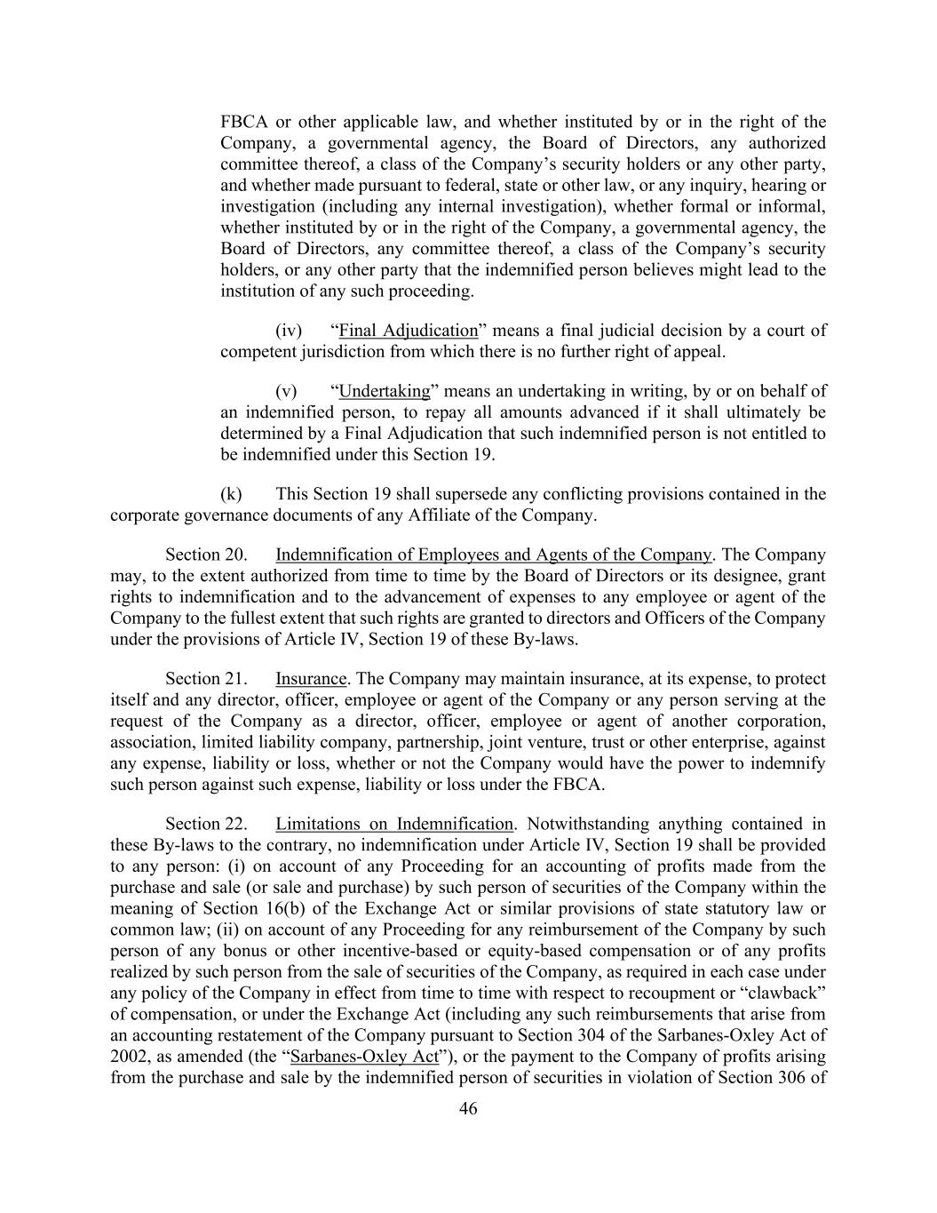 46 FBCA or other applicable law, and whether instituted by or in the right of the Company, a governmental agency, the Board of Directors, any authorized committee thereof, a class of the Company’s security holders or any other party, and whether made pursuant to federal, state or other law, or any inquiry, hearing or investigation (including any internal investigation), whether formal or informal, whether instituted by or in the right of the Company, a governmental agency, the Board of Directors, any committee thereof, a class of the Company’s security holders, or any other party that the indemnified person believes might lead to the institution of any such proceeding. (iv) “Final Adjudication” means a final judicial decision by a court of competent jurisdiction from which there is no further right of appeal. (v) “Undertaking” means an undertaking in writing, by or on behalf of an indemnified person, to repay all amounts advanced if it shall ultimately be determined by a Final Adjudication that such indemnified person is not entitled to be indemnified under this Section 19. This Section 19 shall supersede any conflicting provisions contained in the corporate governance documents of any Affiliate of the Company. Section 20. Indemnification of Employees and Agents of the Company. The Company may, to the extent authorized from time to time by the Board of Directors or its designee, grant rights to indemnification and to the advancement of expenses to any employee or agent of the Company to the fullest extent that such rights are granted to directors and Officers of the Company under the provisions of Article IV, Section 19 of these By-laws. Section 21. Insurance. The Company may maintain insurance, at its expense, to protect itself and any director, officer, employee or agent of the Company or any person serving at the request of the Company as a director, officer, employee or agent of another corporation, association, limited liability company, partnership, joint venture, trust or other enterprise, against any expense, liability or loss, whether or not the Company would have the power to indemnify such person against such expense, liability or loss under the FBCA. Section 22. Limitations on Indemnification. Notwithstanding anything contained in these By-laws to the contrary, no indemnification under Article IV, Section 19 shall be provided to any person: (i) on account of any Proceeding for an accounting of profits made from the purchase and sale (or sale and purchase) by such person of securities of the Company within the meaning of Section 16(b) of the Exchange Act or similar provisions of state statutory law or common law; (ii) on account of any Proceeding for any reimbursement of the Company by such person of any bonus or other incentive-based or equity-based compensation or of any profits realized by such person from the sale of securities of the Company, as required in each case under any policy of the Company in effect from time to time with respect to recoupment or “clawback” of compensation, or under the Exchange Act (including any such reimbursements that arise from an accounting restatement of the Company pursuant to Section 304 of the Sarbanes-Oxley Act of 2002, as amended (the “Sarbanes-Oxley Act”), or the payment to the Company of profits arising from the purchase and sale by the indemnified person of securities in violation of Section 306 of