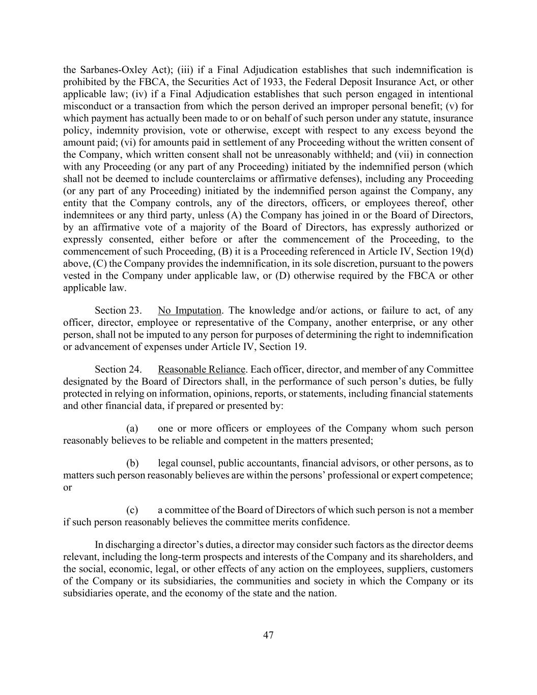47 the Sarbanes-Oxley Act); (iii) if a Final Adjudication establishes that such indemnification is prohibited by the FBCA, the Securities Act of 1933, the Federal Deposit Insurance Act, or other applicable law; (iv) if a Final Adjudication establishes that such person engaged in intentional misconduct or a transaction from which the person derived an improper personal benefit; (v) for which payment has actually been made to or on behalf of such person under any statute, insurance policy, indemnity provision, vote or otherwise, except with respect to any excess beyond the amount paid; (vi) for amounts paid in settlement of any Proceeding without the written consent of the Company, which written consent shall not be unreasonably withheld; and (vii) in connection with any Proceeding (or any part of any Proceeding) initiated by the indemnified person (which shall not be deemed to include counterclaims or affirmative defenses), including any Proceeding (or any part of any Proceeding) initiated by the indemnified person against the Company, any entity that the Company controls, any of the directors, officers, or employees thereof, other indemnitees or any third party, unless (A) the Company has joined in or the Board of Directors, by an affirmative vote of a majority of the Board of Directors, has expressly authorized or expressly consented, either before or after the commencement of the Proceeding, to the commencement of such Proceeding, (B) it is a Proceeding referenced in Article IV, Section 19(d) above, (C) the Company provides the indemnification, in its sole discretion, pursuant to the powers vested in the Company under applicable law, or (D) otherwise required by the FBCA or other applicable law. Section 23. No Imputation. The knowledge and/or actions, or failure to act, of any officer, director, employee or representative of the Company, another enterprise, or any other person, shall not be imputed to any person for purposes of determining the right to indemnification or advancement of expenses under Article IV, Section 19. Section 24. Reasonable Reliance. Each officer, director, and member of any Committee designated by the Board of Directors shall, in the performance of such person’s duties, be fully protected in relying on information, opinions, reports, or statements, including financial statements and other financial data, if prepared or presented by: one or more officers or employees of the Company whom such person reasonably believes to be reliable and competent in the matters presented; legal counsel, public accountants, financial advisors, or other persons, as to matters such person reasonably believes are within the persons’ professional or expert competence; or a committee of the Board of Directors of which such person is not a member if such person reasonably believes the committee merits confidence. In discharging a director’s duties, a director may consider such factors as the director deems relevant, including the long-term prospects and interests of the Company and its shareholders, and the social, economic, legal, or other effects of any action on the employees, suppliers, customers of the Company or its subsidiaries, the communities and society in which the Company or its subsidiaries operate, and the economy of the state and the nation.