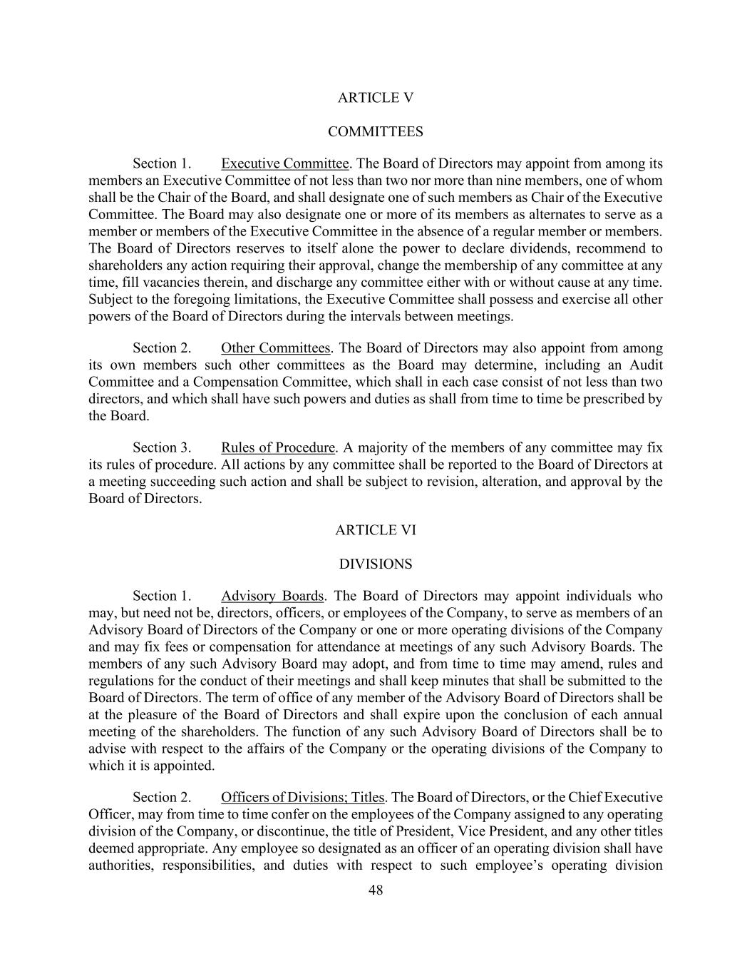48 ARTICLE V COMMITTEES Section 1. Executive Committee. The Board of Directors may appoint from among its members an Executive Committee of not less than two nor more than nine members, one of whom shall be the Chair of the Board, and shall designate one of such members as Chair of the Executive Committee. The Board may also designate one or more of its members as alternates to serve as a member or members of the Executive Committee in the absence of a regular member or members. The Board of Directors reserves to itself alone the power to declare dividends, recommend to shareholders any action requiring their approval, change the membership of any committee at any time, fill vacancies therein, and discharge any committee either with or without cause at any time. Subject to the foregoing limitations, the Executive Committee shall possess and exercise all other powers of the Board of Directors during the intervals between meetings. Section 2. Other Committees. The Board of Directors may also appoint from among its own members such other committees as the Board may determine, including an Audit Committee and a Compensation Committee, which shall in each case consist of not less than two directors, and which shall have such powers and duties as shall from time to time be prescribed by the Board. Section 3. Rules of Procedure. A majority of the members of any committee may fix its rules of procedure. All actions by any committee shall be reported to the Board of Directors at a meeting succeeding such action and shall be subject to revision, alteration, and approval by the Board of Directors. ARTICLE VI DIVISIONS Section 1. Advisory Boards. The Board of Directors may appoint individuals who may, but need not be, directors, officers, or employees of the Company, to serve as members of an Advisory Board of Directors of the Company or one or more operating divisions of the Company and may fix fees or compensation for attendance at meetings of any such Advisory Boards. The members of any such Advisory Board may adopt, and from time to time may amend, rules and regulations for the conduct of their meetings and shall keep minutes that shall be submitted to the Board of Directors. The term of office of any member of the Advisory Board of Directors shall be at the pleasure of the Board of Directors and shall expire upon the conclusion of each annual meeting of the shareholders. The function of any such Advisory Board of Directors shall be to advise with respect to the affairs of the Company or the operating divisions of the Company to which it is appointed. Section 2. Officers of Divisions; Titles. The Board of Directors, or the Chief Executive Officer, may from time to time confer on the employees of the Company assigned to any operating division of the Company, or discontinue, the title of President, Vice President, and any other titles deemed appropriate. Any employee so designated as an officer of an operating division shall have authorities, responsibilities, and duties with respect to such employee’s operating division