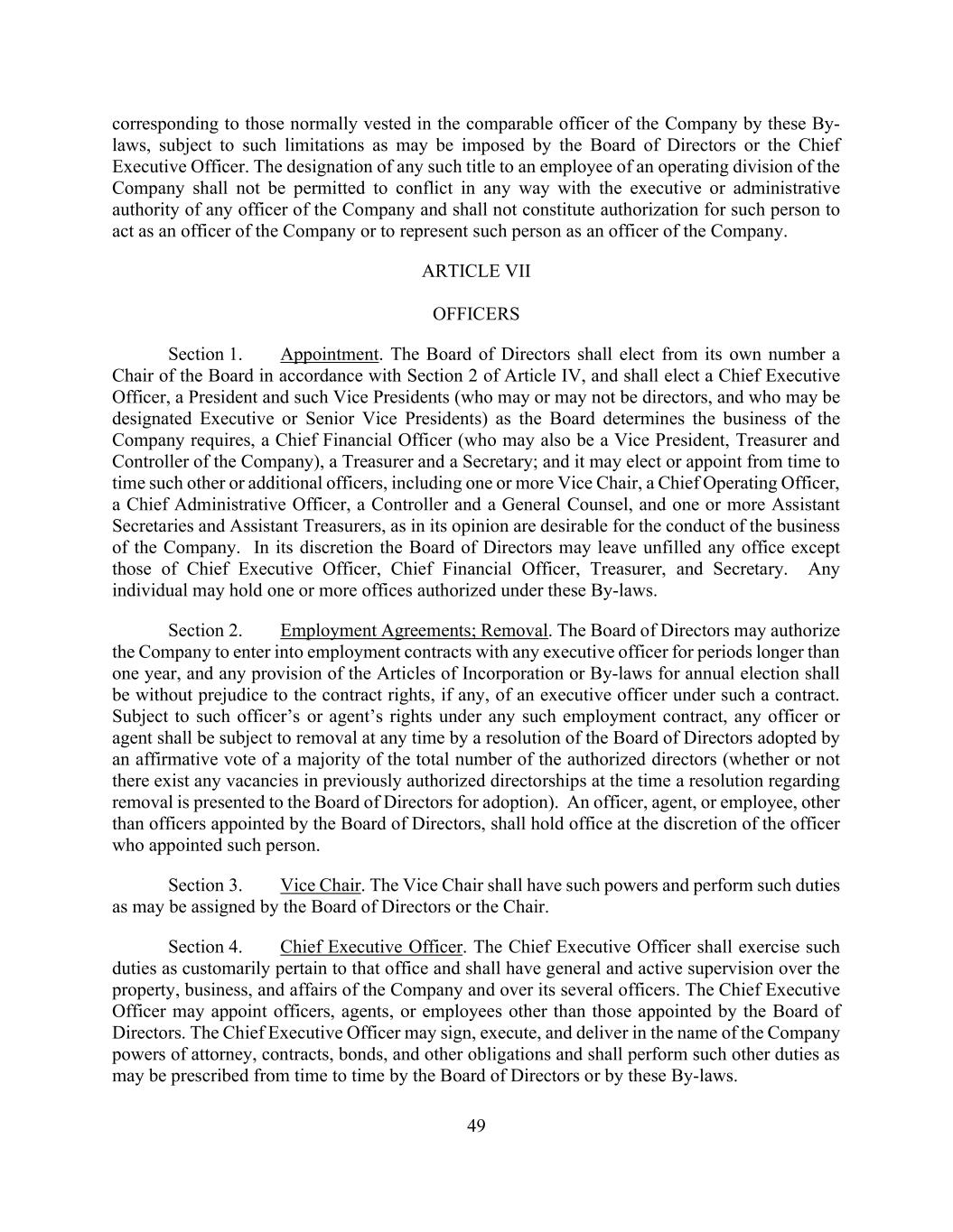 49 corresponding to those normally vested in the comparable officer of the Company by these By- laws, subject to such limitations as may be imposed by the Board of Directors or the Chief Executive Officer. The designation of any such title to an employee of an operating division of the Company shall not be permitted to conflict in any way with the executive or administrative authority of any officer of the Company and shall not constitute authorization for such person to act as an officer of the Company or to represent such person as an officer of the Company. ARTICLE VII OFFICERS Section 1. Appointment. The Board of Directors shall elect from its own number a Chair of the Board in accordance with Section 2 of Article IV, and shall elect a Chief Executive Officer, a President and such Vice Presidents (who may or may not be directors, and who may be designated Executive or Senior Vice Presidents) as the Board determines the business of the Company requires, a Chief Financial Officer (who may also be a Vice President, Treasurer and Controller of the Company), a Treasurer and a Secretary; and it may elect or appoint from time to time such other or additional officers, including one or more Vice Chair, a Chief Operating Officer, a Chief Administrative Officer, a Controller and a General Counsel, and one or more Assistant Secretaries and Assistant Treasurers, as in its opinion are desirable for the conduct of the business of the Company. In its discretion the Board of Directors may leave unfilled any office except those of Chief Executive Officer, Chief Financial Officer, Treasurer, and Secretary. Any individual may hold one or more offices authorized under these By-laws. Section 2. Employment Agreements; Removal. The Board of Directors may authorize the Company to enter into employment contracts with any executive officer for periods longer than one year, and any provision of the Articles of Incorporation or By-laws for annual election shall be without prejudice to the contract rights, if any, of an executive officer under such a contract. Subject to such officer’s or agent’s rights under any such employment contract, any officer or agent shall be subject to removal at any time by a resolution of the Board of Directors adopted by an affirmative vote of a majority of the total number of the authorized directors (whether or not there exist any vacancies in previously authorized directorships at the time a resolution regarding removal is presented to the Board of Directors for adoption). An officer, agent, or employee, other than officers appointed by the Board of Directors, shall hold office at the discretion of the officer who appointed such person. Section 3. Vice Chair. The Vice Chair shall have such powers and perform such duties as may be assigned by the Board of Directors or the Chair. Section 4. Chief Executive Officer. The Chief Executive Officer shall exercise such duties as customarily pertain to that office and shall have general and active supervision over the property, business, and affairs of the Company and over its several officers. The Chief Executive Officer may appoint officers, agents, or employees other than those appointed by the Board of Directors. The Chief Executive Officer may sign, execute, and deliver in the name of the Company powers of attorney, contracts, bonds, and other obligations and shall perform such other duties as may be prescribed from time to time by the Board of Directors or by these By-laws.