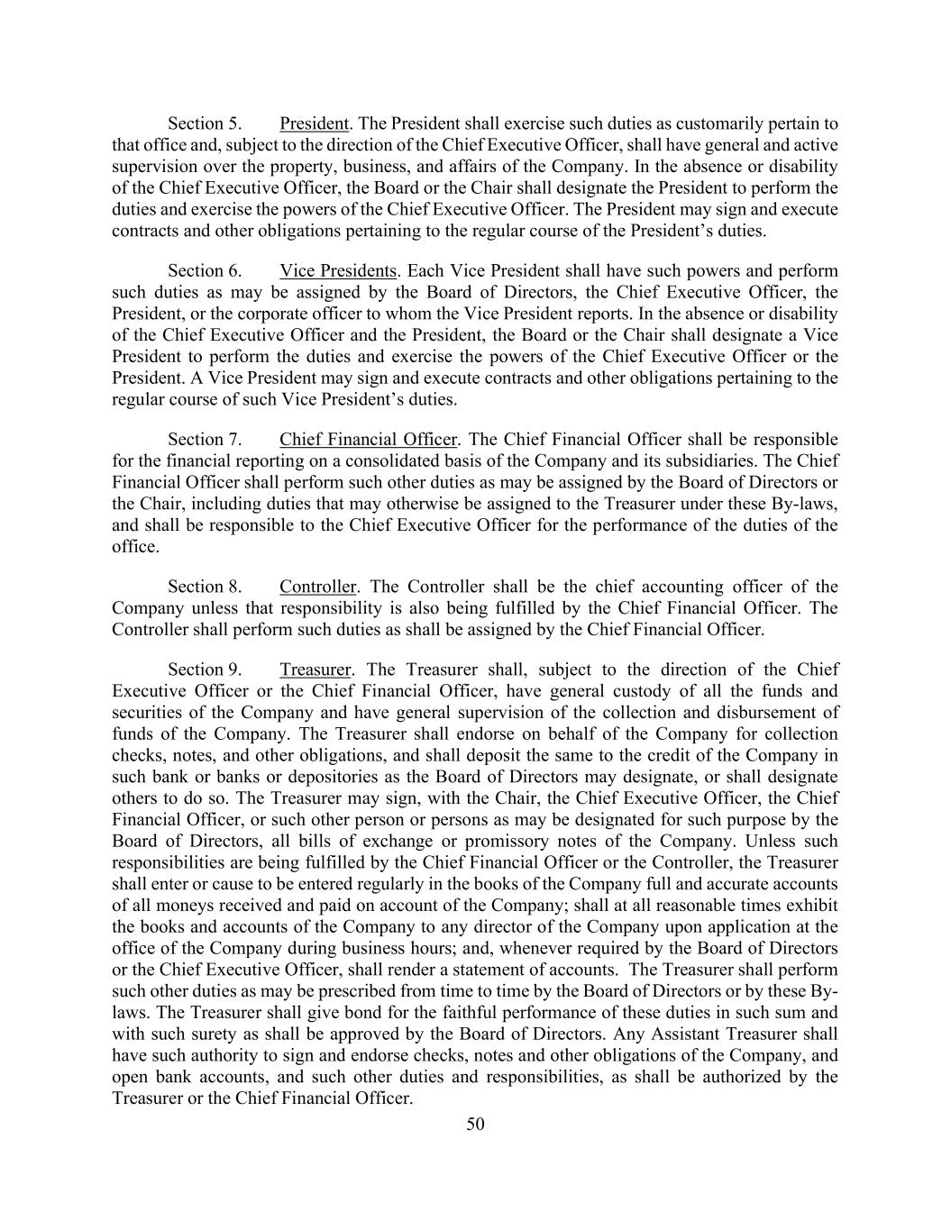 50 Section 5. President. The President shall exercise such duties as customarily pertain to that office and, subject to the direction of the Chief Executive Officer, shall have general and active supervision over the property, business, and affairs of the Company. In the absence or disability of the Chief Executive Officer, the Board or the Chair shall designate the President to perform the duties and exercise the powers of the Chief Executive Officer. The President may sign and execute contracts and other obligations pertaining to the regular course of the President’s duties. Section 6. Vice Presidents. Each Vice President shall have such powers and perform such duties as may be assigned by the Board of Directors, the Chief Executive Officer, the President, or the corporate officer to whom the Vice President reports. In the absence or disability of the Chief Executive Officer and the President, the Board or the Chair shall designate a Vice President to perform the duties and exercise the powers of the Chief Executive Officer or the President. A Vice President may sign and execute contracts and other obligations pertaining to the regular course of such Vice President’s duties. Section 7. Chief Financial Officer. The Chief Financial Officer shall be responsible for the financial reporting on a consolidated basis of the Company and its subsidiaries. The Chief Financial Officer shall perform such other duties as may be assigned by the Board of Directors or the Chair, including duties that may otherwise be assigned to the Treasurer under these By-laws, and shall be responsible to the Chief Executive Officer for the performance of the duties of the office. Section 8. Controller. The Controller shall be the chief accounting officer of the Company unless that responsibility is also being fulfilled by the Chief Financial Officer. The Controller shall perform such duties as shall be assigned by the Chief Financial Officer. Section 9. Treasurer. The Treasurer shall, subject to the direction of the Chief Executive Officer or the Chief Financial Officer, have general custody of all the funds and securities of the Company and have general supervision of the collection and disbursement of funds of the Company. The Treasurer shall endorse on behalf of the Company for collection checks, notes, and other obligations, and shall deposit the same to the credit of the Company in such bank or banks or depositories as the Board of Directors may designate, or shall designate others to do so. The Treasurer may sign, with the Chair, the Chief Executive Officer, the Chief Financial Officer, or such other person or persons as may be designated for such purpose by the Board of Directors, all bills of exchange or promissory notes of the Company. Unless such responsibilities are being fulfilled by the Chief Financial Officer or the Controller, the Treasurer shall enter or cause to be entered regularly in the books of the Company full and accurate accounts of all moneys received and paid on account of the Company; shall at all reasonable times exhibit the books and accounts of the Company to any director of the Company upon application at the office of the Company during business hours; and, whenever required by the Board of Directors or the Chief Executive Officer, shall render a statement of accounts. The Treasurer shall perform such other duties as may be prescribed from time to time by the Board of Directors or by these By- laws. The Treasurer shall give bond for the faithful performance of these duties in such sum and with such surety as shall be approved by the Board of Directors. Any Assistant Treasurer shall have such authority to sign and endorse checks, notes and other obligations of the Company, and open bank accounts, and such other duties and responsibilities, as shall be authorized by the Treasurer or the Chief Financial Officer.