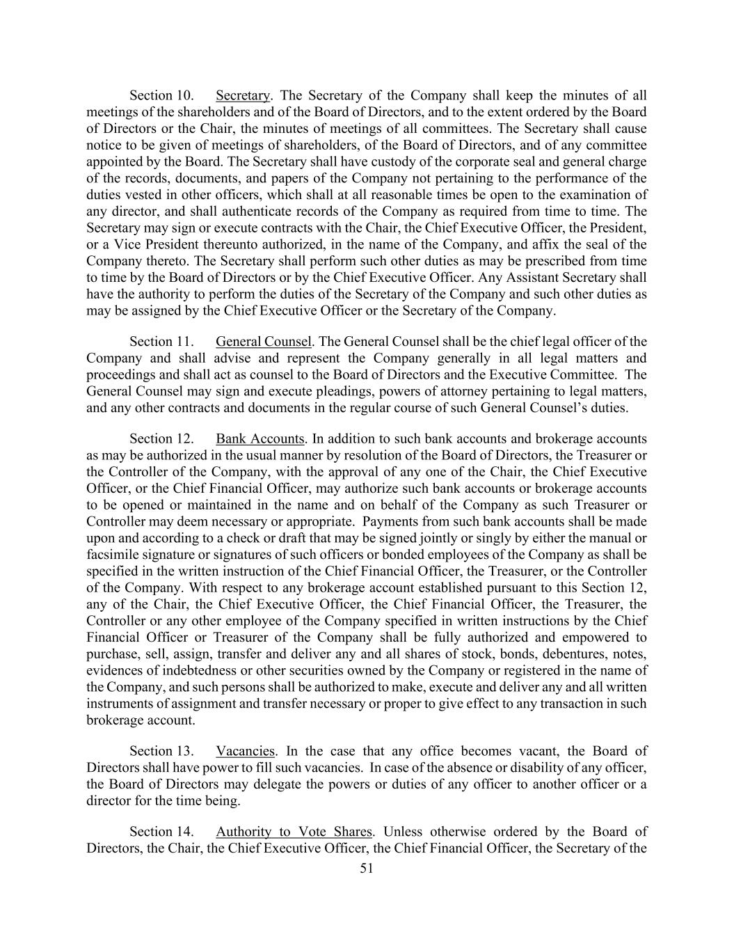 51 Section 10. Secretary. The Secretary of the Company shall keep the minutes of all meetings of the shareholders and of the Board of Directors, and to the extent ordered by the Board of Directors or the Chair, the minutes of meetings of all committees. The Secretary shall cause notice to be given of meetings of shareholders, of the Board of Directors, and of any committee appointed by the Board. The Secretary shall have custody of the corporate seal and general charge of the records, documents, and papers of the Company not pertaining to the performance of the duties vested in other officers, which shall at all reasonable times be open to the examination of any director, and shall authenticate records of the Company as required from time to time. The Secretary may sign or execute contracts with the Chair, the Chief Executive Officer, the President, or a Vice President thereunto authorized, in the name of the Company, and affix the seal of the Company thereto. The Secretary shall perform such other duties as may be prescribed from time to time by the Board of Directors or by the Chief Executive Officer. Any Assistant Secretary shall have the authority to perform the duties of the Secretary of the Company and such other duties as may be assigned by the Chief Executive Officer or the Secretary of the Company. Section 11. General Counsel. The General Counsel shall be the chief legal officer of the Company and shall advise and represent the Company generally in all legal matters and proceedings and shall act as counsel to the Board of Directors and the Executive Committee. The General Counsel may sign and execute pleadings, powers of attorney pertaining to legal matters, and any other contracts and documents in the regular course of such General Counsel’s duties. Section 12. Bank Accounts. In addition to such bank accounts and brokerage accounts as may be authorized in the usual manner by resolution of the Board of Directors, the Treasurer or the Controller of the Company, with the approval of any one of the Chair, the Chief Executive Officer, or the Chief Financial Officer, may authorize such bank accounts or brokerage accounts to be opened or maintained in the name and on behalf of the Company as such Treasurer or Controller may deem necessary or appropriate. Payments from such bank accounts shall be made upon and according to a check or draft that may be signed jointly or singly by either the manual or facsimile signature or signatures of such officers or bonded employees of the Company as shall be specified in the written instruction of the Chief Financial Officer, the Treasurer, or the Controller of the Company. With respect to any brokerage account established pursuant to this Section 12, any of the Chair, the Chief Executive Officer, the Chief Financial Officer, the Treasurer, the Controller or any other employee of the Company specified in written instructions by the Chief Financial Officer or Treasurer of the Company shall be fully authorized and empowered to purchase, sell, assign, transfer and deliver any and all shares of stock, bonds, debentures, notes, evidences of indebtedness or other securities owned by the Company or registered in the name of the Company, and such persons shall be authorized to make, execute and deliver any and all written instruments of assignment and transfer necessary or proper to give effect to any transaction in such brokerage account. Section 13. Vacancies. In the case that any office becomes vacant, the Board of Directors shall have power to fill such vacancies. In case of the absence or disability of any officer, the Board of Directors may delegate the powers or duties of any officer to another officer or a director for the time being. Section 14. Authority to Vote Shares. Unless otherwise ordered by the Board of Directors, the Chair, the Chief Executive Officer, the Chief Financial Officer, the Secretary of the