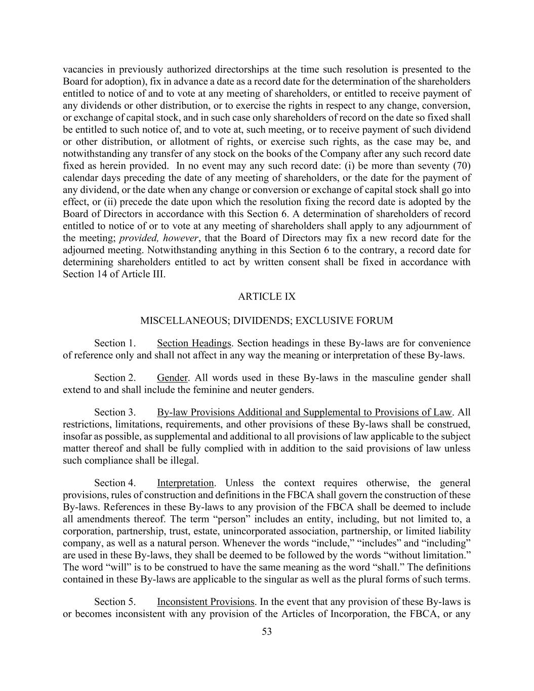 53 vacancies in previously authorized directorships at the time such resolution is presented to the Board for adoption), fix in advance a date as a record date for the determination of the shareholders entitled to notice of and to vote at any meeting of shareholders, or entitled to receive payment of any dividends or other distribution, or to exercise the rights in respect to any change, conversion, or exchange of capital stock, and in such case only shareholders of record on the date so fixed shall be entitled to such notice of, and to vote at, such meeting, or to receive payment of such dividend or other distribution, or allotment of rights, or exercise such rights, as the case may be, and notwithstanding any transfer of any stock on the books of the Company after any such record date fixed as herein provided. In no event may any such record date: (i) be more than seventy (70) calendar days preceding the date of any meeting of shareholders, or the date for the payment of any dividend, or the date when any change or conversion or exchange of capital stock shall go into effect, or (ii) precede the date upon which the resolution fixing the record date is adopted by the Board of Directors in accordance with this Section 6. A determination of shareholders of record entitled to notice of or to vote at any meeting of shareholders shall apply to any adjournment of the meeting; provided, however, that the Board of Directors may fix a new record date for the adjourned meeting. Notwithstanding anything in this Section 6 to the contrary, a record date for determining shareholders entitled to act by written consent shall be fixed in accordance with Section 14 of Article III. ARTICLE IX MISCELLANEOUS; DIVIDENDS; EXCLUSIVE FORUM Section 1. Section Headings. Section headings in these By-laws are for convenience of reference only and shall not affect in any way the meaning or interpretation of these By-laws. Section 2. Gender. All words used in these By-laws in the masculine gender shall extend to and shall include the feminine and neuter genders. Section 3. By-law Provisions Additional and Supplemental to Provisions of Law. All restrictions, limitations, requirements, and other provisions of these By-laws shall be construed, insofar as possible, as supplemental and additional to all provisions of law applicable to the subject matter thereof and shall be fully complied with in addition to the said provisions of law unless such compliance shall be illegal. Section 4. Interpretation. Unless the context requires otherwise, the general provisions, rules of construction and definitions in the FBCA shall govern the construction of these By-laws. References in these By-laws to any provision of the FBCA shall be deemed to include all amendments thereof. The term “person” includes an entity, including, but not limited to, a corporation, partnership, trust, estate, unincorporated association, partnership, or limited liability company, as well as a natural person. Whenever the words “include,” “includes” and “including” are used in these By-laws, they shall be deemed to be followed by the words “without limitation.” The word “will” is to be construed to have the same meaning as the word “shall.” The definitions contained in these By-laws are applicable to the singular as well as the plural forms of such terms. Section 5. Inconsistent Provisions. In the event that any provision of these By-laws is or becomes inconsistent with any provision of the Articles of Incorporation, the FBCA, or any