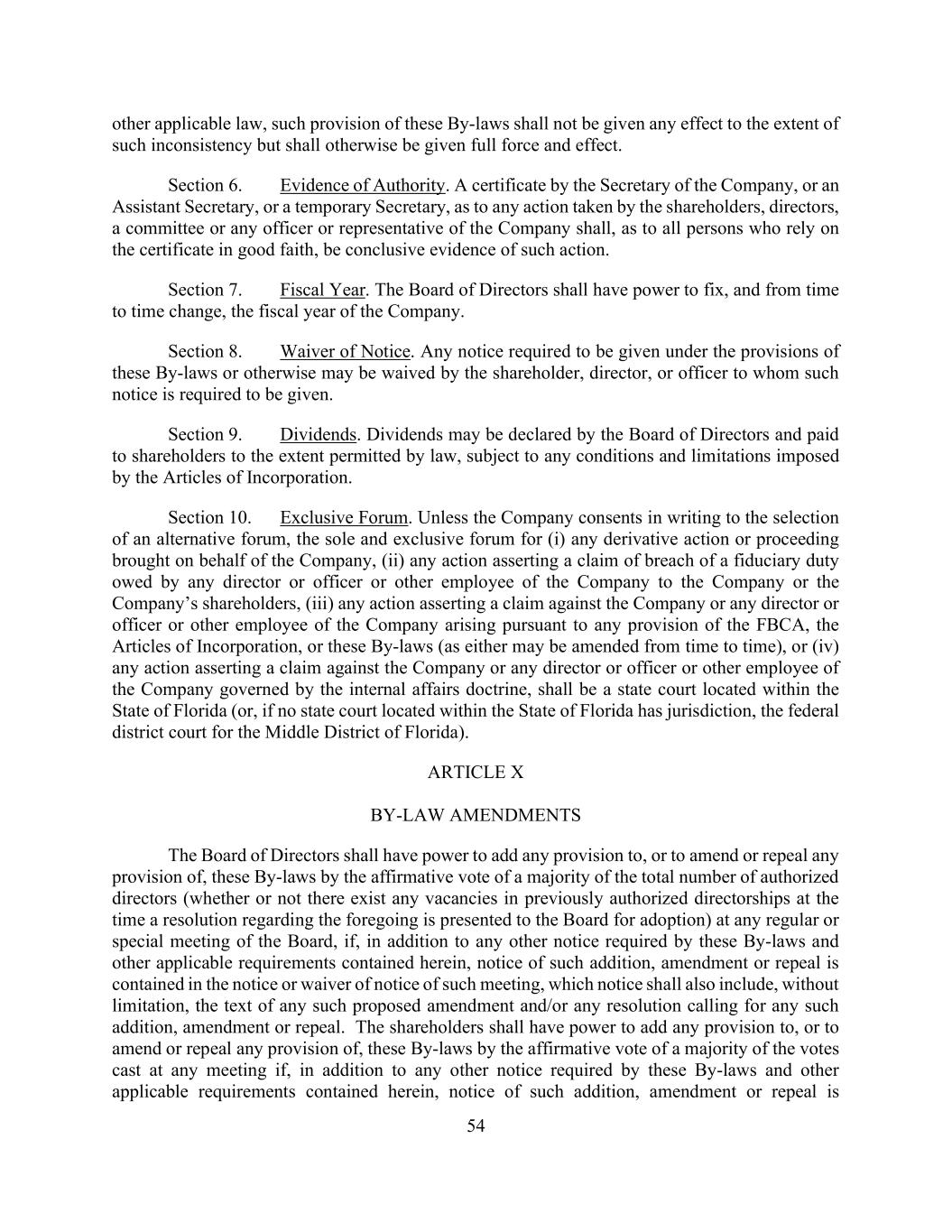 54 other applicable law, such provision of these By-laws shall not be given any effect to the extent of such inconsistency but shall otherwise be given full force and effect. Section 6. Evidence of Authority. A certificate by the Secretary of the Company, or an Assistant Secretary, or a temporary Secretary, as to any action taken by the shareholders, directors, a committee or any officer or representative of the Company shall, as to all persons who rely on the certificate in good faith, be conclusive evidence of such action. Section 7. Fiscal Year. The Board of Directors shall have power to fix, and from time to time change, the fiscal year of the Company. Section 8. Waiver of Notice. Any notice required to be given under the provisions of these By-laws or otherwise may be waived by the shareholder, director, or officer to whom such notice is required to be given. Section 9. Dividends. Dividends may be declared by the Board of Directors and paid to shareholders to the extent permitted by law, subject to any conditions and limitations imposed by the Articles of Incorporation. Section 10. Exclusive Forum. Unless the Company consents in writing to the selection of an alternative forum, the sole and exclusive forum for (i) any derivative action or proceeding brought on behalf of the Company, (ii) any action asserting a claim of breach of a fiduciary duty owed by any director or officer or other employee of the Company to the Company or the Company’s shareholders, (iii) any action asserting a claim against the Company or any director or officer or other employee of the Company arising pursuant to any provision of the FBCA, the Articles of Incorporation, or these By-laws (as either may be amended from time to time), or (iv) any action asserting a claim against the Company or any director or officer or other employee of the Company governed by the internal affairs doctrine, shall be a state court located within the State of Florida (or, if no state court located within the State of Florida has jurisdiction, the federal district court for the Middle District of Florida). ARTICLE X BY-LAW AMENDMENTS The Board of Directors shall have power to add any provision to, or to amend or repeal any provision of, these By-laws by the affirmative vote of a majority of the total number of authorized directors (whether or not there exist any vacancies in previously authorized directorships at the time a resolution regarding the foregoing is presented to the Board for adoption) at any regular or special meeting of the Board, if, in addition to any other notice required by these By-laws and other applicable requirements contained herein, notice of such addition, amendment or repeal is contained in the notice or waiver of notice of such meeting, which notice shall also include, without limitation, the text of any such proposed amendment and/or any resolution calling for any such addition, amendment or repeal. The shareholders shall have power to add any provision to, or to amend or repeal any provision of, these By-laws by the affirmative vote of a majority of the votes cast at any meeting if, in addition to any other notice required by these By-laws and other applicable requirements contained herein, notice of such addition, amendment or repeal is