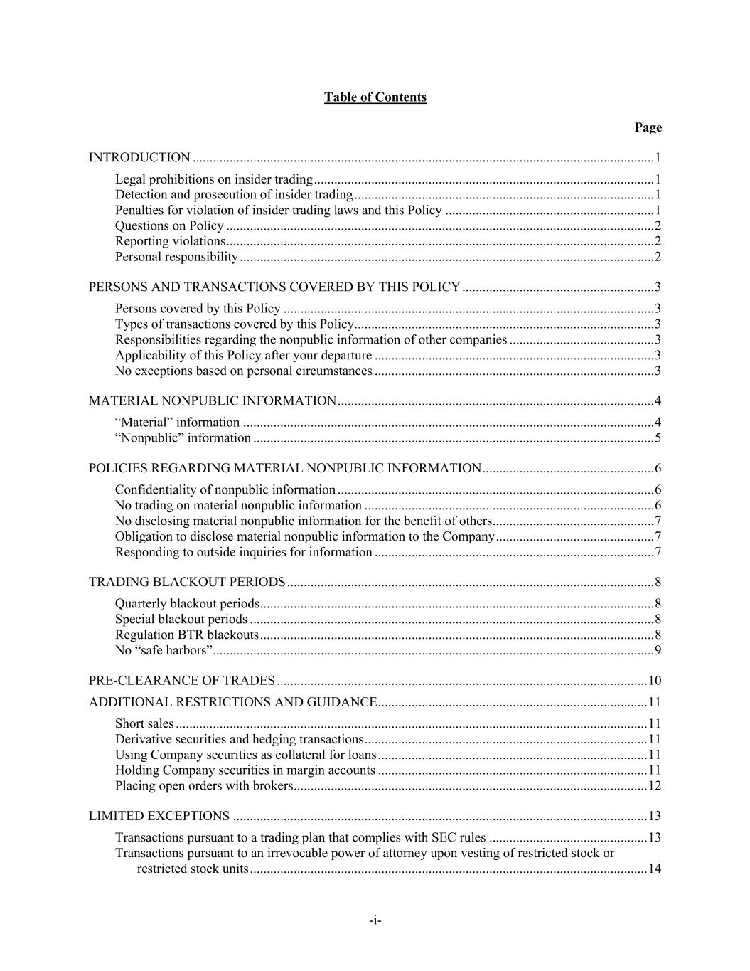 -i- Table of Contents Page INTRODUCTION ......................................................................................................................................... 1 Legal prohibitions on insider trading ..................................................................................................... 1 Detection and prosecution of insider trading ......................................................................................... 1 Penalties for violation of insider trading laws and this Policy .............................................................. 1 Questions on Policy ............................................................................................................................... 2 Reporting violations ............................................................................................................................... 2 Personal responsibility ........................................................................................................................... 2 PERSONS AND TRANSACTIONS COVERED BY THIS POLICY ......................................................... 3 Persons covered by this Policy .............................................................................................................. 3 Types of transactions covered by this Policy ......................................................................................... 3 Responsibilities regarding the nonpublic information of other companies ........................................... 3 Applicability of this Policy after your departure ................................................................................... 3 No exceptions based on personal circumstances ................................................................................... 3 MATERIAL NONPUBLIC INFORMATION .............................................................................................. 4 “Material” information .......................................................................................................................... 4 “Nonpublic” information ....................................................................................................................... 5 POLICIES REGARDING MATERIAL NONPUBLIC INFORMATION ................................................... 6 Confidentiality of nonpublic information .............................................................................................. 6 No trading on material nonpublic information ...................................................................................... 6 No disclosing material nonpublic information for the benefit of others ................................................ 7 Obligation to disclose material nonpublic information to the Company ............................................... 7 Responding to outside inquiries for information ................................................................................... 7 TRADING BLACKOUT PERIODS ............................................................................................................. 8 Quarterly blackout periods ..................................................................................................................... 8 Special blackout periods ........................................................................................................................ 8 Regulation BTR blackouts ..................................................................................................................... 8 No “safe harbors” ................................................................................................................................... 9 PRE-CLEARANCE OF TRADES .............................................................................................................. 10 ADDITIONAL RESTRICTIONS AND GUIDANCE ................................................................................ 11 Short sales ............................................................................................................................................ 11 Derivative securities and hedging transactions .................................................................................... 11 Using Company securities as collateral for loans ................................................................................ 11 Holding Company securities in margin accounts ................................................................................ 11 Placing open orders with brokers ......................................................................................................... 12 LIMITED EXCEPTIONS ........................................................................................................................... 13 Transactions pursuant to a trading plan that complies with SEC rules ............................................... 13 Transactions pursuant to an irrevocable power of attorney upon vesting of restricted stock or restricted stock units ...................................................................................................................... 14
