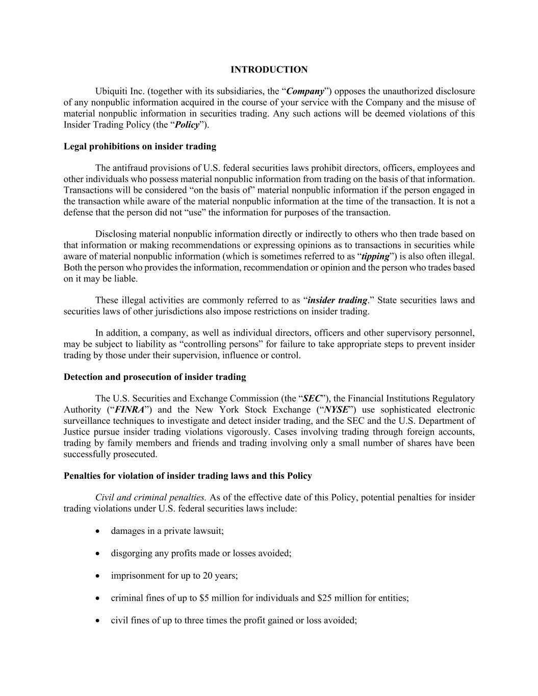 INTRODUCTION Ubiquiti Inc. (together with its subsidiaries, the “Company”) opposes the unauthorized disclosure of any nonpublic information acquired in the course of your service with the Company and the misuse of material nonpublic information in securities trading. Any such actions will be deemed violations of this Insider Trading Policy (the “Policy”). Legal prohibitions on insider trading The antifraud provisions of U.S. federal securities laws prohibit directors, officers, employees and other individuals who possess material nonpublic information from trading on the basis of that information. Transactions will be considered “on the basis of” material nonpublic information if the person engaged in the transaction while aware of the material nonpublic information at the time of the transaction. It is not a defense that the person did not “use” the information for purposes of the transaction. Disclosing material nonpublic information directly or indirectly to others who then trade based on that information or making recommendations or expressing opinions as to transactions in securities while aware of material nonpublic information (which is sometimes referred to as “tipping”) is also often illegal. Both the person who provides the information, recommendation or opinion and the person who trades based on it may be liable. These illegal activities are commonly referred to as “insider trading.” State securities laws and securities laws of other jurisdictions also impose restrictions on insider trading. In addition, a company, as well as individual directors, officers and other supervisory personnel, may be subject to liability as “controlling persons” for failure to take appropriate steps to prevent insider trading by those under their supervision, influence or control. Detection and prosecution of insider trading The U.S. Securities and Exchange Commission (the “SEC”), the Financial Institutions Regulatory Authority (“FINRA”) and the New York Stock Exchange (“NYSE”) use sophisticated electronic surveillance techniques to investigate and detect insider trading, and the SEC and the U.S. Department of Justice pursue insider trading violations vigorously. Cases involving trading through foreign accounts, trading by family members and friends and trading involving only a small number of shares have been successfully prosecuted. Penalties for violation of insider trading laws and this Policy Civil and criminal penalties. As of the effective date of this Policy, potential penalties for insider trading violations under U.S. federal securities laws include: • damages in a private lawsuit; • disgorging any profits made or losses avoided; • imprisonment for up to 20 years; • criminal fines of up to $5 million for individuals and $25 million for entities; • civil fines of up to three times the profit gained or loss avoided;