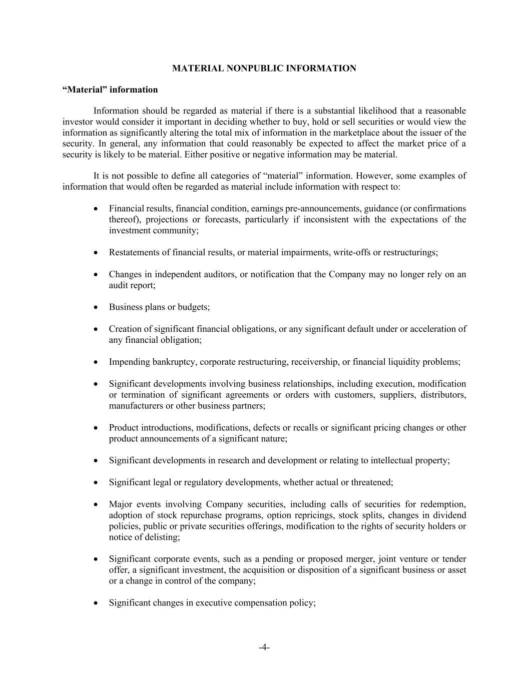 -4- MATERIAL NONPUBLIC INFORMATION “Material” information Information should be regarded as material if there is a substantial likelihood that a reasonable investor would consider it important in deciding whether to buy, hold or sell securities or would view the information as significantly altering the total mix of information in the marketplace about the issuer of the security. In general, any information that could reasonably be expected to affect the market price of a security is likely to be material. Either positive or negative information may be material. It is not possible to define all categories of “material” information. However, some examples of information that would often be regarded as material include information with respect to: • Financial results, financial condition, earnings pre-announcements, guidance (or confirmations thereof), projections or forecasts, particularly if inconsistent with the expectations of the investment community; • Restatements of financial results, or material impairments, write-offs or restructurings; • Changes in independent auditors, or notification that the Company may no longer rely on an audit report; • Business plans or budgets; • Creation of significant financial obligations, or any significant default under or acceleration of any financial obligation; • Impending bankruptcy, corporate restructuring, receivership, or financial liquidity problems; • Significant developments involving business relationships, including execution, modification or termination of significant agreements or orders with customers, suppliers, distributors, manufacturers or other business partners; • Product introductions, modifications, defects or recalls or significant pricing changes or other product announcements of a significant nature; • Significant developments in research and development or relating to intellectual property; • Significant legal or regulatory developments, whether actual or threatened; • Major events involving Company securities, including calls of securities for redemption, adoption of stock repurchase programs, option repricings, stock splits, changes in dividend policies, public or private securities offerings, modification to the rights of security holders or notice of delisting; • Significant corporate events, such as a pending or proposed merger, joint venture or tender offer, a significant investment, the acquisition or disposition of a significant business or asset or a change in control of the company; • Significant changes in executive compensation policy;