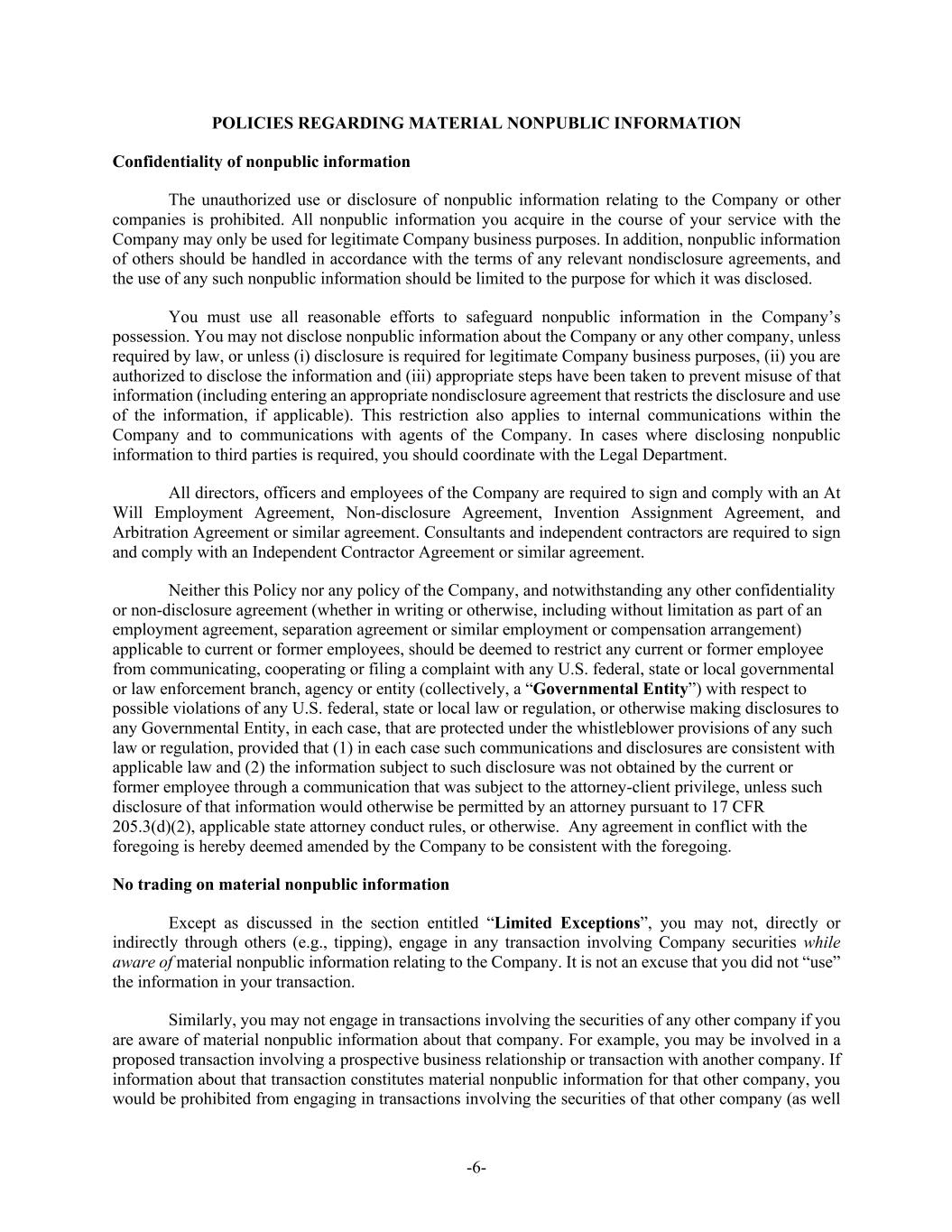 -6- POLICIES REGARDING MATERIAL NONPUBLIC INFORMATION Confidentiality of nonpublic information The unauthorized use or disclosure of nonpublic information relating to the Company or other companies is prohibited. All nonpublic information you acquire in the course of your service with the Company may only be used for legitimate Company business purposes. In addition, nonpublic information of others should be handled in accordance with the terms of any relevant nondisclosure agreements, and the use of any such nonpublic information should be limited to the purpose for which it was disclosed. You must use all reasonable efforts to safeguard nonpublic information in the Company’s possession. You may not disclose nonpublic information about the Company or any other company, unless required by law, or unless (i) disclosure is required for legitimate Company business purposes, (ii) you are authorized to disclose the information and (iii) appropriate steps have been taken to prevent misuse of that information (including entering an appropriate nondisclosure agreement that restricts the disclosure and use of the information, if applicable). This restriction also applies to internal communications within the Company and to communications with agents of the Company. In cases where disclosing nonpublic information to third parties is required, you should coordinate with the Legal Department. All directors, officers and employees of the Company are required to sign and comply with an At Will Employment Agreement, Non-disclosure Agreement, Invention Assignment Agreement, and Arbitration Agreement or similar agreement. Consultants and independent contractors are required to sign and comply with an Independent Contractor Agreement or similar agreement. Neither this Policy nor any policy of the Company, and notwithstanding any other confidentiality or non-disclosure agreement (whether in writing or otherwise, including without limitation as part of an employment agreement, separation agreement or similar employment or compensation arrangement) applicable to current or former employees, should be deemed to restrict any current or former employee from communicating, cooperating or filing a complaint with any U.S. federal, state or local governmental or law enforcement branch, agency or entity (collectively, a “Governmental Entity”) with respect to possible violations of any U.S. federal, state or local law or regulation, or otherwise making disclosures to any Governmental Entity, in each case, that are protected under the whistleblower provisions of any such law or regulation, provided that (1) in each case such communications and disclosures are consistent with applicable law and (2) the information subject to such disclosure was not obtained by the current or former employee through a communication that was subject to the attorney-client privilege, unless such disclosure of that information would otherwise be permitted by an attorney pursuant to 17 CFR 205.3(d)(2), applicable state attorney conduct rules, or otherwise. Any agreement in conflict with the foregoing is hereby deemed amended by the Company to be consistent with the foregoing. No trading on material nonpublic information Except as discussed in the section entitled “Limited Exceptions”, you may not, directly or indirectly through others (e.g., tipping), engage in any transaction involving Company securities while aware of material nonpublic information relating to the Company. It is not an excuse that you did not “use” the information in your transaction. Similarly, you may not engage in transactions involving the securities of any other company if you are aware of material nonpublic information about that company. For example, you may be involved in a proposed transaction involving a prospective business relationship or transaction with another company. If information about that transaction constitutes material nonpublic information for that other company, you would be prohibited from engaging in transactions involving the securities of that other company (as well