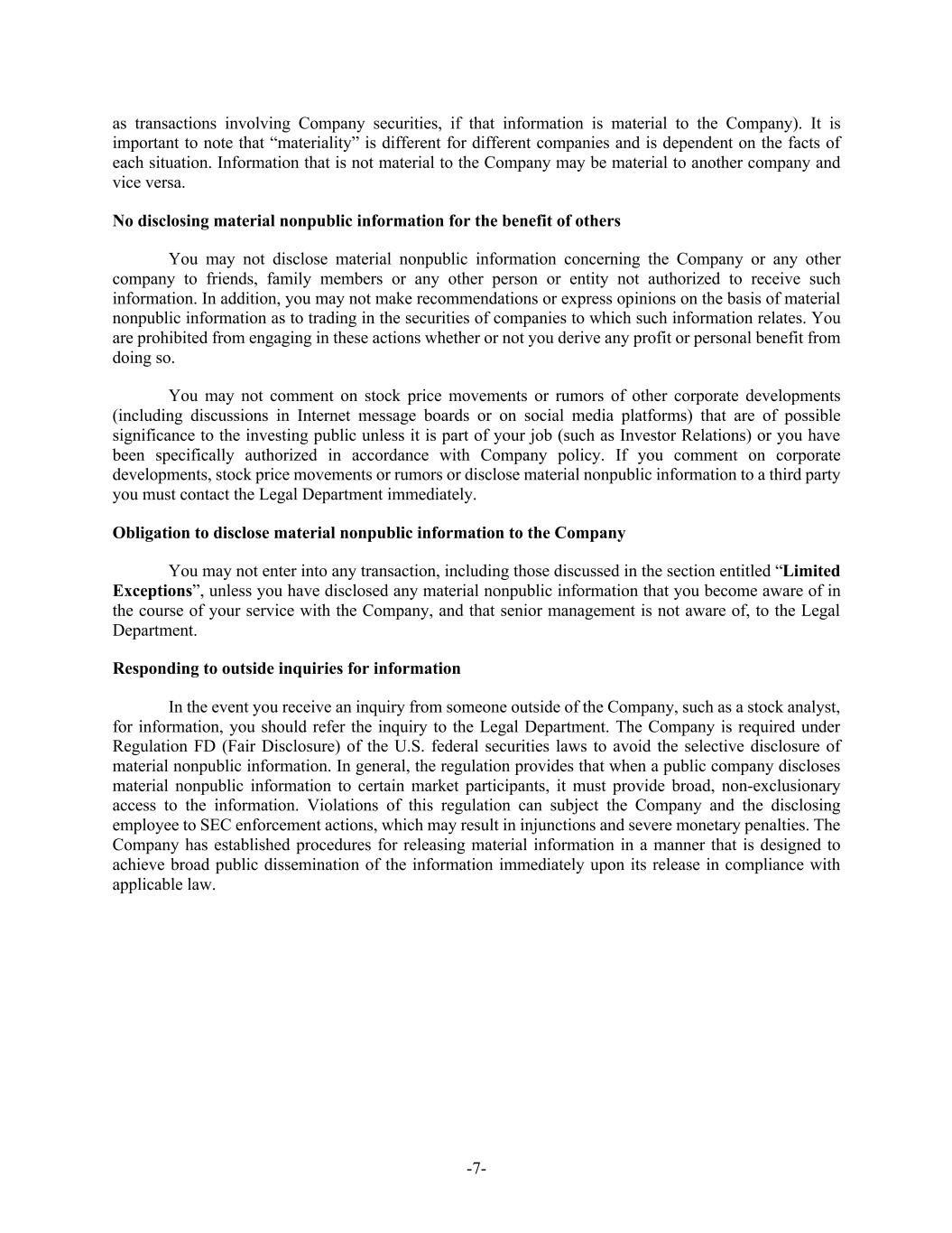 -7- as transactions involving Company securities, if that information is material to the Company). It is important to note that “materiality” is different for different companies and is dependent on the facts of each situation. Information that is not material to the Company may be material to another company and vice versa. No disclosing material nonpublic information for the benefit of others You may not disclose material nonpublic information concerning the Company or any other company to friends, family members or any other person or entity not authorized to receive such information. In addition, you may not make recommendations or express opinions on the basis of material nonpublic information as to trading in the securities of companies to which such information relates. You are prohibited from engaging in these actions whether or not you derive any profit or personal benefit from doing so. You may not comment on stock price movements or rumors of other corporate developments (including discussions in Internet message boards or on social media platforms) that are of possible significance to the investing public unless it is part of your job (such as Investor Relations) or you have been specifically authorized in accordance with Company policy. If you comment on corporate developments, stock price movements or rumors or disclose material nonpublic information to a third party you must contact the Legal Department immediately. Obligation to disclose material nonpublic information to the Company You may not enter into any transaction, including those discussed in the section entitled “Limited Exceptions”, unless you have disclosed any material nonpublic information that you become aware of in the course of your service with the Company, and that senior management is not aware of, to the Legal Department. Responding to outside inquiries for information In the event you receive an inquiry from someone outside of the Company, such as a stock analyst, for information, you should refer the inquiry to the Legal Department. The Company is required under Regulation FD (Fair Disclosure) of the U.S. federal securities laws to avoid the selective disclosure of material nonpublic information. In general, the regulation provides that when a public company discloses material nonpublic information to certain market participants, it must provide broad, non-exclusionary access to the information. Violations of this regulation can subject the Company and the disclosing employee to SEC enforcement actions, which may result in injunctions and severe monetary penalties. The Company has established procedures for releasing material information in a manner that is designed to achieve broad public dissemination of the information immediately upon its release in compliance with applicable law.