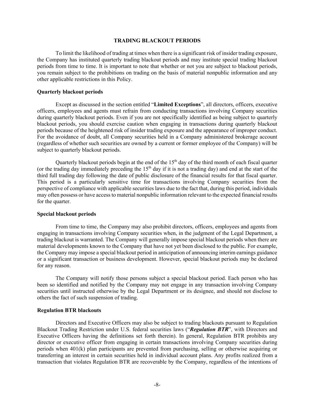 -8- TRADING BLACKOUT PERIODS To limit the likelihood of trading at times when there is a significant risk of insider trading exposure, the Company has instituted quarterly trading blackout periods and may institute special trading blackout periods from time to time. It is important to note that whether or not you are subject to blackout periods, you remain subject to the prohibitions on trading on the basis of material nonpublic information and any other applicable restrictions in this Policy. Quarterly blackout periods Except as discussed in the section entitled “Limited Exceptions”, all directors, officers, executive officers, employees and agents must refrain from conducting transactions involving Company securities during quarterly blackout periods. Even if you are not specifically identified as being subject to quarterly blackout periods, you should exercise caution when engaging in transactions during quarterly blackout periods because of the heightened risk of insider trading exposure and the appearance of improper conduct. For the avoidance of doubt, all Company securities held in a Company administered brokerage account (regardless of whether such securities are owned by a current or former employee of the Company) will be subject to quarterly blackout periods. Quarterly blackout periods begin at the end of the 15th day of the third month of each fiscal quarter (or the trading day immediately preceding the 15th day if it is not a trading day) and end at the start of the third full trading day following the date of public disclosure of the financial results for that fiscal quarter. This period is a particularly sensitive time for transactions involving Company securities from the perspective of compliance with applicable securities laws due to the fact that, during this period, individuals may often possess or have access to material nonpublic information relevant to the expected financial results for the quarter. Special blackout periods From time to time, the Company may also prohibit directors, officers, employees and agents from engaging in transactions involving Company securities when, in the judgment of the Legal Department, a trading blackout is warranted. The Company will generally impose special blackout periods when there are material developments known to the Company that have not yet been disclosed to the public. For example, the Company may impose a special blackout period in anticipation of announcing interim earnings guidance or a significant transaction or business development. However, special blackout periods may be declared for any reason. The Company will notify those persons subject a special blackout period. Each person who has been so identified and notified by the Company may not engage in any transaction involving Company securities until instructed otherwise by the Legal Department or its designee, and should not disclose to others the fact of such suspension of trading. Regulation BTR blackouts Directors and Executive Officers may also be subject to trading blackouts pursuant to Regulation Blackout Trading Restriction under U.S. federal securities laws (“Regulation BTR”, with Directors and Executive Officers having the definitions set forth therein). In general, Regulation BTR prohibits any director or executive officer from engaging in certain transactions involving Company securities during periods when 401(k) plan participants are prevented from purchasing, selling or otherwise acquiring or transferring an interest in certain securities held in individual account plans. Any profits realized from a transaction that violates Regulation BTR are recoverable by the Company, regardless of the intentions of