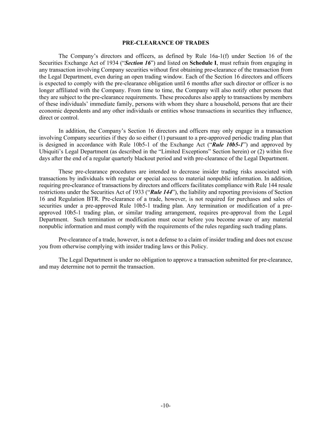 -10- PRE-CLEARANCE OF TRADES The Company’s directors and officers, as defined by Rule 16a-1(f) under Section 16 of the Securities Exchange Act of 1934 (“Section 16”) and listed on Schedule I, must refrain from engaging in any transaction involving Company securities without first obtaining pre-clearance of the transaction from the Legal Department, even during an open trading window. Each of the Section 16 directors and officers is expected to comply with the pre-clearance obligation until 6 months after such director or officer is no longer affiliated with the Company. From time to time, the Company will also notify other persons that they are subject to the pre-clearance requirements. These procedures also apply to transactions by members of these individuals’ immediate family, persons with whom they share a household, persons that are their economic dependents and any other individuals or entities whose transactions in securities they influence, direct or control. In addition, the Company’s Section 16 directors and officers may only engage in a transaction involving Company securities if they do so either (1) pursuant to a pre-approved periodic trading plan that is designed in accordance with Rule 10b5-1 of the Exchange Act (“Rule 10b5-1”) and approved by Ubiquiti’s Legal Department (as described in the “Limited Exceptions” Section herein) or (2) within five days after the end of a regular quarterly blackout period and with pre-clearance of the Legal Department. These pre-clearance procedures are intended to decrease insider trading risks associated with transactions by individuals with regular or special access to material nonpublic information. In addition, requiring pre-clearance of transactions by directors and officers facilitates compliance with Rule 144 resale restrictions under the Securities Act of 1933 (“Rule 144”), the liability and reporting provisions of Section 16 and Regulation BTR. Pre-clearance of a trade, however, is not required for purchases and sales of securities under a pre-approved Rule 10b5-1 trading plan. Any termination or modification of a pre- approved 10b5-1 trading plan, or similar trading arrangement, requires pre-approval from the Legal Department. Such termination or modification must occur before you become aware of any material nonpublic information and must comply with the requirements of the rules regarding such trading plans. Pre-clearance of a trade, however, is not a defense to a claim of insider trading and does not excuse you from otherwise complying with insider trading laws or this Policy. The Legal Department is under no obligation to approve a transaction submitted for pre-clearance, and may determine not to permit the transaction.