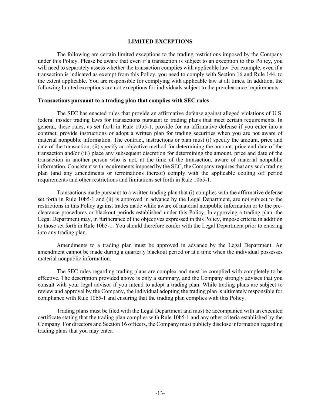 -13- LIMITED EXCEPTIONS The following are certain limited exceptions to the trading restrictions imposed by the Company under this Policy. Please be aware that even if a transaction is subject to an exception to this Policy, you will need to separately assess whether the transaction complies with applicable law. For example, even if a transaction is indicated as exempt from this Policy, you need to comply with Section 16 and Rule 144, to the extent applicable. You are responsible for complying with applicable law at all times. In addition, the following limited exceptions are not exceptions for individuals subject to the pre-clearance requirements. Transactions pursuant to a trading plan that complies with SEC rules The SEC has enacted rules that provide an affirmative defense against alleged violations of U.S. federal insider trading laws for transactions pursuant to trading plans that meet certain requirements. In general, these rules, as set forth in Rule 10b5-1, provide for an affirmative defense if you enter into a contract, provide instructions or adopt a written plan for trading securities when you are not aware of material nonpublic information. The contract, instructions or plan must (i) specify the amount, price and date of the transaction, (ii) specify an objective method for determining the amount, price and date of the transaction and/or (iii) place any subsequent discretion for determining the amount, price and date of the transaction in another person who is not, at the time of the transaction, aware of material nonpublic information. Consistent with requirements imposed by the SEC, the Company requires that any such trading plan (and any amendments or terminations thereof) comply with the applicable cooling off period requirements and other restrictions and limitations set forth in Rule 10b5-1. Transactions made pursuant to a written trading plan that (i) complies with the affirmative defense set forth in Rule 10b5-1 and (ii) is approved in advance by the Legal Department, are not subject to the restrictions in this Policy against trades made while aware of material nonpublic information or to the pre- clearance procedures or blackout periods established under this Policy. In approving a trading plan, the Legal Department may, in furtherance of the objectives expressed in this Policy, impose criteria in addition to those set forth in Rule 10b5-1. You should therefore confer with the Legal Department prior to entering into any trading plan. Amendments to a trading plan must be approved in advance by the Legal Department. An amendment cannot be made during a quarterly blackout period or at a time when the individual possesses material nonpublic information. The SEC rules regarding trading plans are complex and must be complied with completely to be effective. The description provided above is only a summary, and the Company strongly advises that you consult with your legal advisor if you intend to adopt a trading plan. While trading plans are subject to review and approval by the Company, the individual adopting the trading plan is ultimately responsible for compliance with Rule 10b5-1 and ensuring that the trading plan complies with this Policy. Trading plans must be filed with the Legal Department and must be accompanied with an executed certificate stating that the trading plan complies with Rule 10b5-1 and any other criteria established by the Company. For directors and Section 16 officers, the Company must publicly disclose information regarding trading plans that you may enter.
