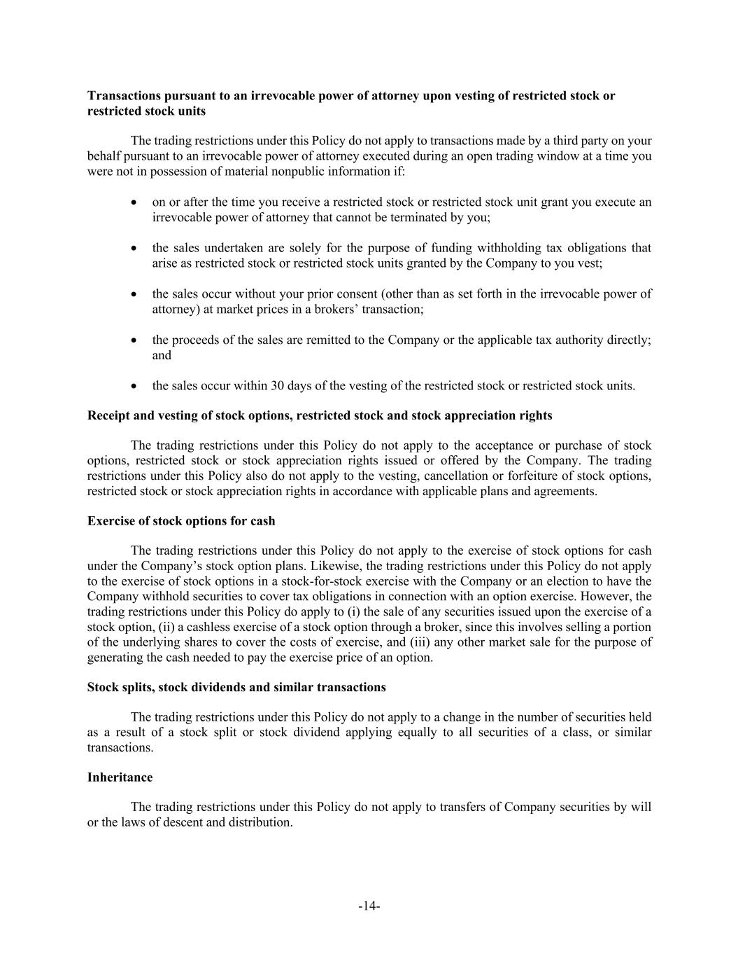 -14- Transactions pursuant to an irrevocable power of attorney upon vesting of restricted stock or restricted stock units The trading restrictions under this Policy do not apply to transactions made by a third party on your behalf pursuant to an irrevocable power of attorney executed during an open trading window at a time you were not in possession of material nonpublic information if: • on or after the time you receive a restricted stock or restricted stock unit grant you execute an irrevocable power of attorney that cannot be terminated by you; • the sales undertaken are solely for the purpose of funding withholding tax obligations that arise as restricted stock or restricted stock units granted by the Company to you vest; • the sales occur without your prior consent (other than as set forth in the irrevocable power of attorney) at market prices in a brokers’ transaction; • the proceeds of the sales are remitted to the Company or the applicable tax authority directly; and • the sales occur within 30 days of the vesting of the restricted stock or restricted stock units. Receipt and vesting of stock options, restricted stock and stock appreciation rights The trading restrictions under this Policy do not apply to the acceptance or purchase of stock options, restricted stock or stock appreciation rights issued or offered by the Company. The trading restrictions under this Policy also do not apply to the vesting, cancellation or forfeiture of stock options, restricted stock or stock appreciation rights in accordance with applicable plans and agreements. Exercise of stock options for cash The trading restrictions under this Policy do not apply to the exercise of stock options for cash under the Company’s stock option plans. Likewise, the trading restrictions under this Policy do not apply to the exercise of stock options in a stock-for-stock exercise with the Company or an election to have the Company withhold securities to cover tax obligations in connection with an option exercise. However, the trading restrictions under this Policy do apply to (i) the sale of any securities issued upon the exercise of a stock option, (ii) a cashless exercise of a stock option through a broker, since this involves selling a portion of the underlying shares to cover the costs of exercise, and (iii) any other market sale for the purpose of generating the cash needed to pay the exercise price of an option. Stock splits, stock dividends and similar transactions The trading restrictions under this Policy do not apply to a change in the number of securities held as a result of a stock split or stock dividend applying equally to all securities of a class, or similar transactions. Inheritance The trading restrictions under this Policy do not apply to transfers of Company securities by will or the laws of descent and distribution.