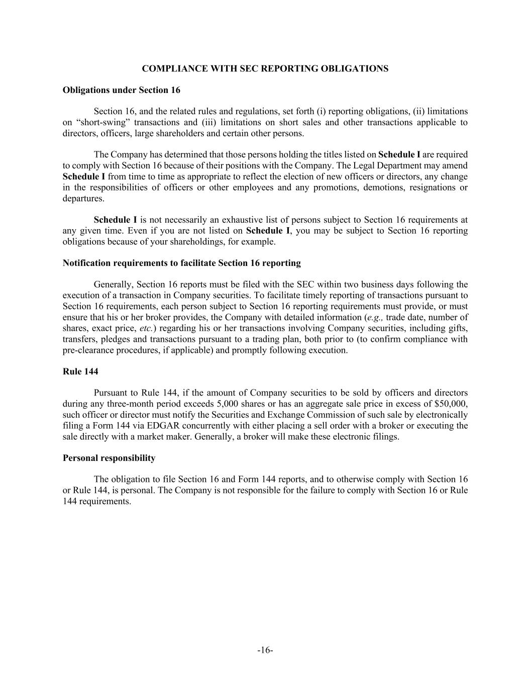 -16- COMPLIANCE WITH SEC REPORTING OBLIGATIONS Obligations under Section 16 Section 16, and the related rules and regulations, set forth (i) reporting obligations, (ii) limitations on “short-swing” transactions and (iii) limitations on short sales and other transactions applicable to directors, officers, large shareholders and certain other persons. The Company has determined that those persons holding the titles listed on Schedule I are required to comply with Section 16 because of their positions with the Company. The Legal Department may amend Schedule I from time to time as appropriate to reflect the election of new officers or directors, any change in the responsibilities of officers or other employees and any promotions, demotions, resignations or departures. Schedule I is not necessarily an exhaustive list of persons subject to Section 16 requirements at any given time. Even if you are not listed on Schedule I, you may be subject to Section 16 reporting obligations because of your shareholdings, for example. Notification requirements to facilitate Section 16 reporting Generally, Section 16 reports must be filed with the SEC within two business days following the execution of a transaction in Company securities. To facilitate timely reporting of transactions pursuant to Section 16 requirements, each person subject to Section 16 reporting requirements must provide, or must ensure that his or her broker provides, the Company with detailed information (e.g., trade date, number of shares, exact price, etc.) regarding his or her transactions involving Company securities, including gifts, transfers, pledges and transactions pursuant to a trading plan, both prior to (to confirm compliance with pre-clearance procedures, if applicable) and promptly following execution. Rule 144 Pursuant to Rule 144, if the amount of Company securities to be sold by officers and directors during any three-month period exceeds 5,000 shares or has an aggregate sale price in excess of $50,000, such officer or director must notify the Securities and Exchange Commission of such sale by electronically filing a Form 144 via EDGAR concurrently with either placing a sell order with a broker or executing the sale directly with a market maker. Generally, a broker will make these electronic filings. Personal responsibility The obligation to file Section 16 and Form 144 reports, and to otherwise comply with Section 16 or Rule 144, is personal. The Company is not responsible for the failure to comply with Section 16 or Rule 144 requirements.
