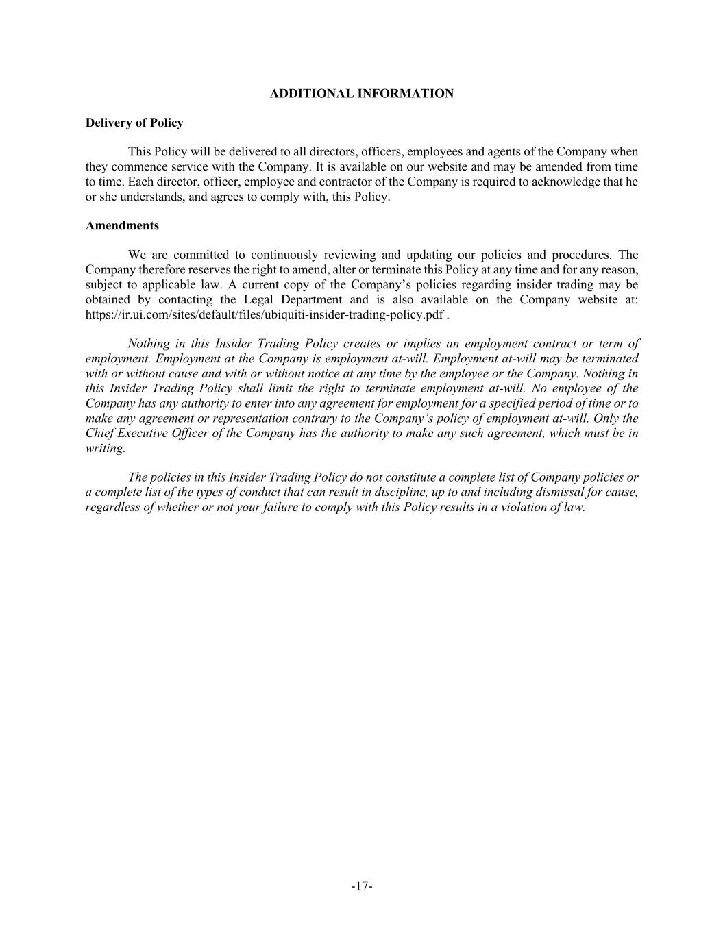-17- ADDITIONAL INFORMATION Delivery of Policy This Policy will be delivered to all directors, officers, employees and agents of the Company when they commence service with the Company. It is available on our website and may be amended from time to time. Each director, officer, employee and contractor of the Company is required to acknowledge that he or she understands, and agrees to comply with, this Policy. Amendments We are committed to continuously reviewing and updating our policies and procedures. The Company therefore reserves the right to amend, alter or terminate this Policy at any time and for any reason, subject to applicable law. A current copy of the Company’s policies regarding insider trading may be obtained by contacting the Legal Department and is also available on the Company website at: https://ir.ui.com/sites/default/files/ubiquiti-insider-trading-policy.pdf . Nothing in this Insider Trading Policy creates or implies an employment contract or term of employment. Employment at the Company is employment at-will. Employment at-will may be terminated with or without cause and with or without notice at any time by the employee or the Company. Nothing in this Insider Trading Policy shall limit the right to terminate employment at-will. No employee of the Company has any authority to enter into any agreement for employment for a specified period of time or to make any agreement or representation contrary to the Company’s policy of employment at-will. Only the Chief Executive Officer of the Company has the authority to make any such agreement, which must be in writing. The policies in this Insider Trading Policy do not constitute a complete list of Company policies or a complete list of the types of conduct that can result in discipline, up to and including dismissal for cause, regardless of whether or not your failure to comply with this Policy results in a violation of law.