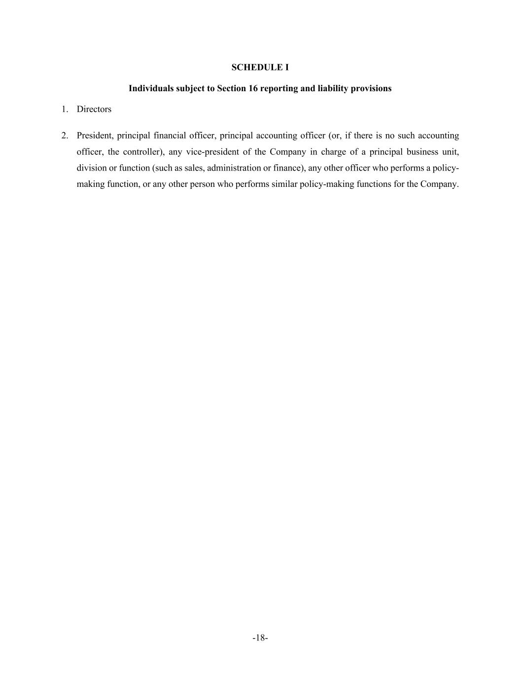 -18- SCHEDULE I Individuals subject to Section 16 reporting and liability provisions 1. Directors 2. President, principal financial officer, principal accounting officer (or, if there is no such accounting officer, the controller), any vice-president of the Company in charge of a principal business unit, division or function (such as sales, administration or finance), any other officer who performs a policy- making function, or any other person who performs similar policy-making functions for the Company.