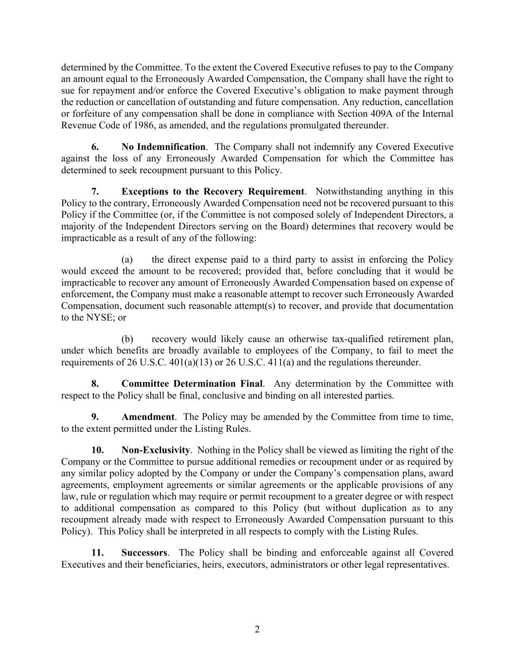 2 determined by the Committee. To the extent the Covered Executive refuses to pay to the Company an amount equal to the Erroneously Awarded Compensation, the Company shall have the right to sue for repayment and/or enforce the Covered Executive’s obligation to make payment through the reduction or cancellation of outstanding and future compensation. Any reduction, cancellation or forfeiture of any compensation shall be done in compliance with Section 409A of the Internal Revenue Code of 1986, as amended, and the regulations promulgated thereunder. 6. No Indemnification. The Company shall not indemnify any Covered Executive against the loss of any Erroneously Awarded Compensation for which the Committee has determined to seek recoupment pursuant to this Policy. 7. Exceptions to the Recovery Requirement. Notwithstanding anything in this Policy to the contrary, Erroneously Awarded Compensation need not be recovered pursuant to this Policy if the Committee (or, if the Committee is not composed solely of Independent Directors, a majority of the Independent Directors serving on the Board) determines that recovery would be impracticable as a result of any of the following: (a) the direct expense paid to a third party to assist in enforcing the Policy would exceed the amount to be recovered; provided that, before concluding that it would be impracticable to recover any amount of Erroneously Awarded Compensation based on expense of enforcement, the Company must make a reasonable attempt to recover such Erroneously Awarded Compensation, document such reasonable attempt(s) to recover, and provide that documentation to the NYSE; or (b) recovery would likely cause an otherwise tax-qualified retirement plan, under which benefits are broadly available to employees of the Company, to fail to meet the requirements of 26 U.S.C. 401(a)(13) or 26 U.S.C. 411(a) and the regulations thereunder. 8. Committee Determination Final. Any determination by the Committee with respect to the Policy shall be final, conclusive and binding on all interested parties. 9. Amendment. The Policy may be amended by the Committee from time to time, to the extent permitted under the Listing Rules. 10. Non-Exclusivity. Nothing in the Policy shall be viewed as limiting the right of the Company or the Committee to pursue additional remedies or recoupment under or as required by any similar policy adopted by the Company or under the Company’s compensation plans, award agreements, employment agreements or similar agreements or the applicable provisions of any law, rule or regulation which may require or permit recoupment to a greater degree or with respect to additional compensation as compared to this Policy (but without duplication as to any recoupment already made with respect to Erroneously Awarded Compensation pursuant to this Policy). This Policy shall be interpreted in all respects to comply with the Listing Rules. 11. Successors. The Policy shall be binding and enforceable against all Covered Executives and their beneficiaries, heirs, executors, administrators or other legal representatives.