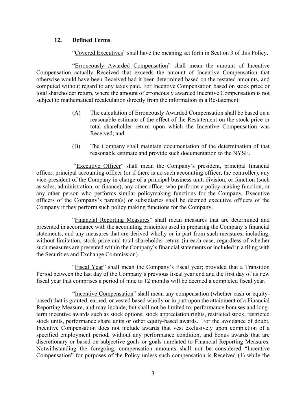 3 12. Defined Terms. “Covered Executives” shall have the meaning set forth in Section 3 of this Policy. “Erroneously Awarded Compensation” shall mean the amount of Incentive Compensation actually Received that exceeds the amount of Incentive Compensation that otherwise would have been Received had it been determined based on the restated amounts, and computed without regard to any taxes paid. For Incentive Compensation based on stock price or total shareholder return, where the amount of erroneously awarded Incentive Compensation is not subject to mathematical recalculation directly from the information in a Restatement: (A) The calculation of Erroneously Awarded Compensation shall be based on a reasonable estimate of the effect of the Restatement on the stock price or total shareholder return upon which the Incentive Compensation was Received; and (B) The Company shall maintain documentation of the determination of that reasonable estimate and provide such documentation to the NYSE. “Executive Officer” shall mean the Company’s president, principal financial officer, principal accounting officer (or if there is no such accounting officer, the controller), any vice-president of the Company in charge of a principal business unit, division, or function (such as sales, administration, or finance), any other officer who performs a policy-making function, or any other person who performs similar policymaking functions for the Company. Executive officers of the Company’s parent(s) or subsidiaries shall be deemed executive officers of the Company if they perform such policy making functions for the Company. “Financial Reporting Measures” shall mean measures that are determined and presented in accordance with the accounting principles used in preparing the Company’s financial statements, and any measures that are derived wholly or in part from such measures, including, without limitation, stock price and total shareholder return (in each case, regardless of whether such measures are presented within the Company’s financial statements or included in a filing with the Securities and Exchange Commission). “Fiscal Year” shall mean the Company’s fiscal year; provided that a Transition Period between the last day of the Company’s previous fiscal year end and the first day of its new fiscal year that comprises a period of nine to 12 months will be deemed a completed fiscal year. “Incentive Compensation” shall mean any compensation (whether cash or equity- based) that is granted, earned, or vested based wholly or in part upon the attainment of a Financial Reporting Measure, and may include, but shall not be limited to, performance bonuses and long- term incentive awards such as stock options, stock appreciation rights, restricted stock, restricted stock units, performance share units or other equity-based awards. For the avoidance of doubt, Incentive Compensation does not include awards that vest exclusively upon completion of a specified employment period, without any performance condition, and bonus awards that are discretionary or based on subjective goals or goals unrelated to Financial Reporting Measures. Notwithstanding the foregoing, compensation amounts shall not be considered “Incentive Compensation” for purposes of the Policy unless such compensation is Received (1) while the