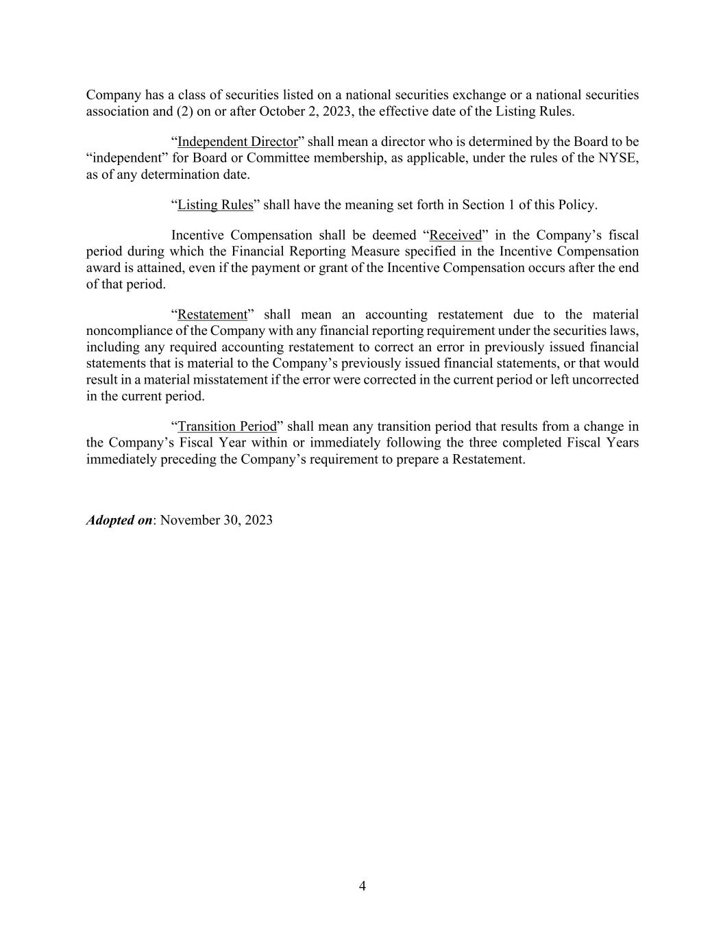 4 Company has a class of securities listed on a national securities exchange or a national securities association and (2) on or after October 2, 2023, the effective date of the Listing Rules. “Independent Director” shall mean a director who is determined by the Board to be “independent” for Board or Committee membership, as applicable, under the rules of the NYSE, as of any determination date. “Listing Rules” shall have the meaning set forth in Section 1 of this Policy. Incentive Compensation shall be deemed “Received” in the Company’s fiscal period during which the Financial Reporting Measure specified in the Incentive Compensation award is attained, even if the payment or grant of the Incentive Compensation occurs after the end of that period. “Restatement” shall mean an accounting restatement due to the material noncompliance of the Company with any financial reporting requirement under the securities laws, including any required accounting restatement to correct an error in previously issued financial statements that is material to the Company’s previously issued financial statements, or that would result in a material misstatement if the error were corrected in the current period or left uncorrected in the current period. “Transition Period” shall mean any transition period that results from a change in the Company’s Fiscal Year within or immediately following the three completed Fiscal Years immediately preceding the Company’s requirement to prepare a Restatement. Adopted on: November 30, 2023