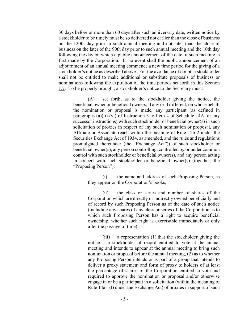 - 5 - 30 days before or more than 60 days after such anniversary date, written notice by a stockholder to be timely must be so delivered not earlier than the close of business on the 120th day prior to such annual meeting and not later than the close of business on the later of the 90th day prior to such annual meeting and the 10th day following the day on which a public announcement of the date of such meeting is first made by the Corporation. In no event shall the public announcement of an adjournment of an annual meeting commence a new time period for the giving of a stockholder’s notice as described above. For the avoidance of doubt, a stockholder shall not be entitled to make additional or substitute proposals of business or nominations following the expiration of the time periods set forth in this Section 1.7. To be properly brought, a stockholder’s notice to the Secretary must: (A) set forth, as to the stockholder giving the notice, the beneficial owner or beneficial owners, if any or if different, on whose behalf the nomination or proposal is made, any participant (as defined in paragraphs (a)(ii)-(vi) of Instruction 3 to Item 4 of Schedule 14A, or any successor instructions) with such stockholder or beneficial owner(s) in such solicitation of proxies in respect of any such nomination or proposal, any Affiliate or Associate (each within the meaning of Rule 12b-2 under the Securities Exchange Act of 1934, as amended, and the rules and regulations promulgated thereunder (the “Exchange Act”)) of such stockholder or beneficial owner(s), any person controlling, controlled by or under common control with such stockholder or beneficial owner(s), and any person acting in concert with such stockholder or beneficial owner(s) (together, the “Proposing Person”): (i) the name and address of such Proposing Person, as they appear on the Corporation’s books; (ii) the class or series and number of shares of the Corporation which are directly or indirectly owned beneficially and of record by such Proposing Person as of the date of such notice (including any shares of any class or series of the Corporation as to which such Proposing Person has a right to acquire beneficial ownership, whether such right is exercisable immediately or only after the passage of time); (iii) a representation (1) that the stockholder giving the notice is a stockholder of record entitled to vote at the annual meeting and intends to appear at the annual meeting to bring such nomination or proposal before the annual meeting, (2) as to whether any Proposing Person intends or is part of a group that intends to deliver a proxy statement and form of proxy to holders of at least the percentage of shares of the Corporation entitled to vote and required to approve the nomination or proposal and/or otherwise engage in or be a participant in a solicitation (within the meaning of Rule 14a-1(l) under the Exchange Act) of proxies in support of such