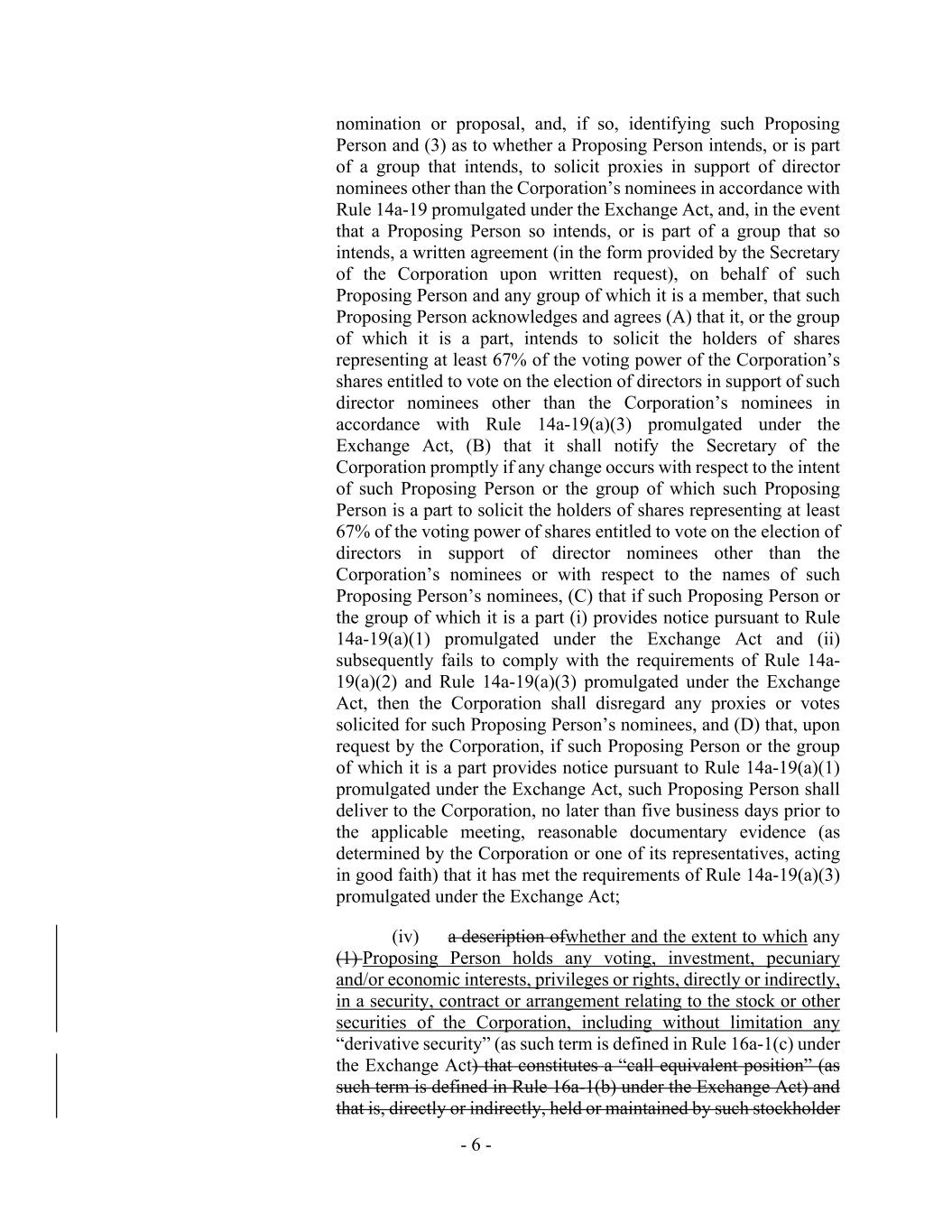 - 6 - nomination or proposal, and, if so, identifying such Proposing Person and (3) as to whether a Proposing Person intends, or is part of a group that intends, to solicit proxies in support of director nominees other than the Corporation’s nominees in accordance with Rule 14a-19 promulgated under the Exchange Act, and, in the event that a Proposing Person so intends, or is part of a group that so intends, a written agreement (in the form provided by the Secretary of the Corporation upon written request), on behalf of such Proposing Person and any group of which it is a member, that such Proposing Person acknowledges and agrees (A) that it, or the group of which it is a part, intends to solicit the holders of shares representing at least 67% of the voting power of the Corporation’s shares entitled to vote on the election of directors in support of such director nominees other than the Corporation’s nominees in accordance with Rule 14a-19(a)(3) promulgated under the Exchange Act, (B) that it shall notify the Secretary of the Corporation promptly if any change occurs with respect to the intent of such Proposing Person or the group of which such Proposing Person is a part to solicit the holders of shares representing at least 67% of the voting power of shares entitled to vote on the election of directors in support of director nominees other than the Corporation’s nominees or with respect to the names of such Proposing Person’s nominees, (C) that if such Proposing Person or the group of which it is a part (i) provides notice pursuant to Rule 14a-19(a)(1) promulgated under the Exchange Act and (ii) subsequently fails to comply with the requirements of Rule 14a- 19(a)(2) and Rule 14a-19(a)(3) promulgated under the Exchange Act, then the Corporation shall disregard any proxies or votes solicited for such Proposing Person’s nominees, and (D) that, upon request by the Corporation, if such Proposing Person or the group of which it is a part provides notice pursuant to Rule 14a-19(a)(1) promulgated under the Exchange Act, such Proposing Person shall deliver to the Corporation, no later than five business days prior to the applicable meeting, reasonable documentary evidence (as determined by the Corporation or one of its representatives, acting in good faith) that it has met the requirements of Rule 14a-19(a)(3) promulgated under the Exchange Act; (iv) a description ofwhether and the extent to which any (1) Proposing Person holds any voting, investment, pecuniary and/or economic interests, privileges or rights, directly or indirectly, in a security, contract or arrangement relating to the stock or other securities of the Corporation, including without limitation any “derivative security” (as such term is defined in Rule 16a-1(c) under the Exchange Act) that constitutes a “call equivalent position” (as such term is defined in Rule 16a-1(b) under the Exchange Act) and that is, directly or indirectly, held or maintained by such stockholder