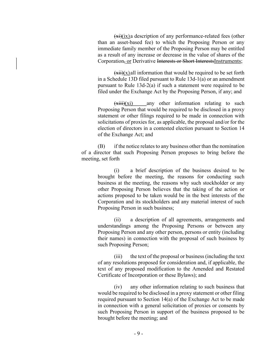 - 9 - (xi)(ix) a description of any performance-related fees (other than an asset-based fee) to which the Proposing Person or any immediate family member of the Proposing Person may be entitled as a result of any increase or decrease in the value of shares of the Corporation, or Derivative Interests or Short InterestsInstruments; (xii)(x) all information that would be required to be set forth in a Schedule 13D filed pursuant to Rule 13d-1(a) or an amendment pursuant to Rule 13d-2(a) if such a statement were required to be filed under the Exchange Act by the Proposing Person, if any; and (xiii)(xi) any other information relating to such Proposing Person that would be required to be disclosed in a proxy statement or other filings required to be made in connection with solicitations of proxies for, as applicable, the proposal and/or for the election of directors in a contested election pursuant to Section 14 of the Exchange Act; and (B) if the notice relates to any business other than the nomination of a director that such Proposing Person proposes to bring before the meeting, set forth (i) a brief description of the business desired to be brought before the meeting, the reasons for conducting such business at the meeting, the reasons why such stockholder or any other Proposing Person believes that the taking of the action or actions proposed to be taken would be in the best interests of the Corporation and its stockholders and any material interest of such Proposing Person in such business; (ii) a description of all agreements, arrangements and understandings among the Proposing Persons or between any Proposing Person and any other person, persons or entity (including their names) in connection with the proposal of such business by such Proposing Person; (iii) the text of the proposal or business (including the text of any resolutions proposed for consideration and, if applicable, the text of any proposed modification to the Amended and Restated Certificate of Incorporation or these Bylaws); and (iv) any other information relating to such business that would be required to be disclosed in a proxy statement or other filing required pursuant to Section 14(a) of the Exchange Act to be made in connection with a general solicitation of proxies or consents by such Proposing Person in support of the business proposed to be brought before the meeting; and