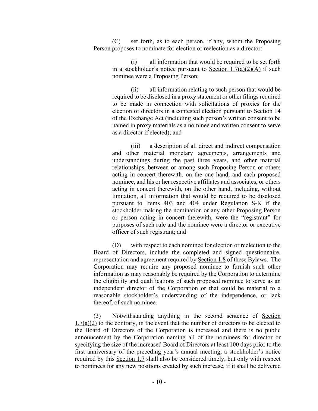 - 10 - (C) set forth, as to each person, if any, whom the Proposing Person proposes to nominate for election or reelection as a director: (i) all information that would be required to be set forth in a stockholder’s notice pursuant to Section 1.7(a)(2)(A) if such nominee were a Proposing Person; (ii) all information relating to such person that would be required to be disclosed in a proxy statement or other filings required to be made in connection with solicitations of proxies for the election of directors in a contested election pursuant to Section 14 of the Exchange Act (including such person’s written consent to be named in proxy materials as a nominee and written consent to serve as a director if elected); and (iii) a description of all direct and indirect compensation and other material monetary agreements, arrangements and understandings during the past three years, and other material relationships, between or among such Proposing Person or others acting in concert therewith, on the one hand, and each proposed nominee, and his or her respective affiliates and associates, or others acting in concert therewith, on the other hand, including, without limitation, all information that would be required to be disclosed pursuant to Items 403 and 404 under Regulation S-K if the stockholder making the nomination or any other Proposing Person or person acting in concert therewith, were the “registrant” for purposes of such rule and the nominee were a director or executive officer of such registrant; and (D) with respect to each nominee for election or reelection to the Board of Directors, include the completed and signed questionnaire, representation and agreement required by Section 1.8 of these Bylaws. The Corporation may require any proposed nominee to furnish such other information as may reasonably be required by the Corporation to determine the eligibility and qualifications of such proposed nominee to serve as an independent director of the Corporation or that could be material to a reasonable stockholder’s understanding of the independence, or lack thereof, of such nominee. (3) Notwithstanding anything in the second sentence of Section 1.7(a)(2) to the contrary, in the event that the number of directors to be elected to the Board of Directors of the Corporation is increased and there is no public announcement by the Corporation naming all of the nominees for director or specifying the size of the increased Board of Directors at least 100 days prior to the first anniversary of the preceding year’s annual meeting, a stockholder’s notice required by this Section 1.7 shall also be considered timely, but only with respect to nominees for any new positions created by such increase, if it shall be delivered