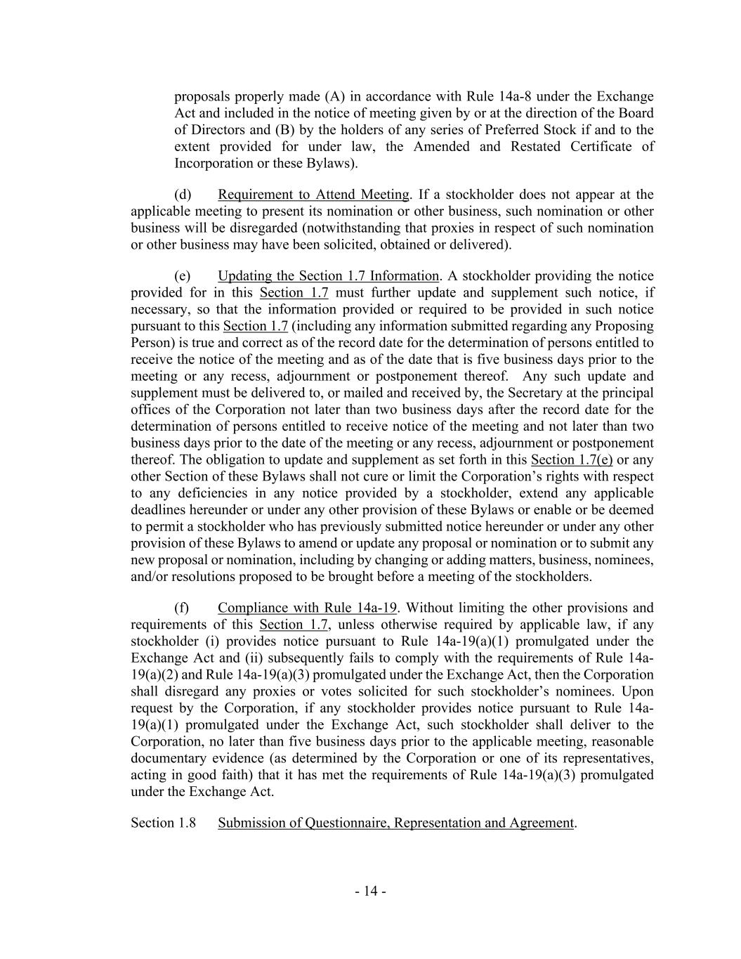 - 14 - proposals properly made (A) in accordance with Rule 14a-8 under the Exchange Act and included in the notice of meeting given by or at the direction of the Board of Directors and (B) by the holders of any series of Preferred Stock if and to the extent provided for under law, the Amended and Restated Certificate of Incorporation or these Bylaws). (d) Requirement to Attend Meeting. If a stockholder does not appear at the applicable meeting to present its nomination or other business, such nomination or other business will be disregarded (notwithstanding that proxies in respect of such nomination or other business may have been solicited, obtained or delivered). (e) Updating the Section 1.7 Information. A stockholder providing the notice provided for in this Section 1.7 must further update and supplement such notice, if necessary, so that the information provided or required to be provided in such notice pursuant to this Section 1.7 (including any information submitted regarding any Proposing Person) is true and correct as of the record date for the determination of persons entitled to receive the notice of the meeting and as of the date that is five business days prior to the meeting or any recess, adjournment or postponement thereof. Any such update and supplement must be delivered to, or mailed and received by, the Secretary at the principal offices of the Corporation not later than two business days after the record date for the determination of persons entitled to receive notice of the meeting and not later than two business days prior to the date of the meeting or any recess, adjournment or postponement thereof. The obligation to update and supplement as set forth in this Section 1.7(e) or any other Section of these Bylaws shall not cure or limit the Corporation’s rights with respect to any deficiencies in any notice provided by a stockholder, extend any applicable deadlines hereunder or under any other provision of these Bylaws or enable or be deemed to permit a stockholder who has previously submitted notice hereunder or under any other provision of these Bylaws to amend or update any proposal or nomination or to submit any new proposal or nomination, including by changing or adding matters, business, nominees, and/or resolutions proposed to be brought before a meeting of the stockholders. (f) Compliance with Rule 14a-19. Without limiting the other provisions and requirements of this Section 1.7, unless otherwise required by applicable law, if any stockholder (i) provides notice pursuant to Rule 14a-19(a)(1) promulgated under the Exchange Act and (ii) subsequently fails to comply with the requirements of Rule 14a- 19(a)(2) and Rule 14a-19(a)(3) promulgated under the Exchange Act, then the Corporation shall disregard any proxies or votes solicited for such stockholder’s nominees. Upon request by the Corporation, if any stockholder provides notice pursuant to Rule 14a- 19(a)(1) promulgated under the Exchange Act, such stockholder shall deliver to the Corporation, no later than five business days prior to the applicable meeting, reasonable documentary evidence (as determined by the Corporation or one of its representatives, acting in good faith) that it has met the requirements of Rule 14a-19(a)(3) promulgated under the Exchange Act. Section 1.8 Submission of Questionnaire, Representation and Agreement.